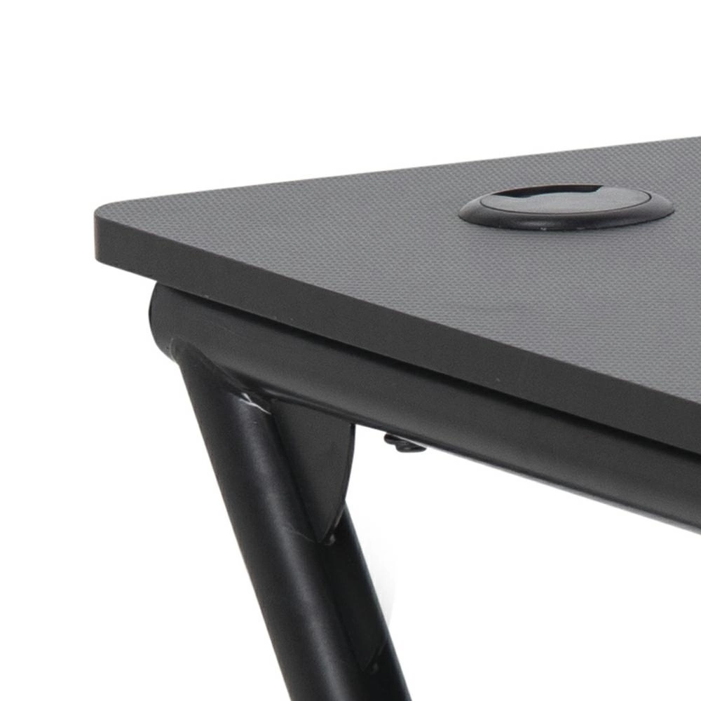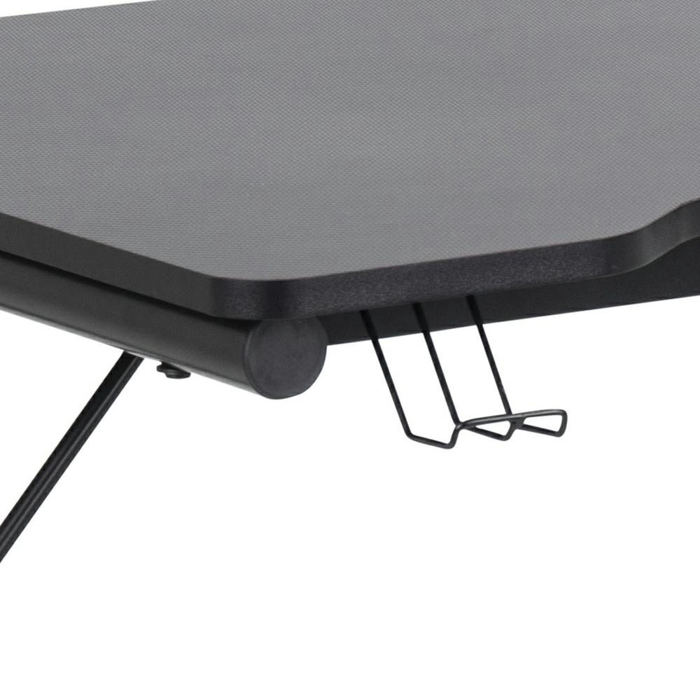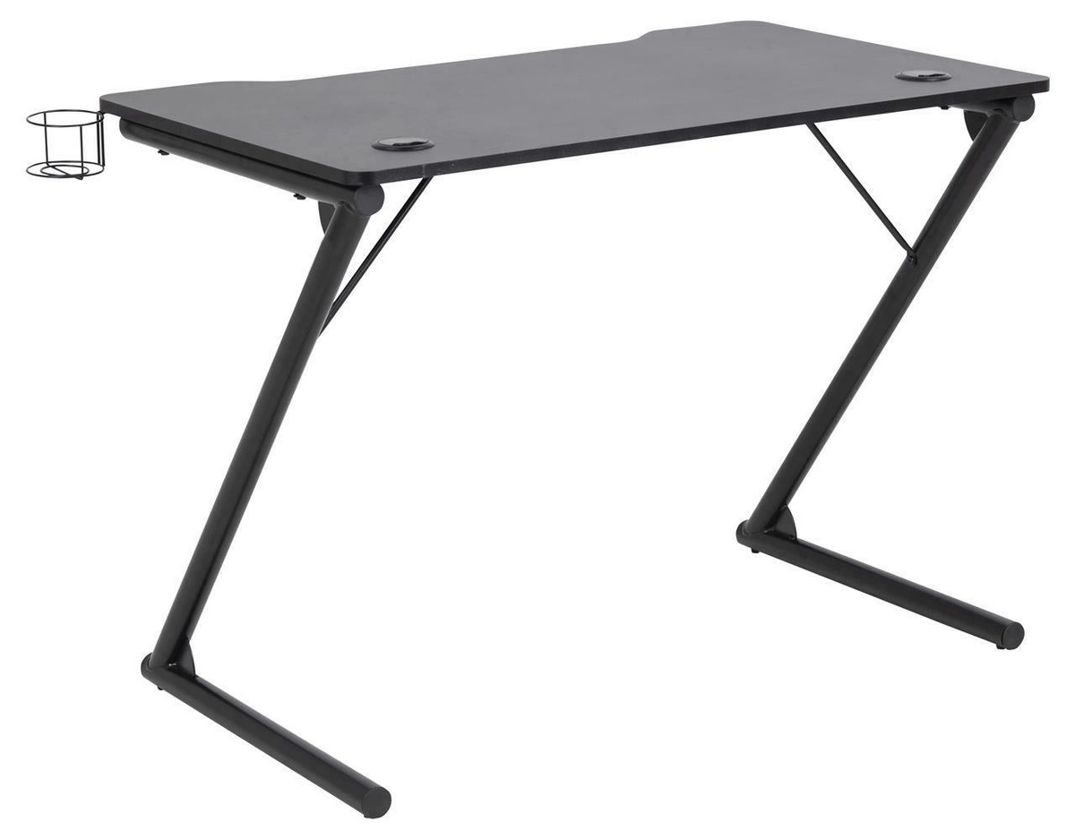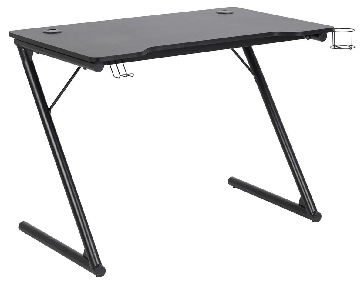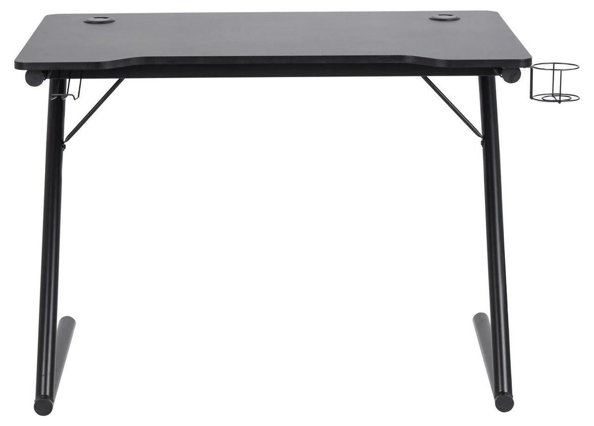 Biurko Trooper wykonane zostało z metalu malowanego proszkowo na kolor czarny oraz płyty MDF wykończonej laminatem w kolorze czarnym. Industrialny charakter i prostota wykonania sprawia, że biurko jest ponadczasowe i uniwersalne. Biurko dla graczy zostało zrobione z metalowej podstawy. Charakterystyczne nogi biurka mają kształt litery Z. Blat biurka to czarna płyta MDF. Nieregularny kształt blatu został dopasowany do osób spędzających przy biurku wiele czasu. Biurko wyposażone jest w wiele przydatnych udogodnień. Posiada ono dwa otwory na przewody, dzięki czemu przewody od komputera lub ładowarki telefonu będą wyglądać estetycznie. Biurko wyposażone jest również w haczyki oraz stojak na kubek kawy. Dzięki temu na pewno nie zalejemy laptopa lub książki napojem. Biurko wprowadzi surowy klimat oraz sprawdzi się w mniejszych pomieszczeniach dzięki swoim wymiarom. Waga biurka: 13,4 kg Maksymalna ilość szt. w kartonie: 1 Wymiary kartonu: 110 cm x 13 cm x 66,5 cmPodmiot odpowiedzialny za ten produkt na terenie UE