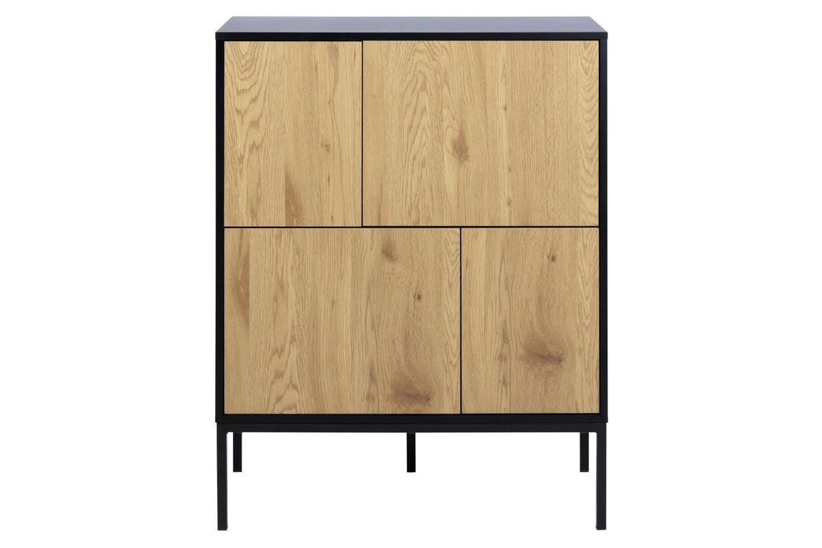 Komoda Seaford jest kolejnym meblem z industrialnej kolekcji Seaford. Komoda, złożona z czterech pojemnych szafek z drzwiczkami, została postawiona na 4 czarnych matowych nogach. Fronty komody zostały zrobione z MDF z okleiną o strukturze naturalnego dębu. Waga: 30 kg. Wymiary kartonu: 47cm x 89cm x 23cm