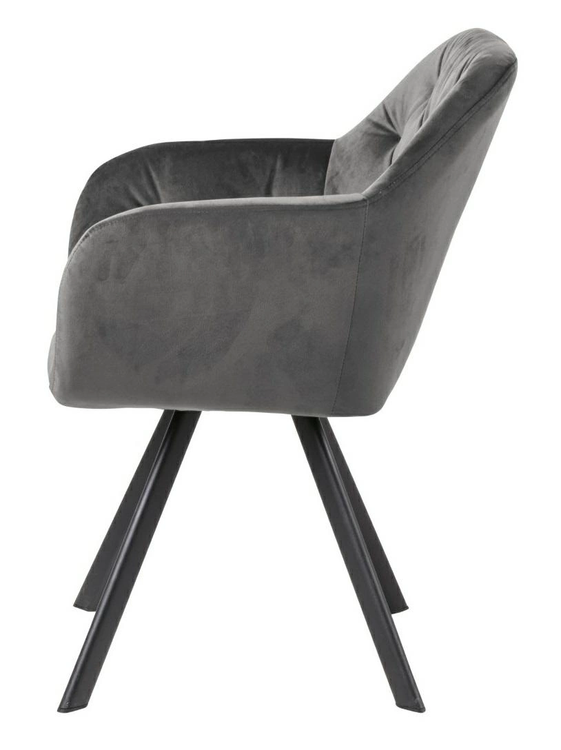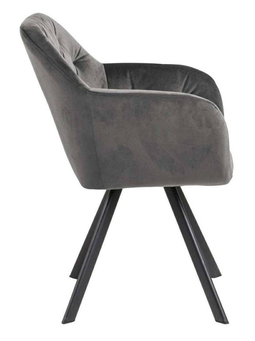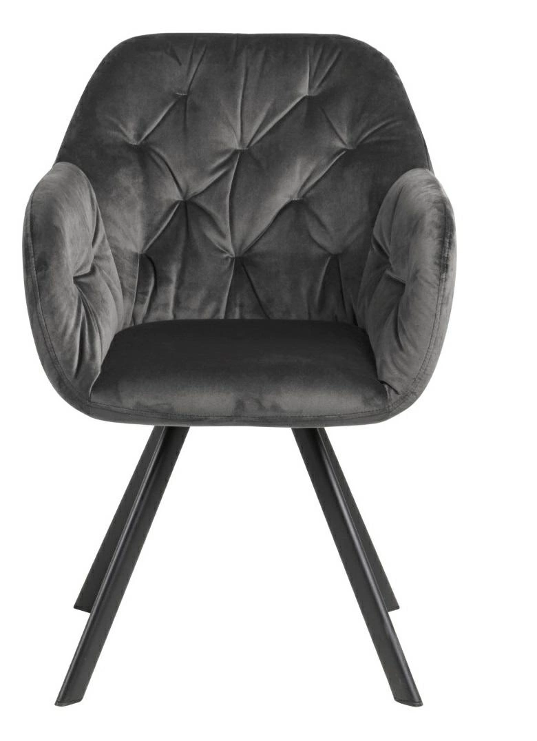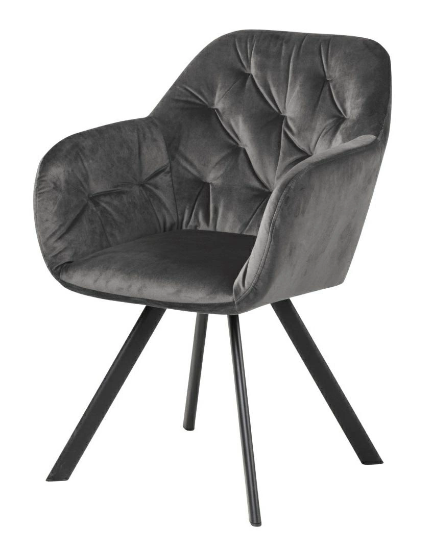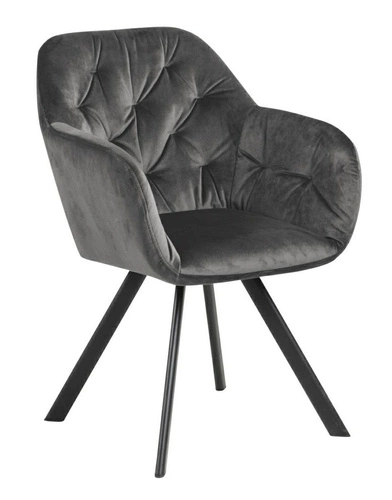 Krzesło Lola jest krzesłem tapicerowanym miękką welwetową tkaniną VIC fabric dark grey 28. Krzesło posiada idealnie wyprofilowane podłokietniki, które tworzą z siedziskiem i oparciem spójną całość. Oparcie krzesła zostało ozdobione pikowaniem, które dodaje mu stylu. Podstawą krzesła są malowane proszkowo na czarno metalowe nogi. Ciekawy kształt podstawy dodaje całości lekkości. Krzesło posiada funkcję "auto-return", która sprawia, że po skończonym użytkowaniu ruchome siedzisko wróci do właściwej pozycji. Maksymalne obciążenie: 120 kg. Waga Krzesła: 11,4 kg Wymiary kartonu: 61cm x 50,5cm x 58cm Ilość maksymalna szt. w kartonie: 1 Wysokość siedziska: 47,5 cm Szerokość siedziska: 40 cm Głębokość siedziska: 41 cm Wysokość podłokietników: 22 cmPodmiot odpowiedzialny za ten produkt na terenie UE