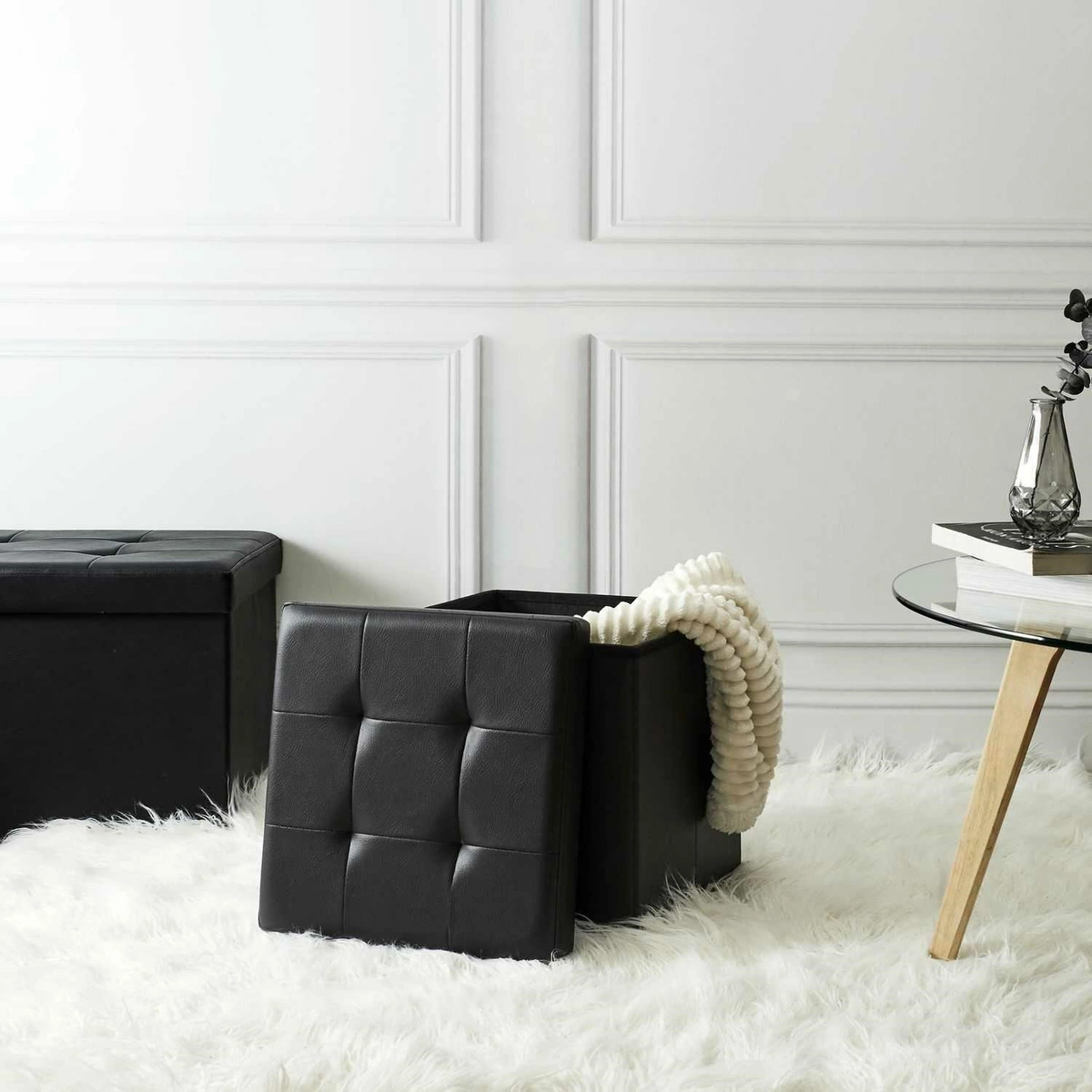 Pufa Intesi Vels to kolejny model bardzo modnej kolekcji składanych siedzisk. Ten nietuzinkowy projekt to pełnoprawna pufa, która doskonale sprawdzi się w roli dodatkowego siedziska w kąciku kawowym czy w przedpokoju, gdzie pomoże Ci wygodnie włożyć buty. Gruba pianka wysokoelastyczna, którą obito jej górną część, dba o wygodę użytkownika, zapewniając mu miękką i elastyczną powierzchnię. Element jest nie tylko wygodny, ale także wyśmienicie wygląda, co jest zasługą gustownych przeszyć i pikowania. Pufa będzie idealnym schowkiem do pokoju dziecka, dodatkowym miejscem do przechowywania w pokoju młodzieżowym. To nie tylko pojemnik na ubrania, zabawki czy poduszki. Pufa jest też wygodnym siedziskiem. Maksymalne obciążenie siedziska pufy to aż 110kg. Pufa została zrobiona z poliestru oraz eko skóry w kolorze czarnym. Max. ilość szt. w kartonie: 4 Wymiary kartonu: 37,2 x 6 x 37,2 cm