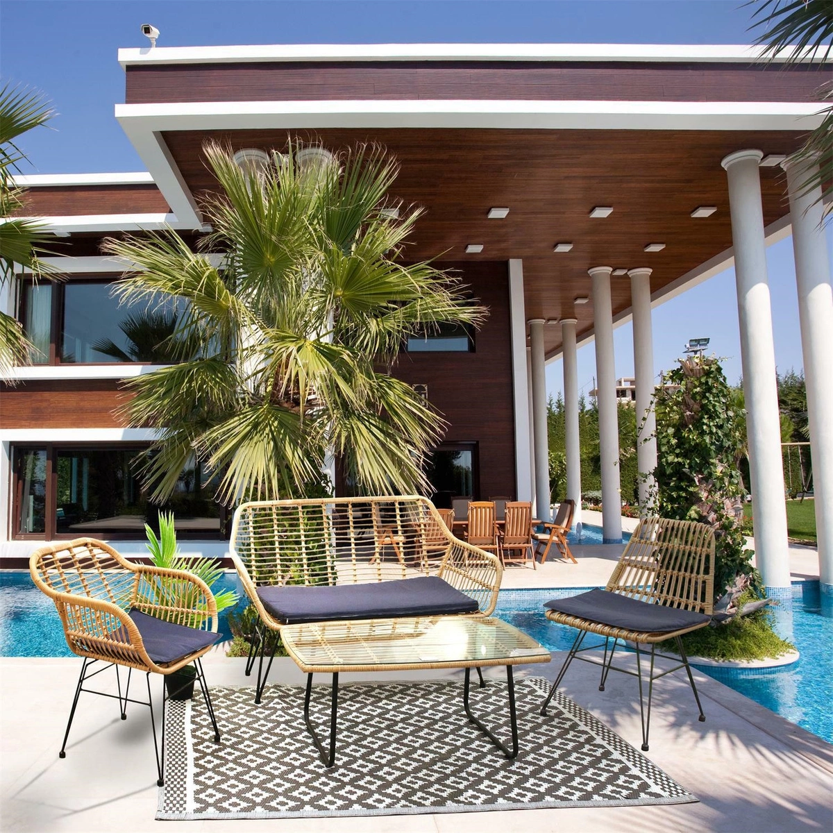 Blat stołu Surabaya wykonany jest ze szkła hartowanego oraz tworzywa sztucznego, który fantastycznie kontrastuje z metalowym stelażem oraz półką. Podstawę tworzą stalowe nóżki w kształcie płozy oraz w kolorze czarnym - użycie metody malowania proszkowo sprawia, że powierzchnia jest gładka i jednolita. Nóżki stolika zostały wyposażone w antypoślizgowe zakończenia. Stolik nadaje się do użytku wewnątrz i na zewnątrz. Waga: 9,7 kg Wymiary opakowania 48x59x80cm