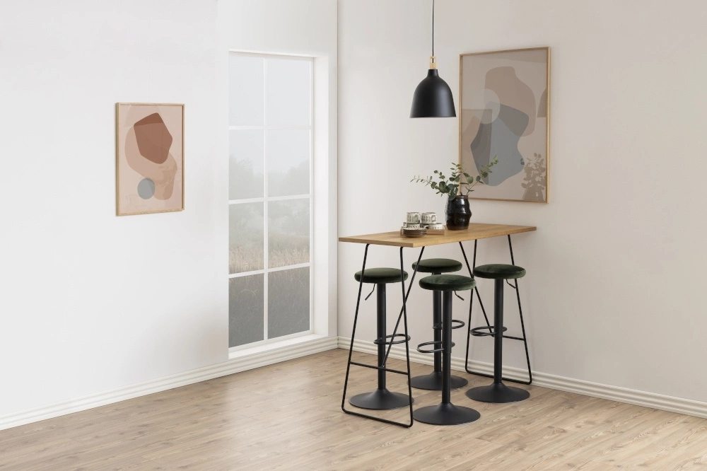 Stołek barowy Finch będzie idealnym siedziskiem przy kuchennej wyspie. Na metalowej, pomalowanej proszkowo na kolor czarny stopie, znajduje się siedzisko, które dla wygody obszyte zostało tkaniną VIC fabric forest zielony 68AC. Siedzisko wyposażono w mechanizm obrotowy oraz regulujący wysokość umożliwiający dopasowanie do postury użytkownika. Komfort z korzystania ze stołka barowego Finch dopełnia umiejscowiony na konstrukcji podstawy elegancki podnóżek. Maksymalne obciążenie stołka wynosi 120 kg Minimalna wysokość stołka 62cm, maksymalna wysokość: 82cm. Waga: 5,7 kg. Wymiary kartonu: 45cm x 38cm x 43cm Wysokość siedziska: 82 cm Szerokość siedziska: 33 cm Głęboko siedziska: 33 cmPodmiot odpowiedzialny za ten produkt na terenie UE