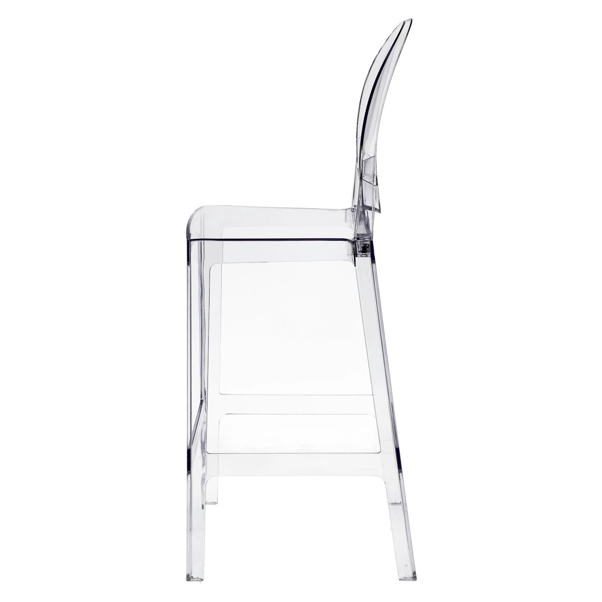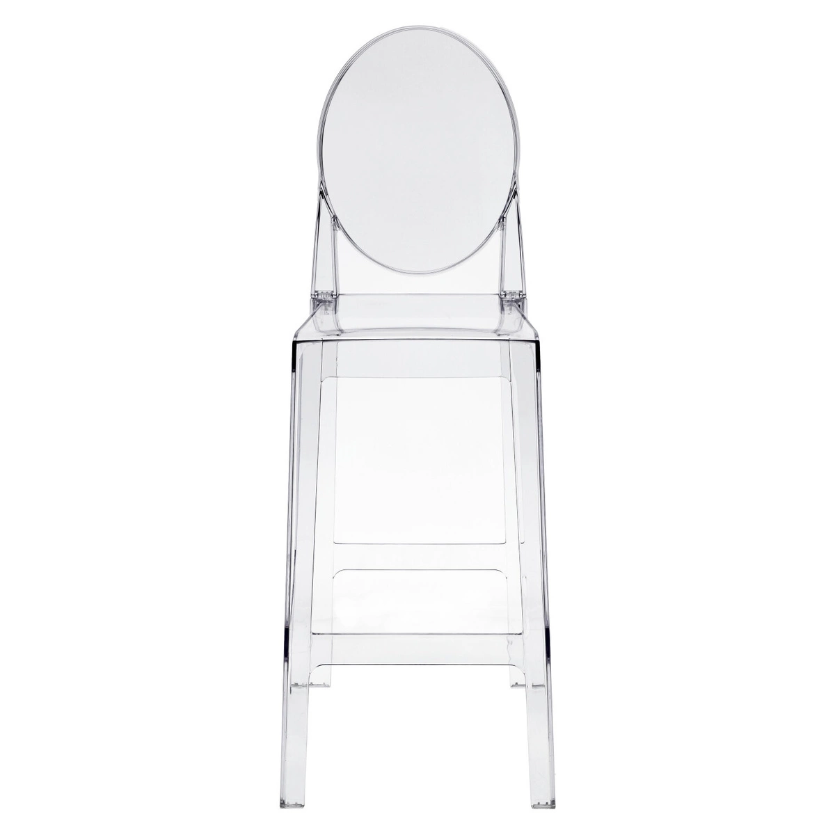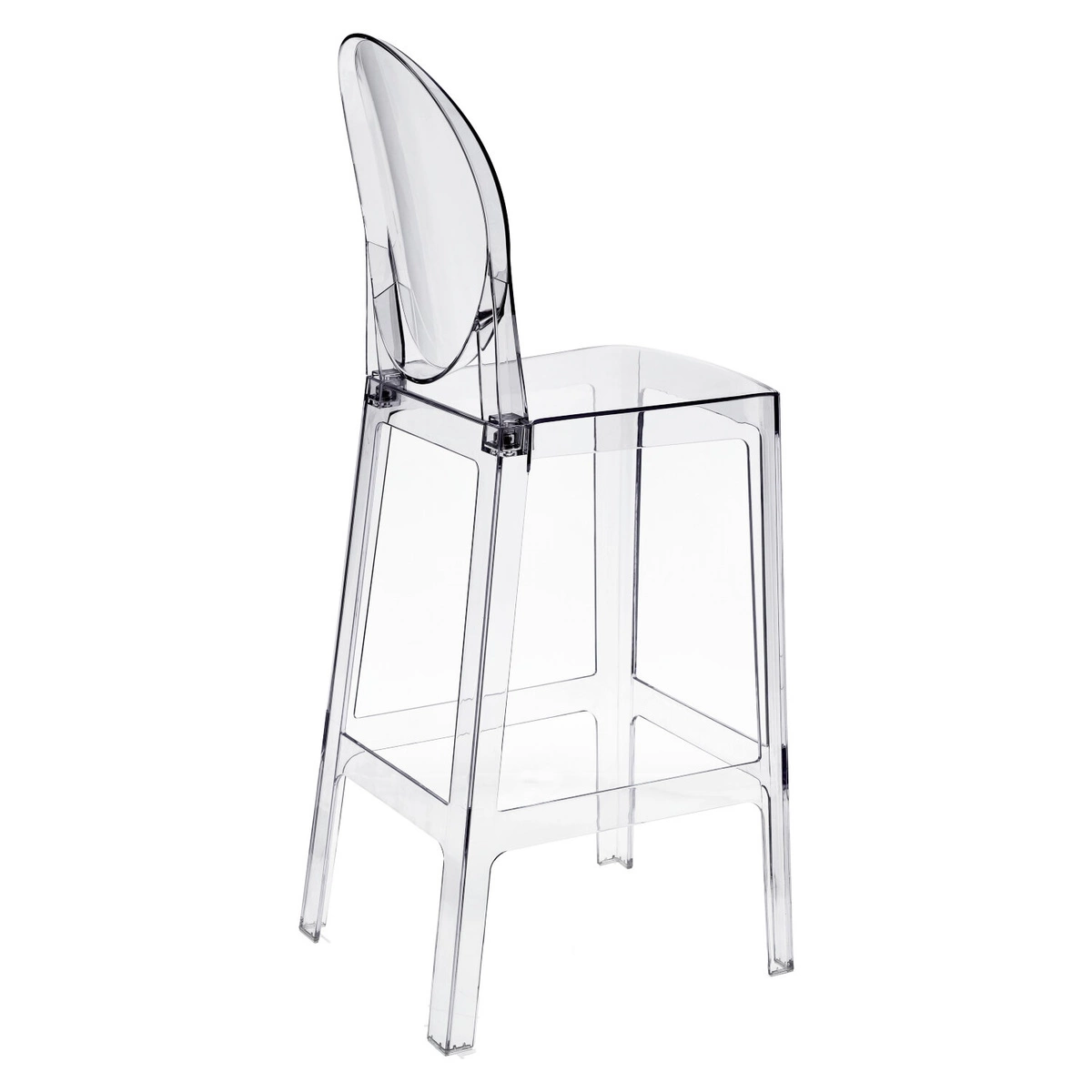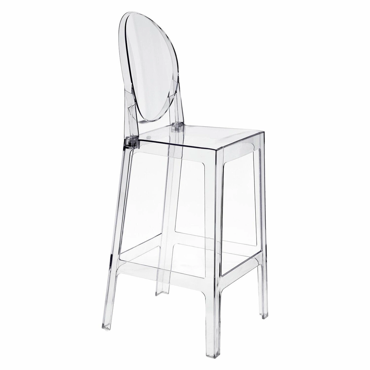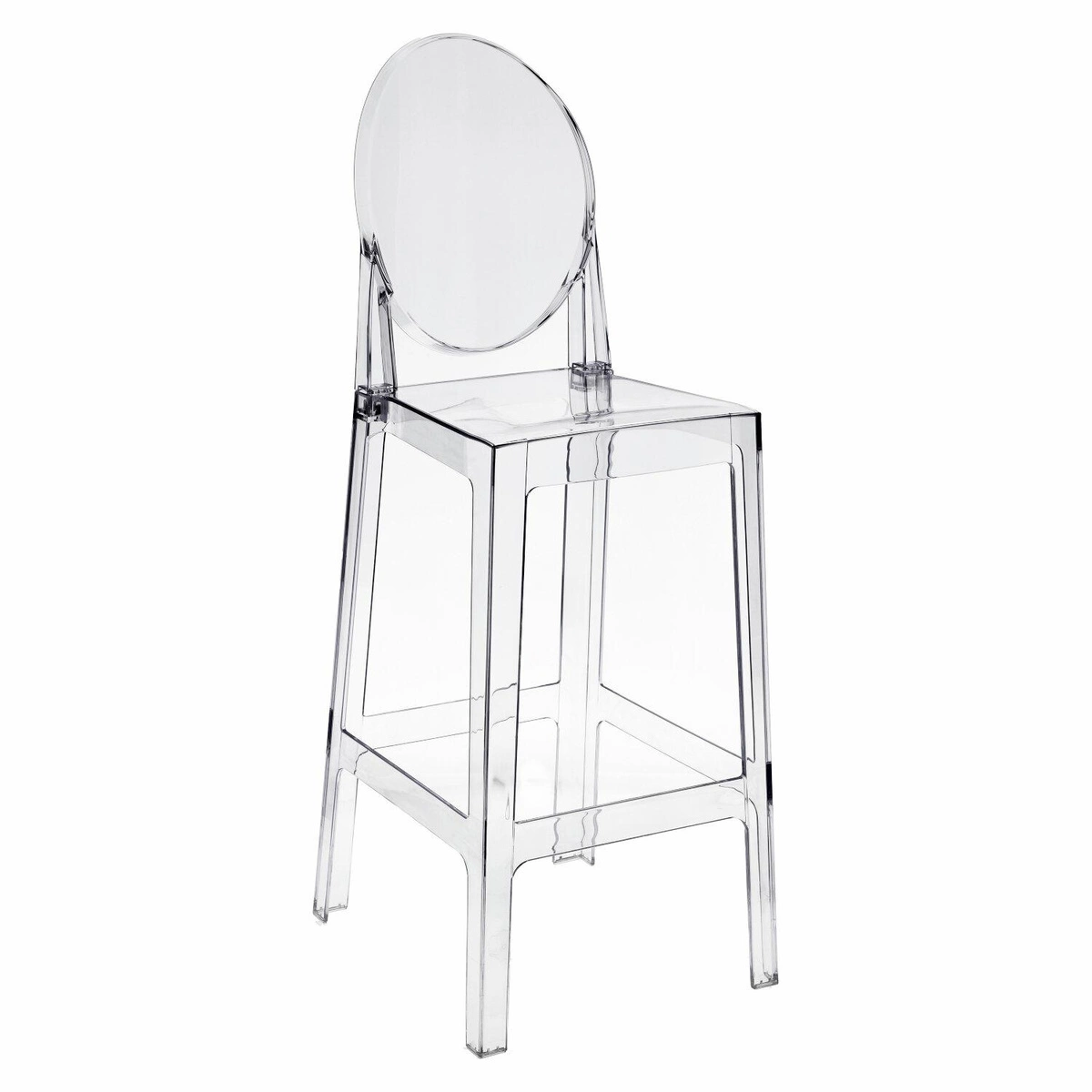 Stołek barowy Viki to idealne uzupełnienie krzeseł z tej samej serii. Transparentny stołek barowy z zaokrąglona górna część oparcia kontrastuje z kwadratowym siedziskiem tworząc niespodziewanie elegancką całość.,Mimo swej delikatności formy, stołek jest wygodny oraz stabilny. Prezentowany produkt jest inspirowany projektem Victoria.Maksymalne obciążenie wynosi 120kg. Stołek wymaga montażu.