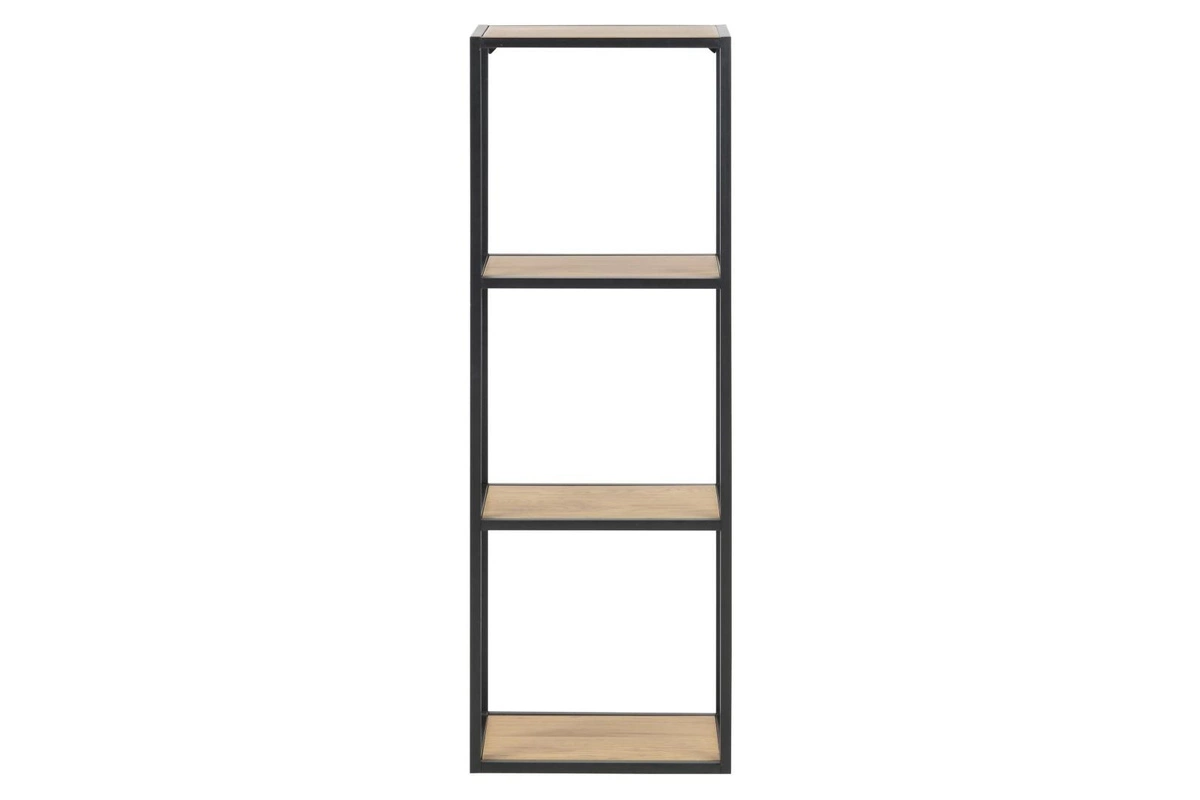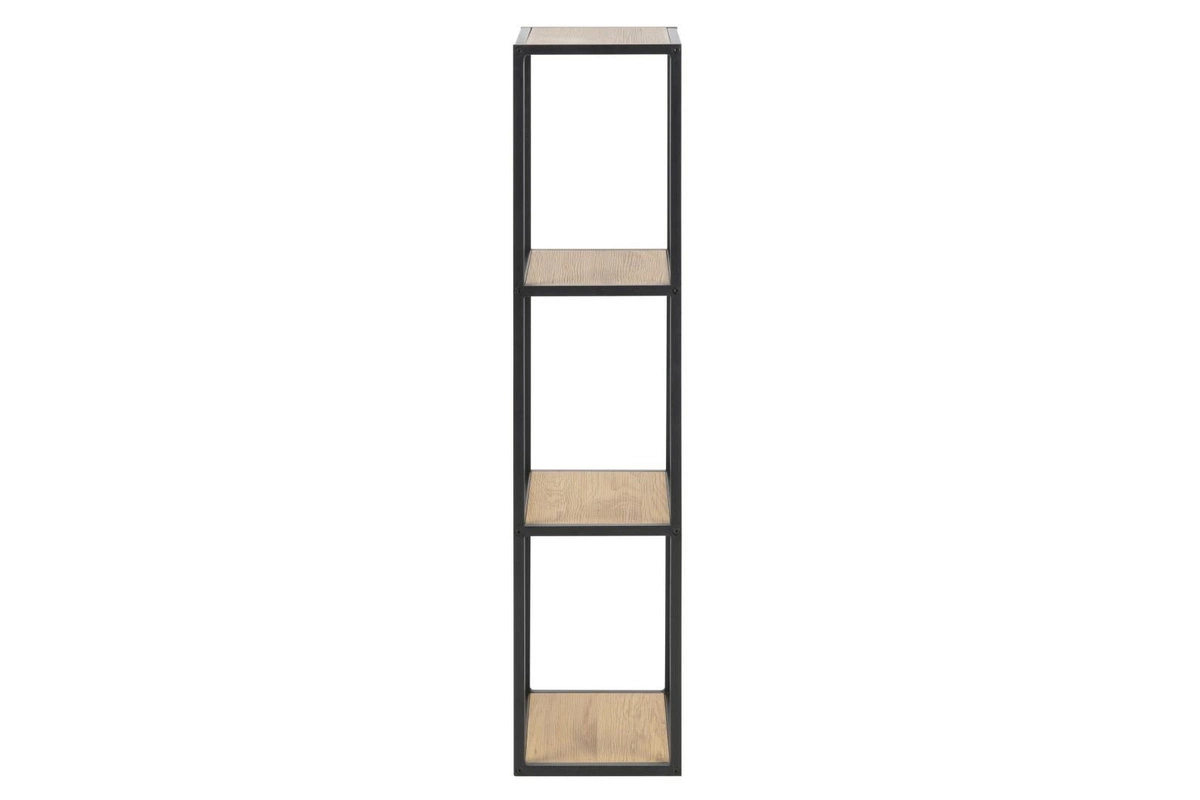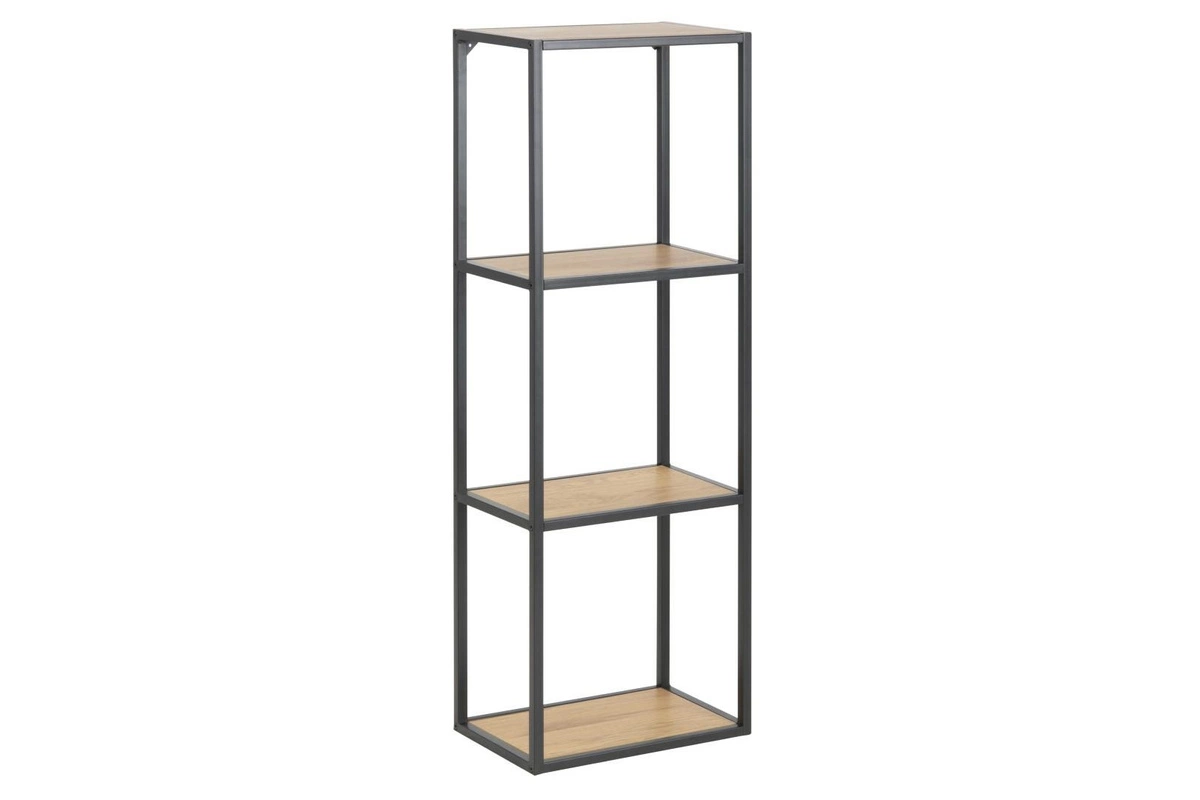 Regał Seaford został zrobiony z wytrzymałego metalowego szkieletu oraz czterech półek z MDF oklejonych okleiną. Metalowa konstrukcja została pomalowana proszkowo na czarno. Jej matowe wykończenie nadaje całości elegancji. Okleina na półkach idealnie imituje strukturę drewna dębu. Waga: 5,8 kg. Wymiary kartonu: 9,5cm x 113cm x 26,5cm