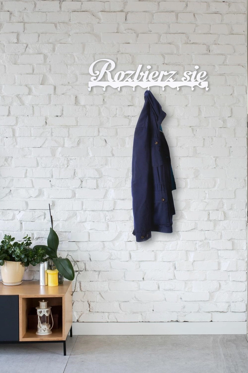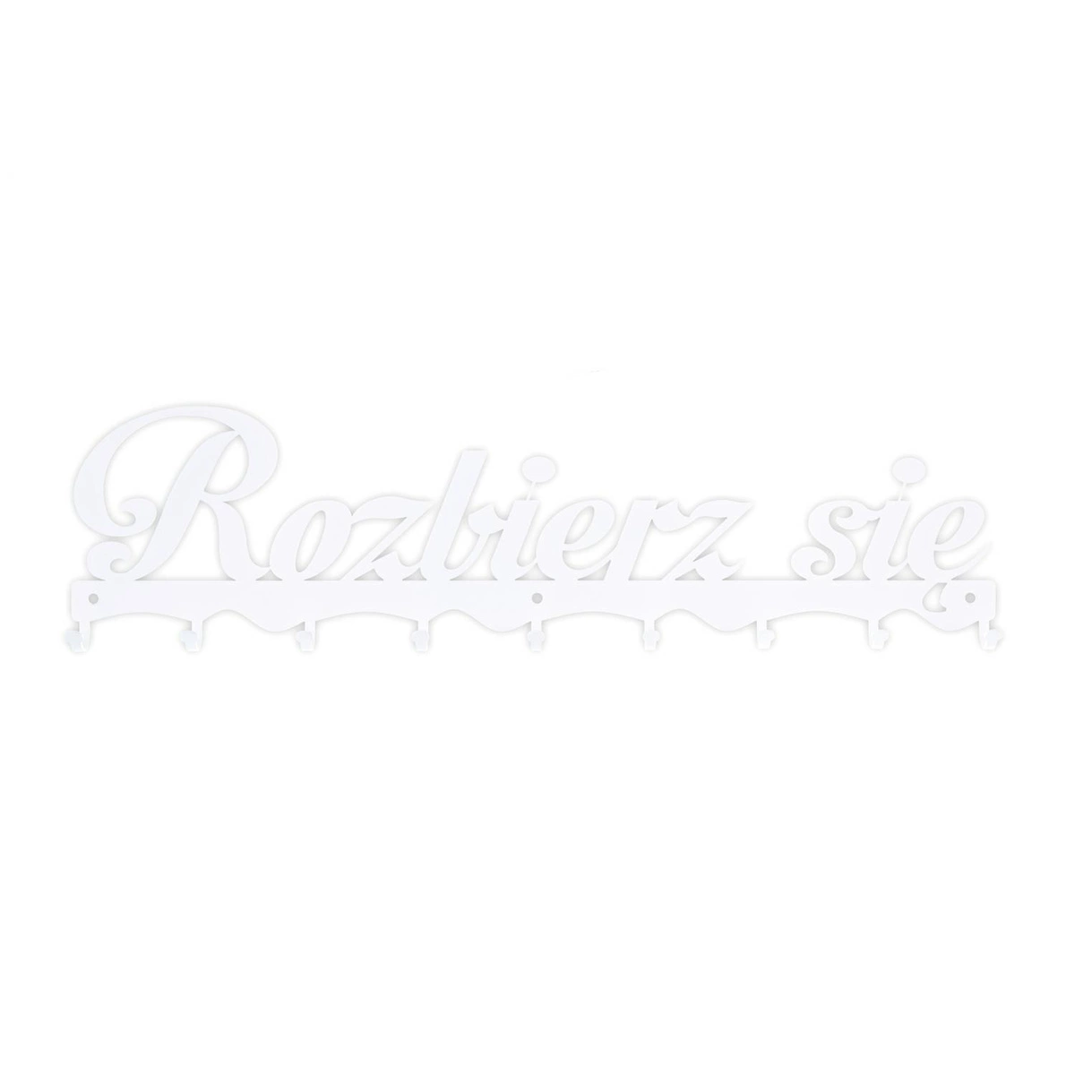 Wieszak ścienny Rozbierz się to stylowe rozwiązanie do przedpokoju, holu lub poczekalni. Jego precyzyjnie wycięty laserowo wzór, z frywolnym napisem, nada uroku każdemu wnętrzu. Stalowy malowany proszkowo wieszak jest uniwersalny oraz odporny na uszkodzenia. Matowe wykończenie dodaje listwie stylu. Dzięki aż 9 haczykom o udźwigu do 3kg każdy, możemy powiesić na wieszaku klucze, kurtki lub nawet torby. Produkt dostępny jest w dwóch kolorach co zwiększa jego możliwości aranżacyjne. Maksymalne obciążenie to 27kg. Do wieszaka załączany jest zestaw montażowy, który składa się z kołków, zaślepek i śrubek.