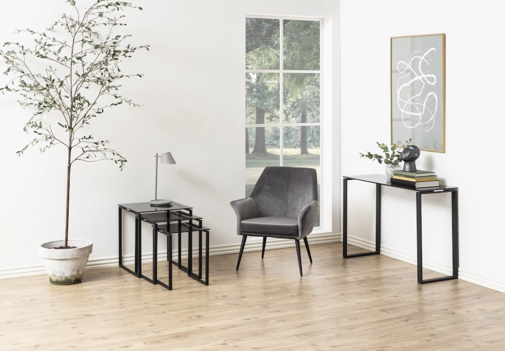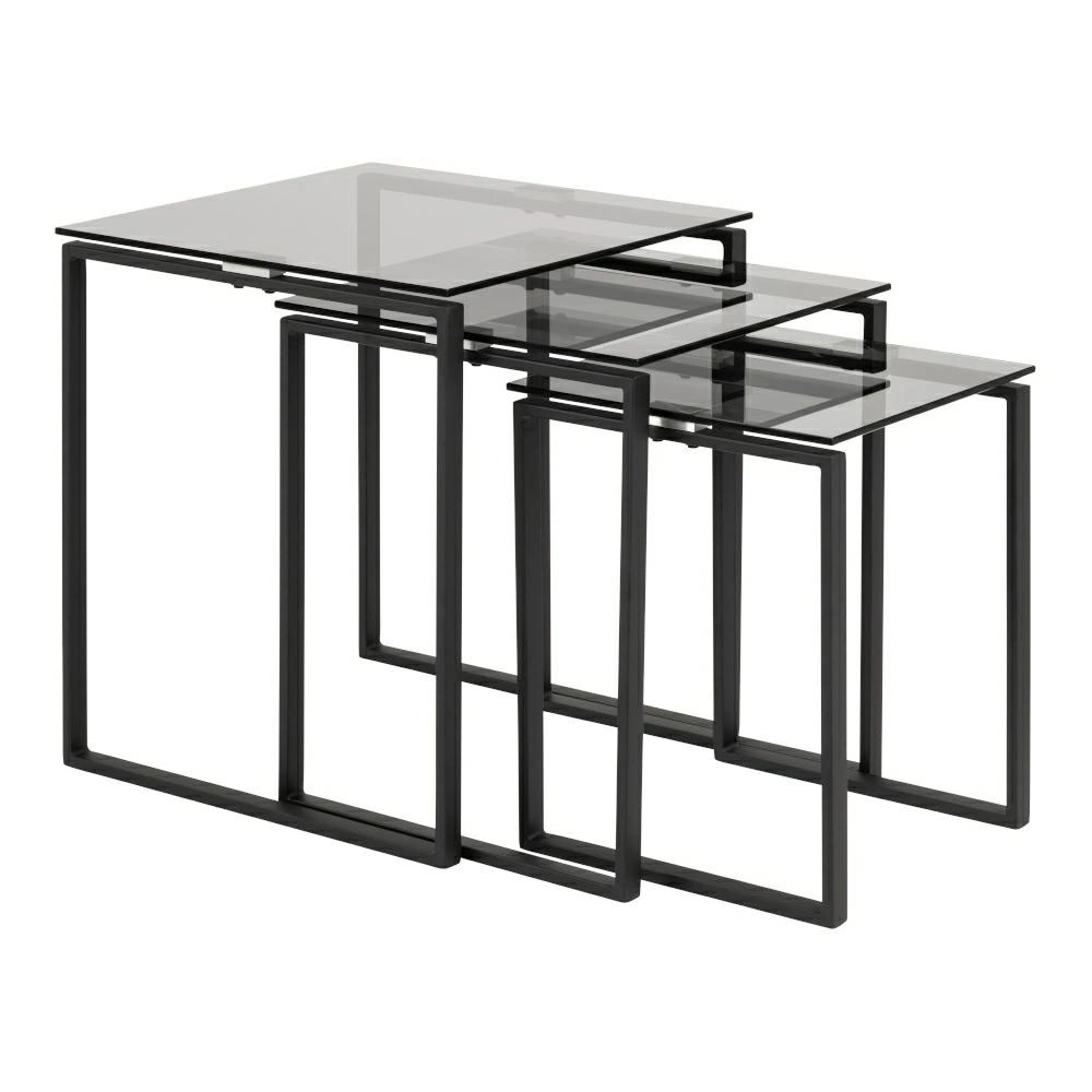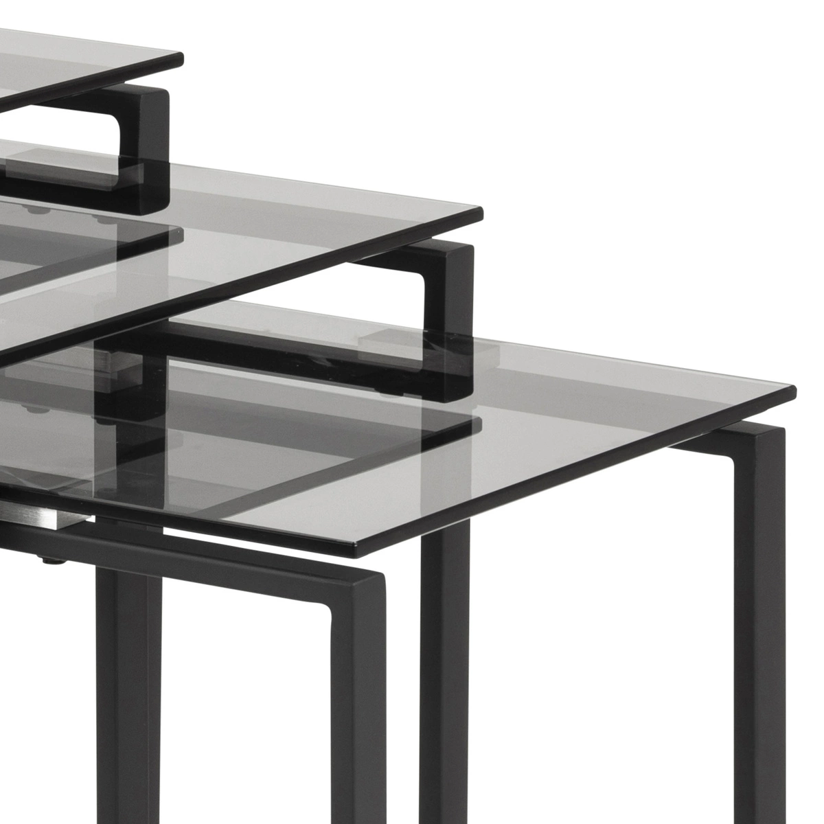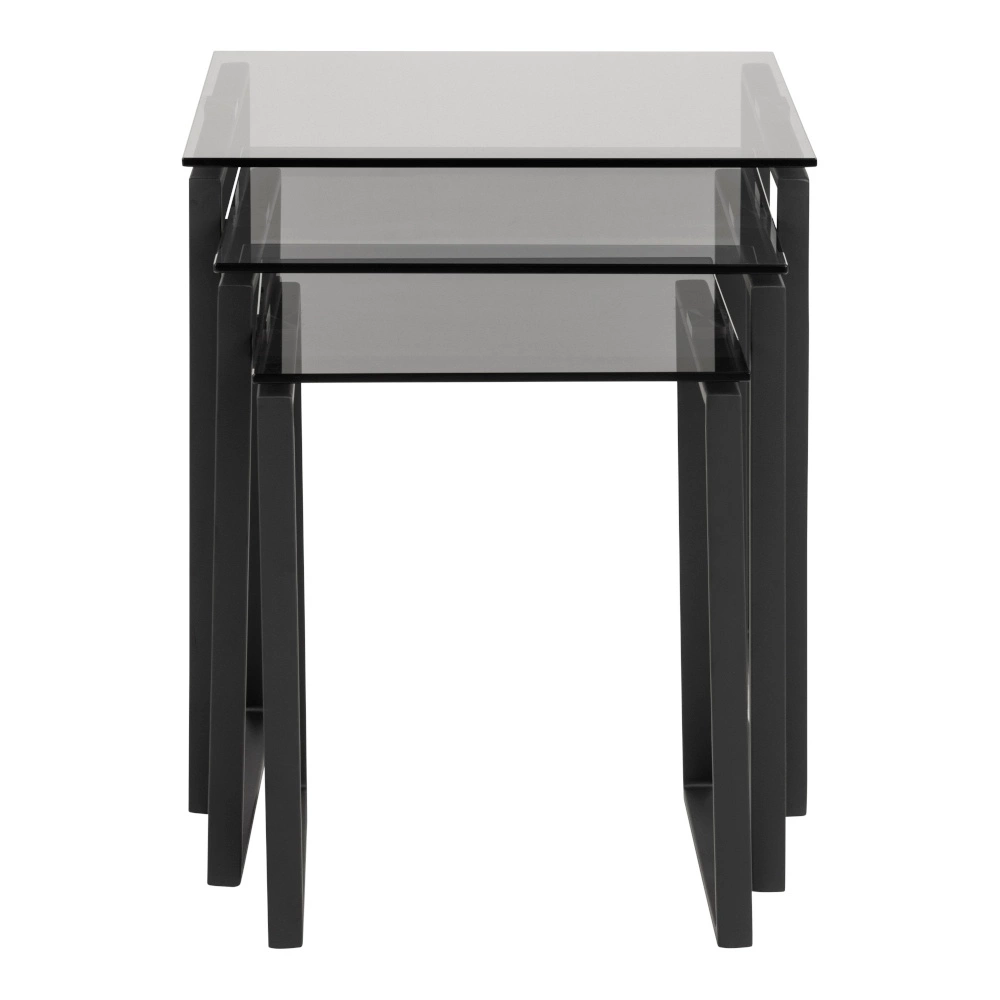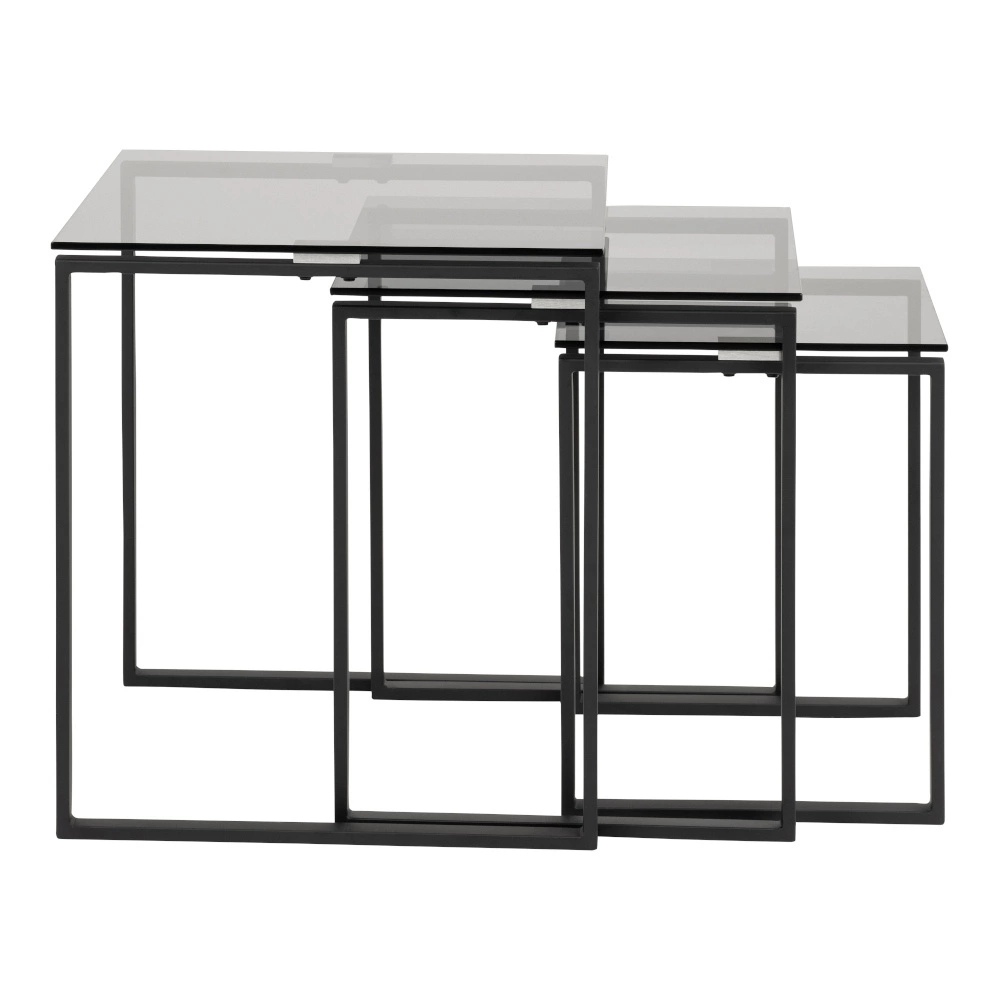 Nowoczesny zestaw stolików Katrine to trzy stoliki o różnych wielkościach. Ponadczasowe połączenie metalu ze szkłem tworzy ciekawą kompozycję. Szklane kwadratowe blaty stolików o grubości 8 mm są zrobione z dymionego szkła. Metalowa podstawa stolików natomiast została pomalowana proszkowo na czarno. Wymiary stolików (cm): 50x50x55; 43x43x50; 36x36x45 Waga: 17,3 kg. Wymiary kartonu: 13,3cm x 57,2cm x 53cm