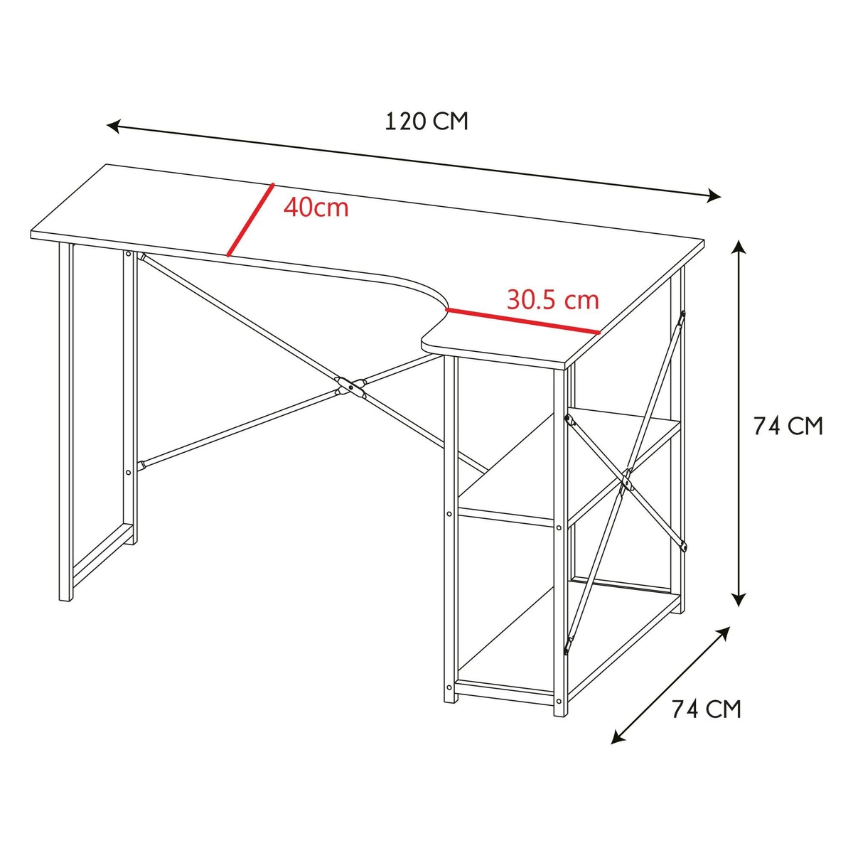 Biuro narożne Stand to mebel w stylu loftowym. Biurko doskonale sprawdzi się dla osób, które cenią sobie zorganizowane miejsce pracy. Biurko wyposażone jest w dwie półki, w których możemy trzymać segregatory lub bloczki kartek samoprzylepnych. Blat biurka w kształcie litery L pomieści nie tylko monitor komputera czy laptop. Biurko Stand doskonale odnajdzie się zarówno w biurze, gabinecie, jak i pokoju młodzieżowym. Biurko charakteryzuje się prostą konstrukcją. Blat oraz półki z laminowanej płyty MDF usytuowane zostały na metalowej, stylowej podstawie, która nadaje całości uroku. Wymiary opakowania: 5x75x123 cm Waga: 15kg