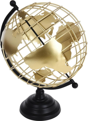 Metalowy globus o ażurowej konstrukcji to dodatek w stylu modern glamour. Połączenie złotego globu z czarną metalową podstawą dodaje globusowi eleganckiego wyglądu. Kontynenty na globusie zostały zrobione z odpowiednio wyciętych laserowo kawałków metalu, które dodatkowo zostały pomalowane proszkowo na kolor złoty. Południki globusu i zarazem jego szkielet to również metalowa konstrukcja w kolorze złotym. Wymiary opakowania: 27,3x25,2x36,2 cm. Waga globusa: 1,3 kg