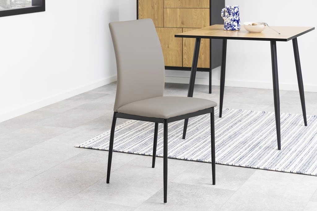 Krzesło Demina to krzesło, które doskonale sprawdzi się w przestrzeni hotelowej, komercyjnej czy domowej. Prosta forma krzesła sprawia, że krzesło dopasuje się do każdego stylu we wnętrzu. Siedzisko zostało obite mocną beżową eko skórą, nogi natomiast wykonane zostały z metalu pomalowanego proszkowo na czarno. Krzesło ma prostą i smukłą budowę, dzięki czemu dopasuje się do każdego nawet najbardziej nietypowego stołu. Krzesło jest niebywale lekkie i waży 4,8 kg. Maksymalne obciążenie: 120 kg Wysokość siedziska: 48,5 cm Szerokość siedziska: 43,5 cm Głębokość siedziska: 40 cm