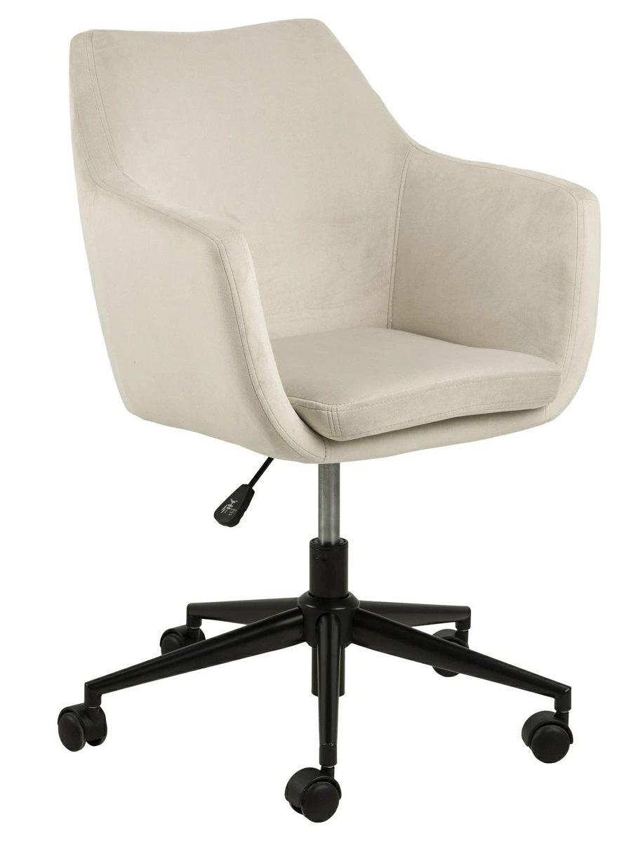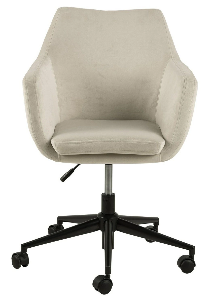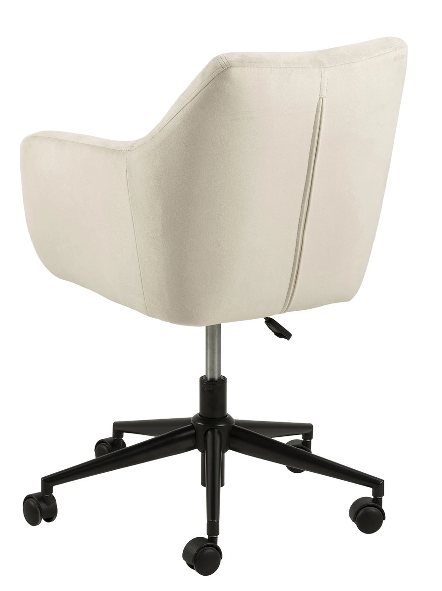 Krzesło obrotowe Nora nawiązuje do najnowszych trendów wnętrzarskich. Siedzisko tapicerowane tkaniną VIC fabric sand A80 w modnym kolorze efektownie komponuje się z pięcioramienną podstawą na kółkach wykonaną z malowanego proszkowo metalu. Krzesło obraca się oraz ma możliwość regulowania wysokości. Wysokość siedziska: 54 cm Szerokość siedziska: 39 cm Głębokość siedziska: 41 cm Wysokość podłokietników: 22,5 cm Wymiary: 58x58x91cm Waga krzesła: 9kg