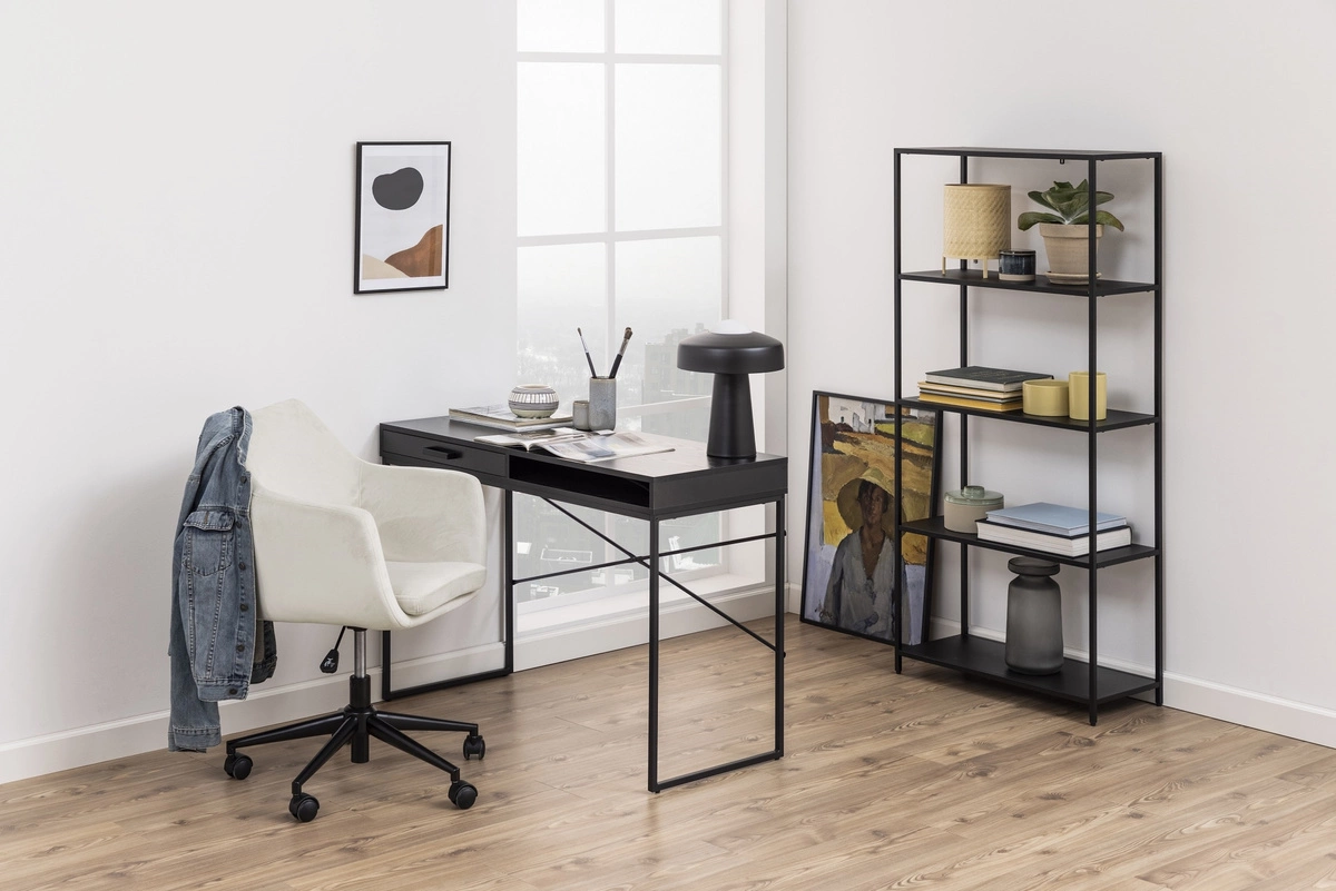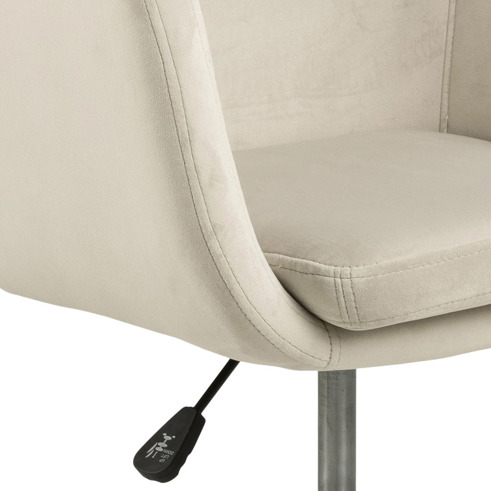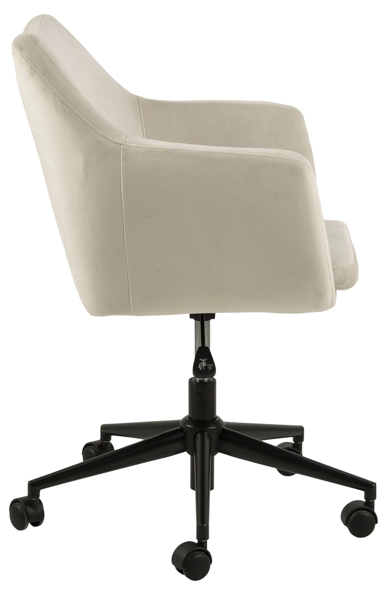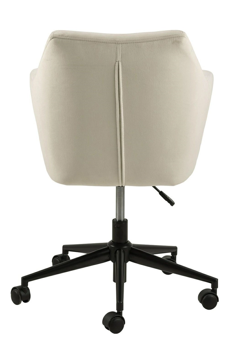 Krzesło obrotowe Nora nawiązuje do najnowszych trendów wnętrzarskich. Siedzisko tapicerowane tkaniną VIC fabric sand A80 w modnym kolorze efektownie komponuje się z pięcioramienną podstawą na kółkach wykonaną z malowanego proszkowo metalu. Krzesło obraca się oraz ma możliwość regulowania wysokości. Wysokość siedziska: 54 cm Szerokość siedziska: 39 cm Głębokość siedziska: 41 cm Wysokość podłokietników: 22,5 cm Wymiary: 58x58x91cm Waga krzesła: 9kg