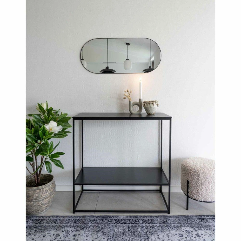 Lustro o owalnym kształcie w czarnej owalnej ramie to dodatek do nowoczesnego przedpokoju lub łazienki. Lustro ścienne o wysokości 80 cm to modny dodatek, który ozdobi pustą ścianę. Rama malowana proszkowo na czarno, dzięki swojej wąskiej formie nie zakłóca kompozycji i sprawia, że lustro wygląda nowocześnie i ponadczasowo. Rama metalowa Wymiary opakowania: 86x44x7 cm Waga paczki: 2,3 kg