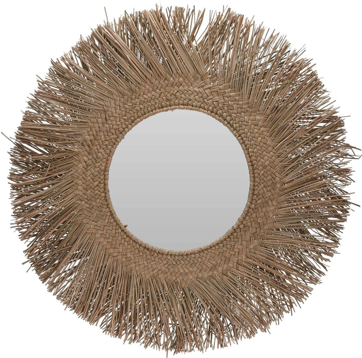 Lustro Kubul to duże lustro boho z naturalną ręcznie plecioną ramą. Rama z naturalnych traw wykonana została z mocno przędzonych kępek traw. Trawy na końcu zostały przycięte na około, tworząc okrąg. Zwierciado lustra o okrągłym kształcie zostało zamontowane na płycie, która wyposażona została w haczyk do zamontowania lustra na ścianie. Wymiary opakowania: 72x72x3 cm Waga: 0,9 kg