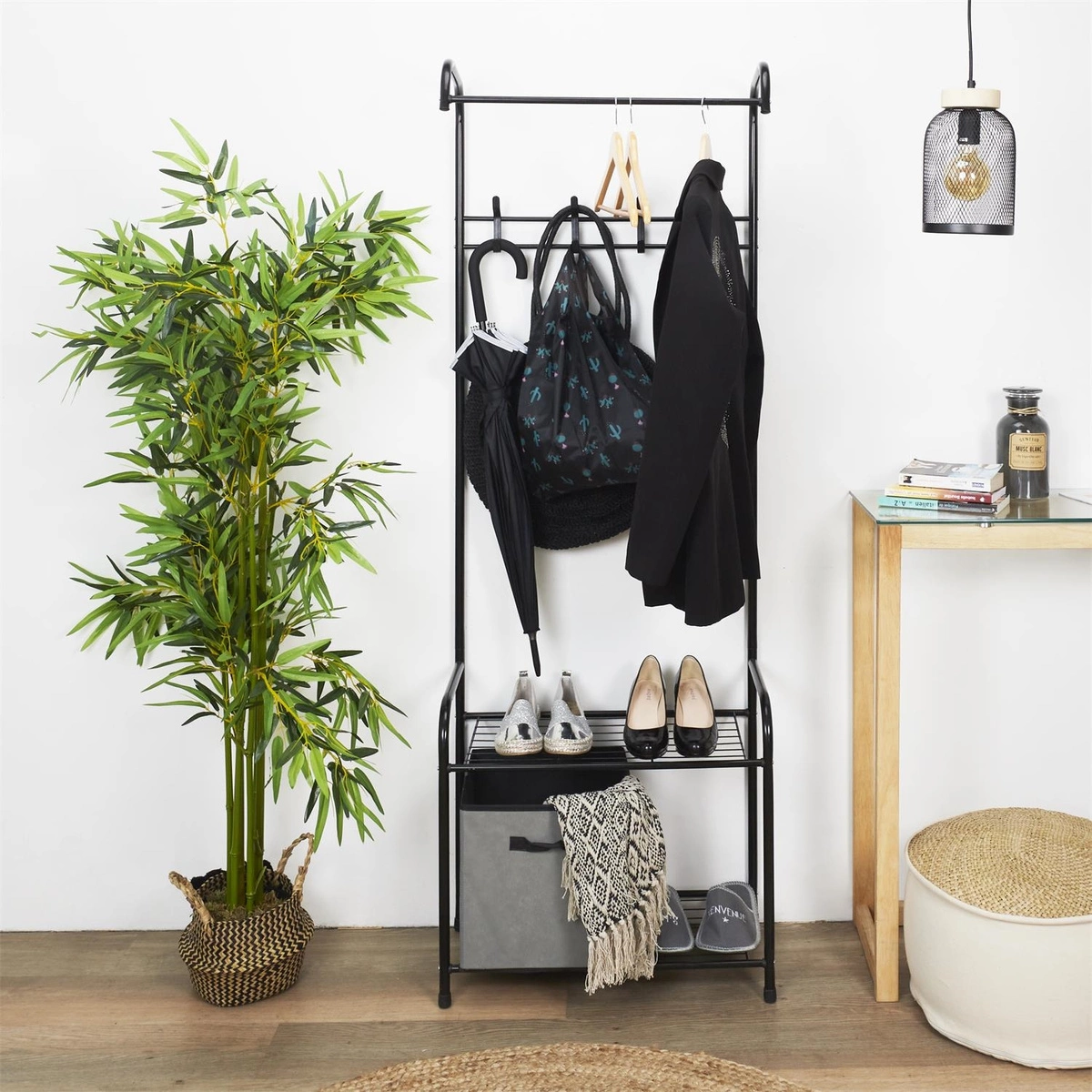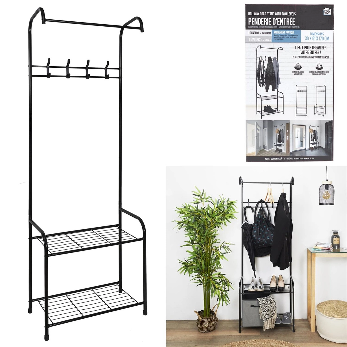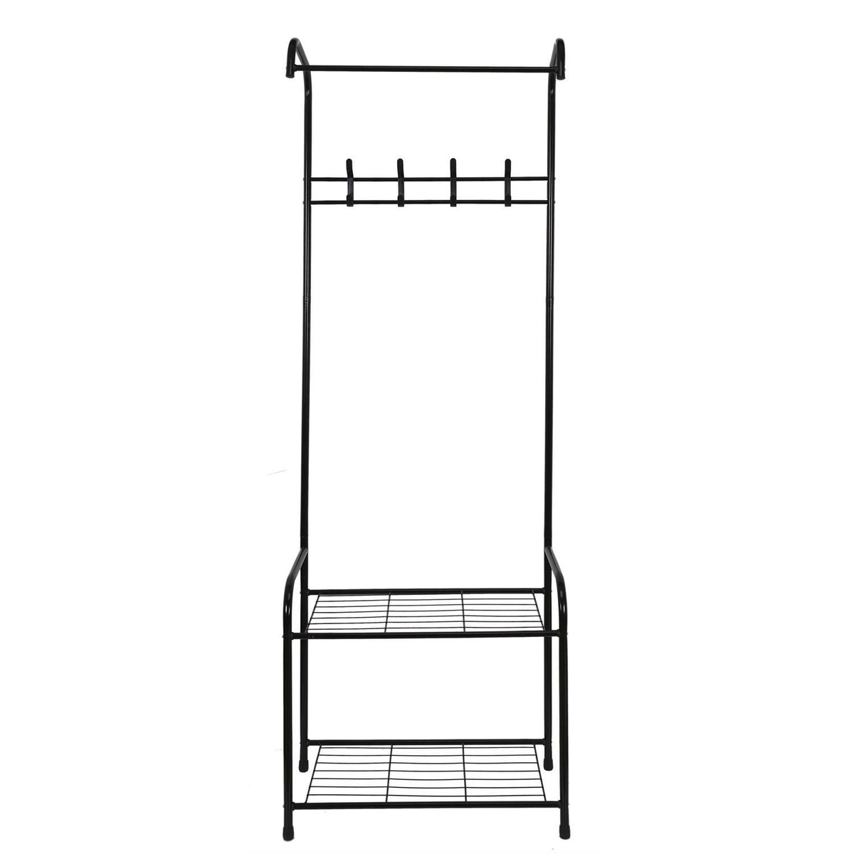 Wieszak do przedpokoju z metalu w kolorze czarnym pozwoli na szybką aranżację przedpokoju. Wieszak 2 w 1, gdyż posiada on wieszaki na kurtki oraz półki na buty. Dzięki temu meblowi możemy uporządkować buty oraz kurtki bez ingerencji w ściany mieszkania. Dzięki temu, że wieszaka nie trzeba mocować do ściany tak jak standardowe wieszaki, nadaje się on idealnie do mieszkania wynajmowanego. Ta niezwykle praktyczna szafa do przedpokoju ma 2 półki na buty i 4 haczyki na kurtki i płaszcze! - Skład: stal nierdzewna, tworzywo sztuczne. Wymiary opakowania: 64,00 x 7,50 x 36,50 cm