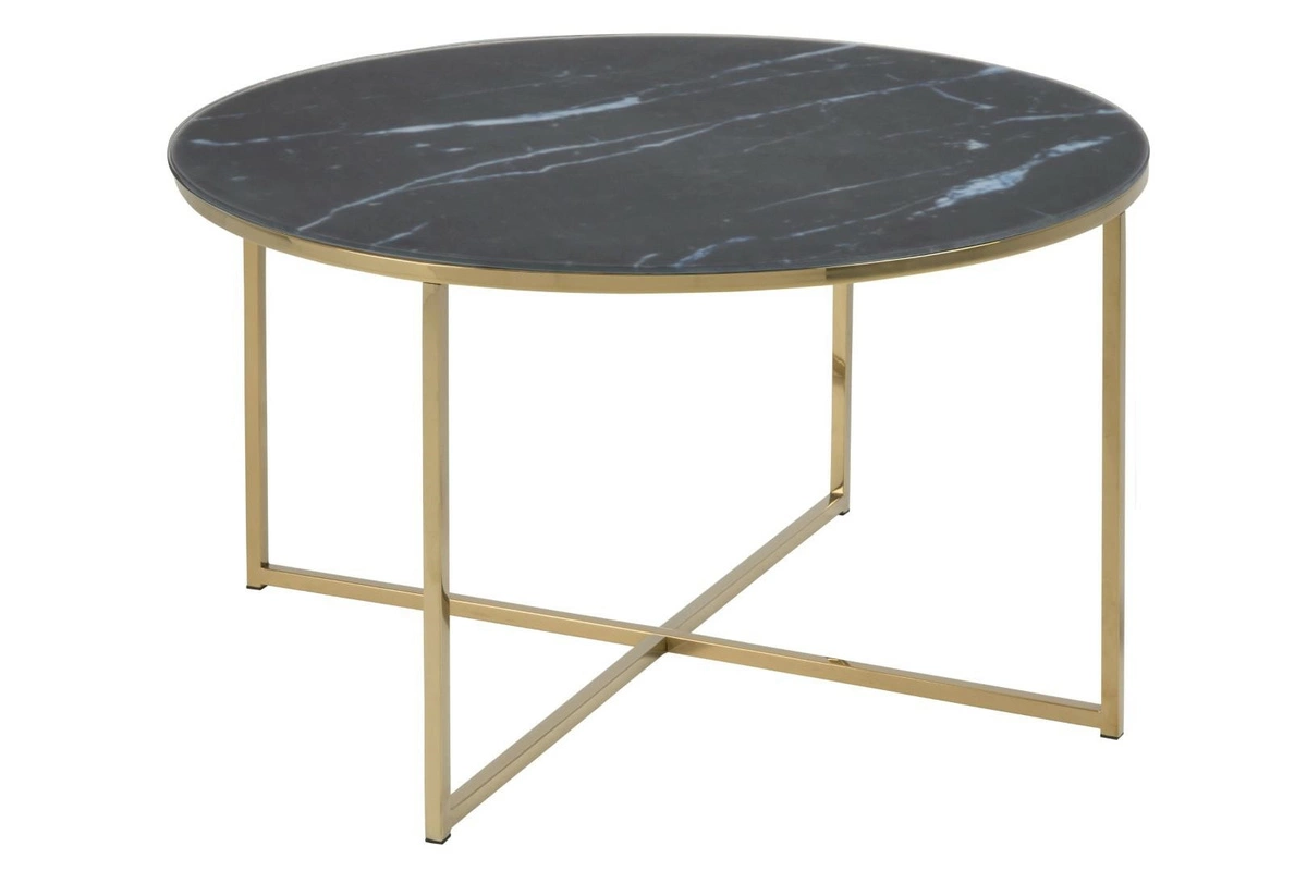 Kawowy stolik Alisma z okrągłym blatem wykonany został z hartowanego szkła połączonego ze złotą metalową podstawą. Imitujący czarny marmur wzór na szkle oraz geometria to wpisujące się w trendy, elementy nowoczesnego designu. Szklany blat o grubości 6 mm jest wytrzymały i solidny. Nie groźne są mu gorące kubki z kawą lub rozlany sok. Stolik ze względu na materiały, z których został zrobiony, jest wytrzymały oraz łatwy w czyszczeniu. Wmiary opakowania: 86x87x9 cm Waga: 10 kg