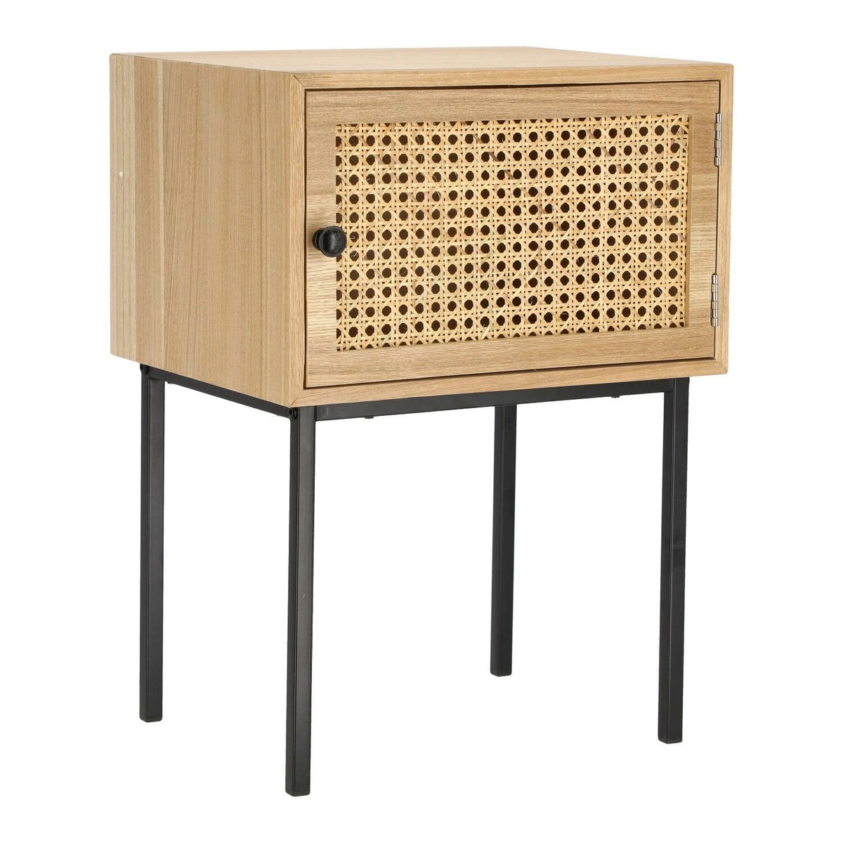 Szafka nocna Panamo z plecionką wiedeńską będzie ciekawym dopełnieniem sypialni w stylu skandynawskim lub boho. Szafka nocna na metalowych, malowanych proszkowo na czarno nogach to minimalistyczny mebel o pojemnej szafce z frontem wykończonym naturalną plecionką wiedeńską. Front szafki ozdobiony został metalowym uchwytem. Korpus szafki to wytrzymała płyta MDF w okleinie imitującej drewno. Wysokość nóżek 28cm