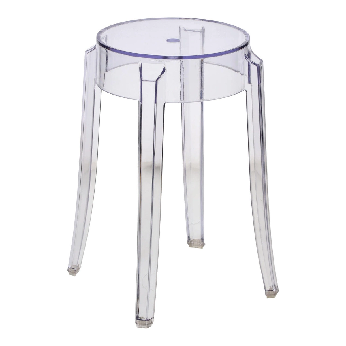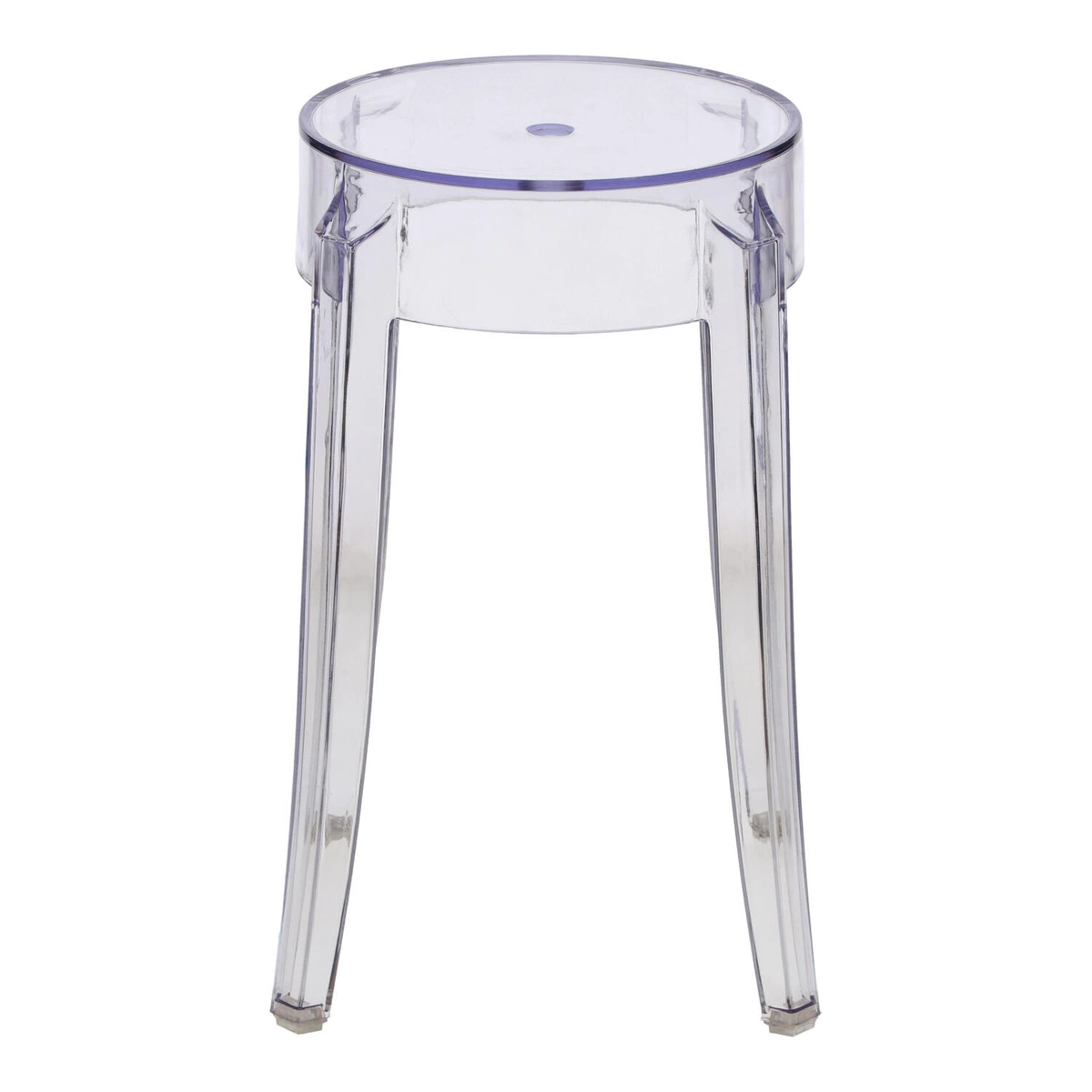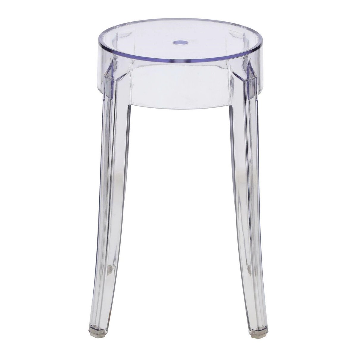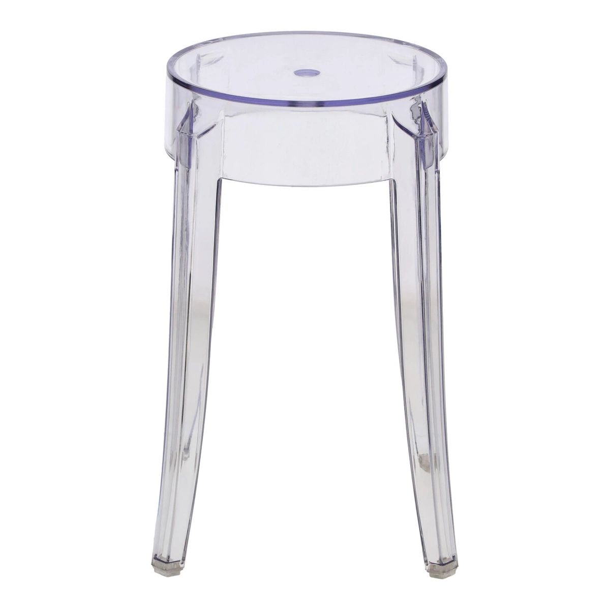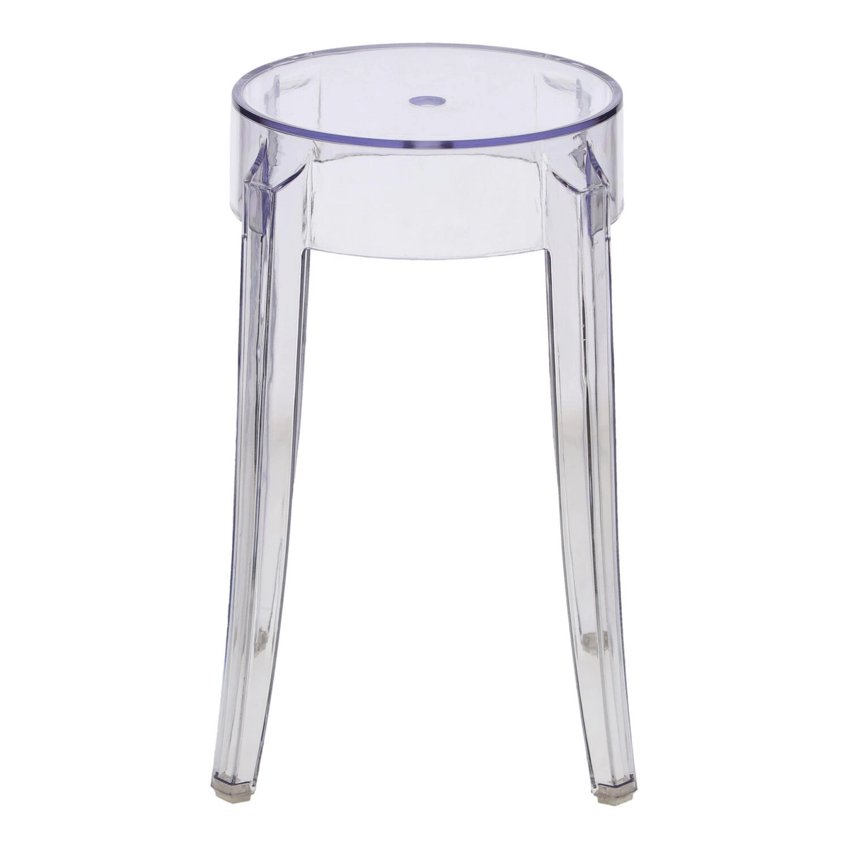 Przezroczysty stołek barowy. Nie zajmuje miejsca w przestrzeni. Jest idealnym uzupełnieniem kolekcji krzeseł transparentnych. Stołek dostępny jest również w wersji niskiej i wysokiej.Maksymalne obciążenie wynosi 120kg Średnica siedziska:26cm
