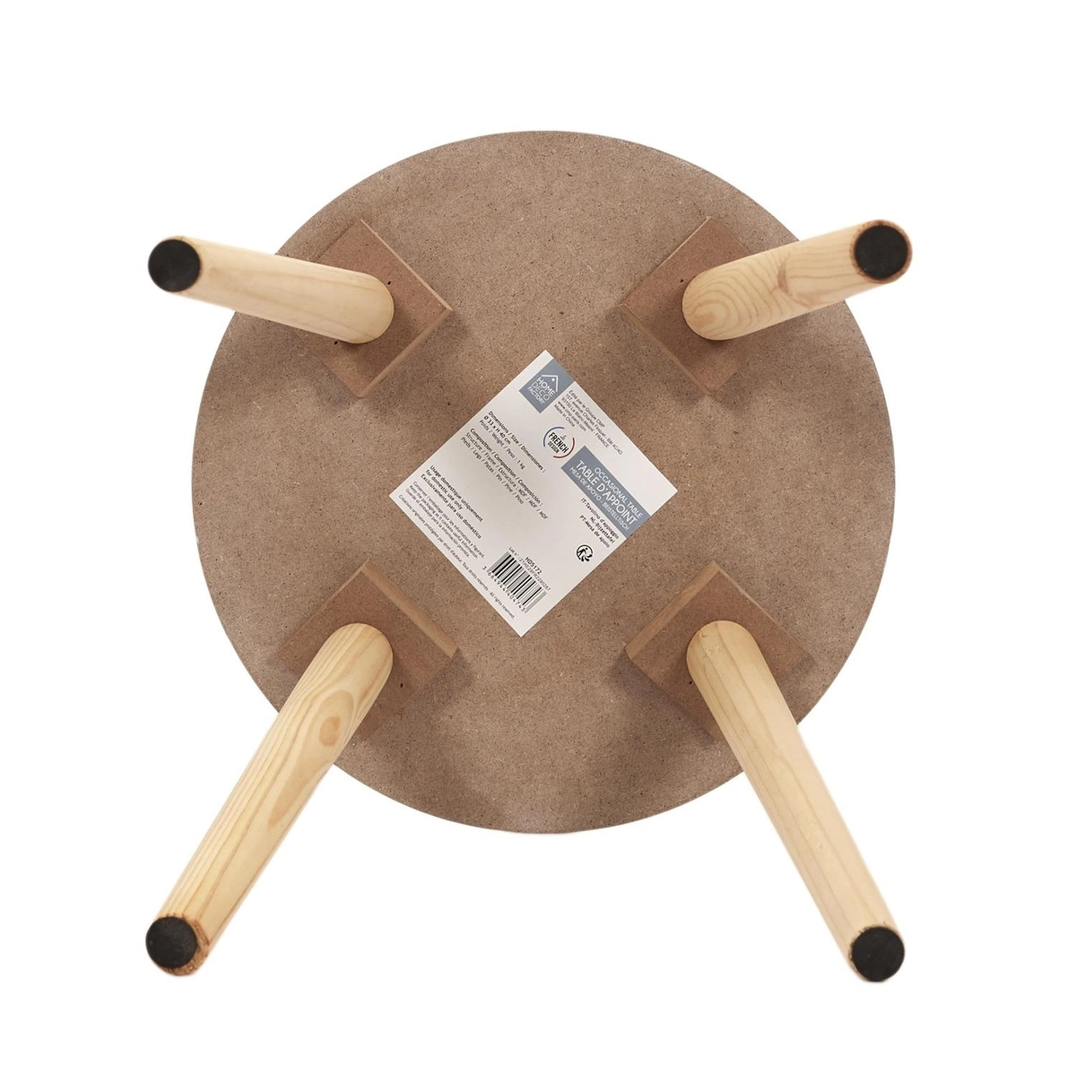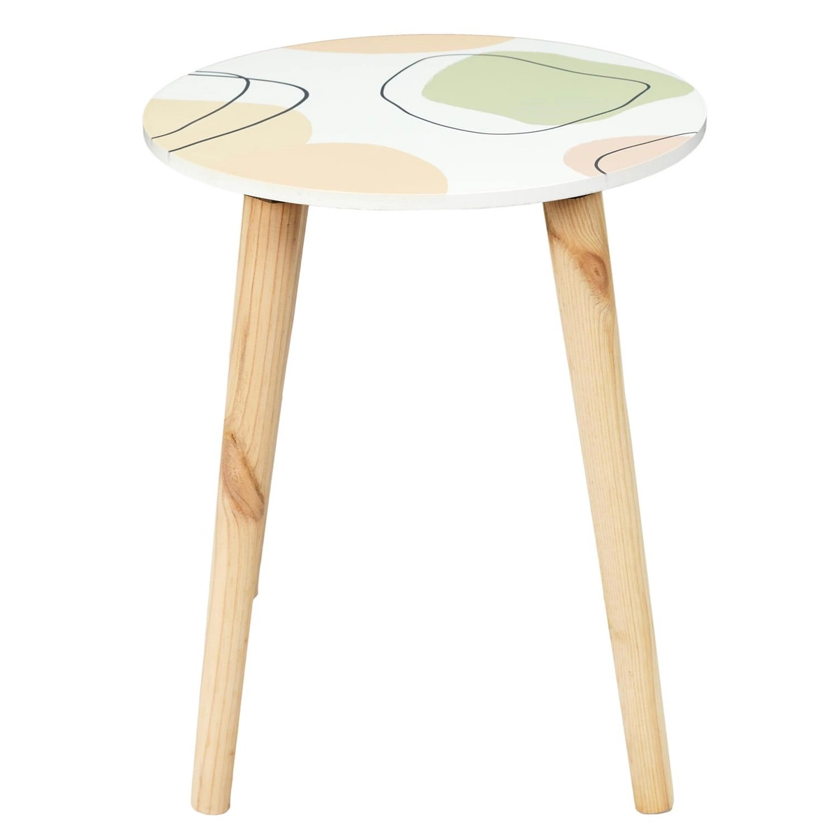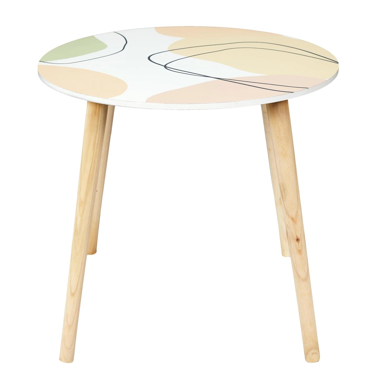 Zestaw dwóch stolików pomocniczych Arty o ciekawych pastelowych kolorach dopełni wnętrze w stylu boho lub skandynawskim. Stoliki o średnicy 48 cm oraz 33 cm zestawione ze sobą tworzą ciekawy kolaż kolorów. Wysokość większego stolika to 43 cm, natomiast mniejszego to 40 cm. Takie wymiary pozwalają lekko wsunąć mniejszy stolik pod większy. Nogi stolików wykonane zostały z drewna sosnowego. Dzięki olejowaniu widać wzory oraz sęki naturalnego drewna. Blaty stolików to natomiast bardzo wytrzymał płyta MDF ozdobiona okleiną o modnym wzorze.