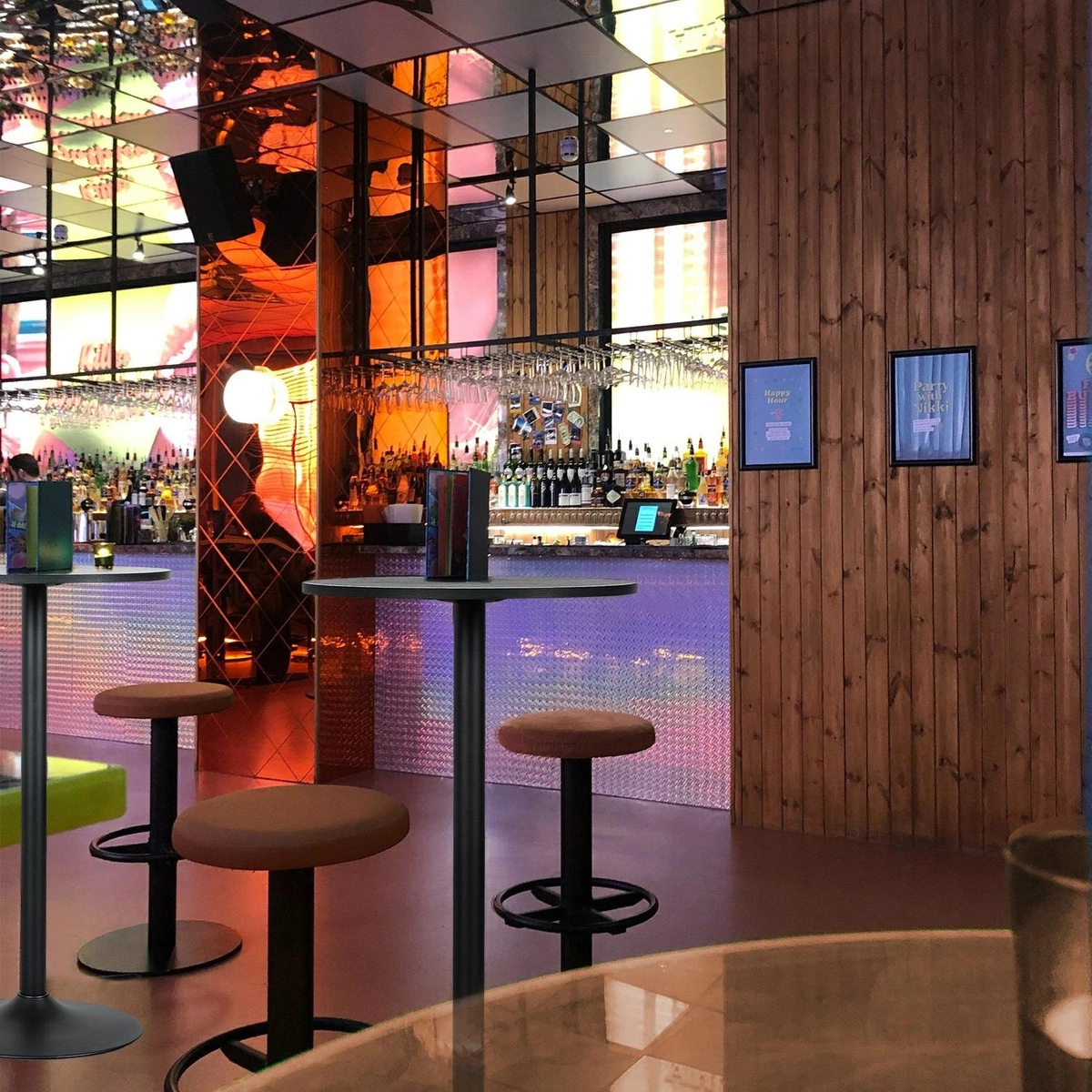 Czarny, wysoki stół barowy to połączenie metalowej, czarnej, malowanej proszkowo nogi stołu w kształcie trąbki oraz czarnego, okrągłego blatu wykonanego z płyty MDF. Stół barowy o wysokości 104 cm sprawdzi się jako dodatkowe miejsce siedzące przy wysokim oknie. Czarny stół barowy posiada okrągły b;at o średnicy 60 cm. Jego prosta i minimalistyczna budowa gwarantuje, że jest on uniwersalnym meblem, który dopasuje się do baru, restauracji lub nawet nowoczesnej kawiarni. Wymiary opakowania: 90x90x7cm