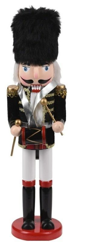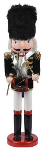 Dziadek do orzechów w tradycyjnym kolorze czerwono-złoto-czarnym to nieodzowny element świątecznego wystroju domu. Duża figurka dziadka do orzechów sprawdzi się jako ozdoba kominka, świątecznego stroiku lub stołu. Drewniany dziadek do orzechów w tradycyjnym stylu posiada okrągłą, drewnianą podstawkę. Dziadek wykonany został w całości z drewna oraz puchatego materiału, który został użyty jako broda i włosy figurki. Waga dziadka: 0,53 kg. Wymiary opakowania: 10x9x39,5 cm