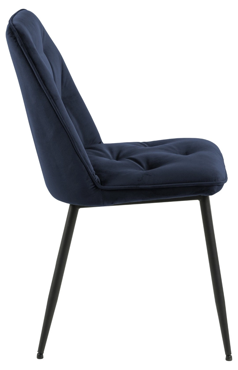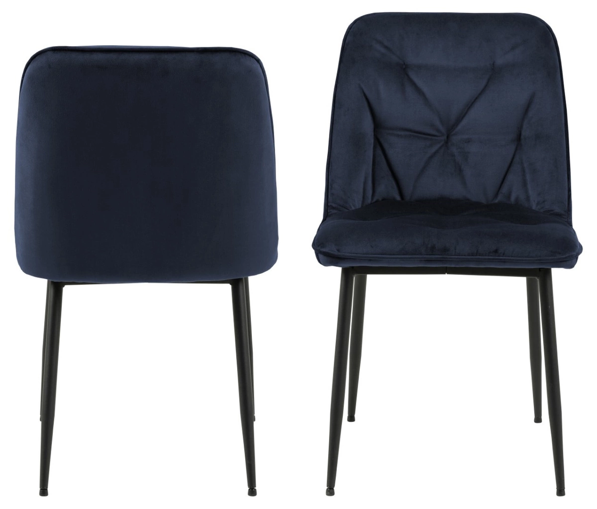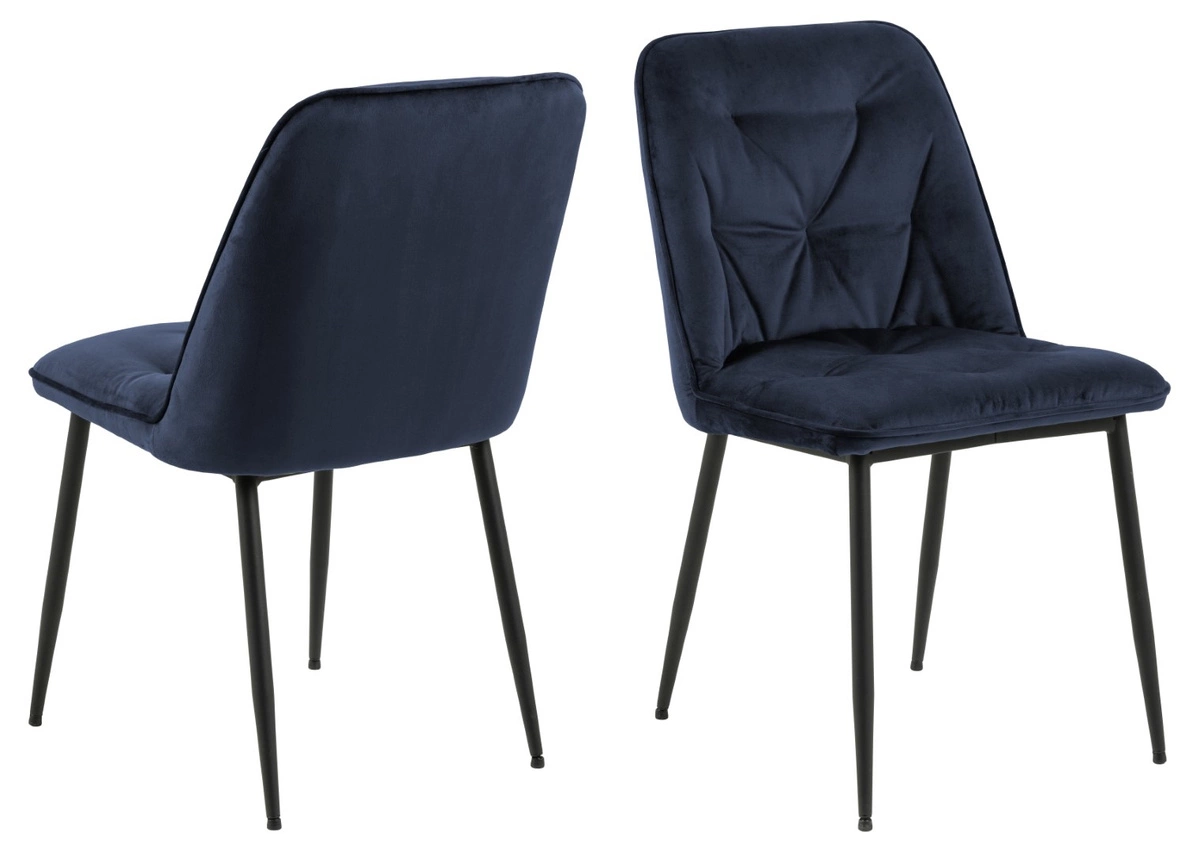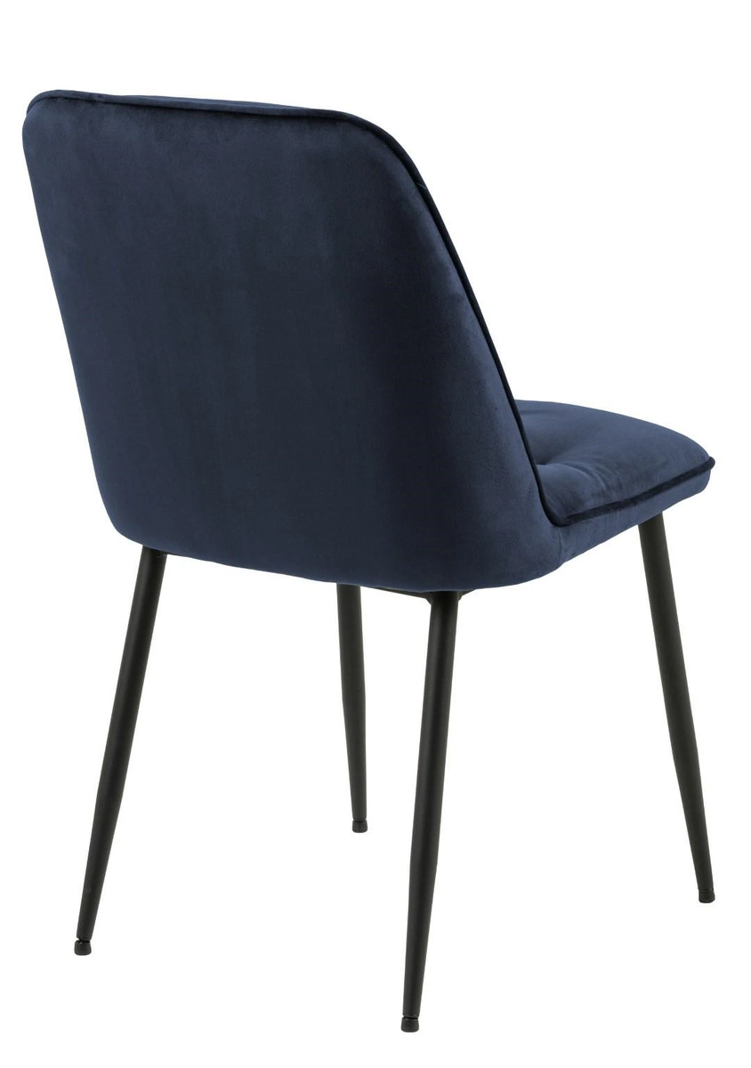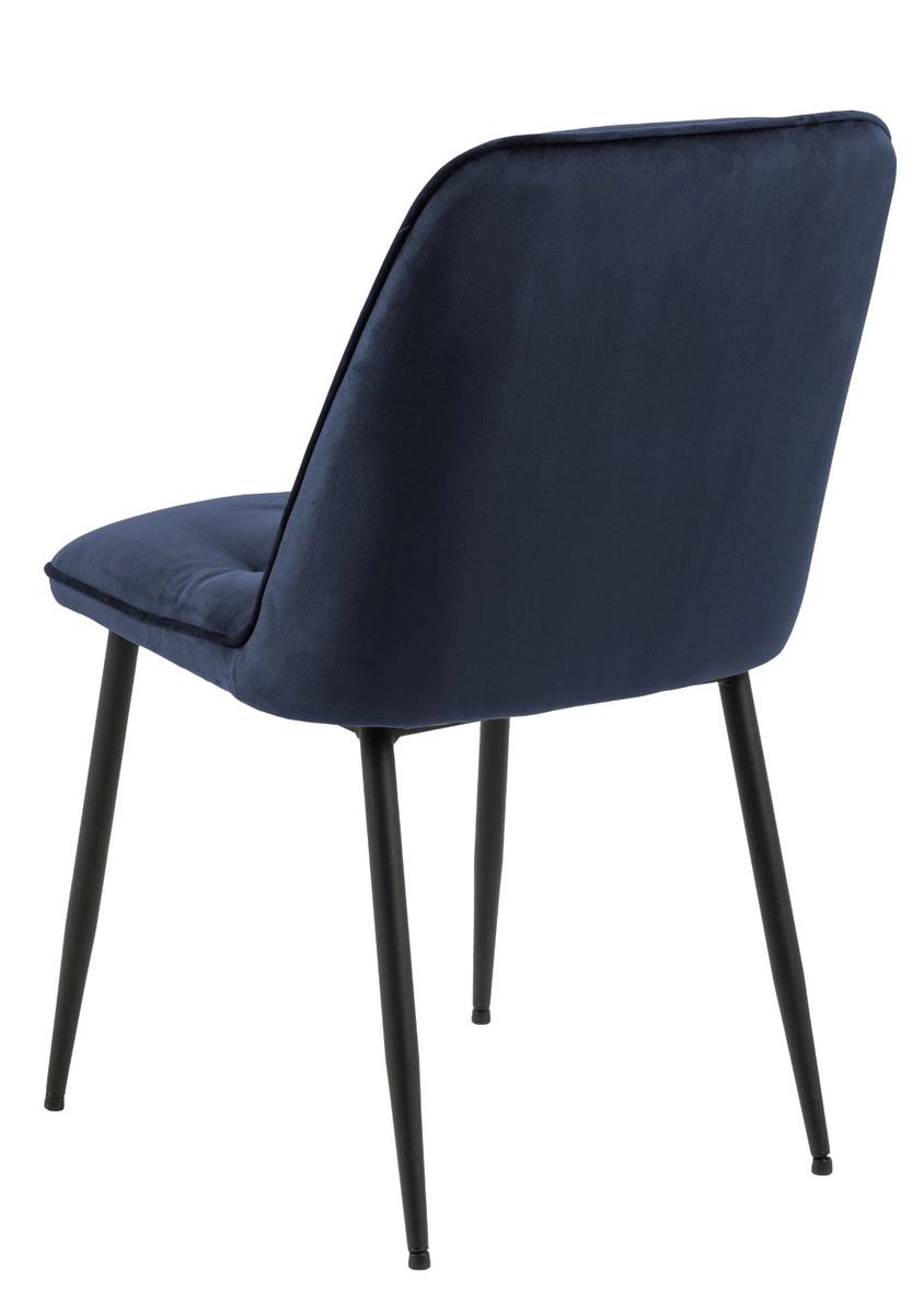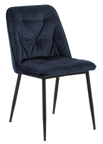 Krzesło Brooke standard jest krzesłem tapicerowanym miękką welwetową tkaniną Vic fabric midnight blue 77AC FR. Krzesło posiada wygodne oparcie, które zostało ozdobione pikowaniem dodającym mu stylu. Podstawą krzesła są malowane proszkowo na czarno metalowe nogi. Maksymalne obciążenie: 120 kg. Wysokość oparcia: 36cm Szerokość siedziska: 50cm Głębokość siedziska: 40cm Ilość kartonów: 1 Wymiary kartonów: 57x52x61cm Waga kartonów: 8kg