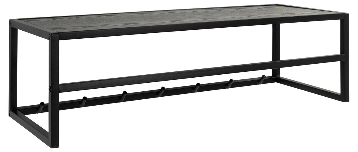 Półka z wieszakiem Seaford to świetny pomysł na stworzenie dodatkowego miejsca do przechowywania w przedpokoju. Na półkę składa się konstukcja z metalu malowanego proszkowo na kolor czarny oraz płyta MDF w okleinie w kolorze czarnym. Półka posiada siedem haczyków na ubrania oraz metalową poprzeczkę, na której można zawiesić takie elementy odzieży jak np. kurtki. Ilość kartonów: 1 Wymiary kartonów: 80,5x32x6,5cm Waga kartonów: 4,5kg