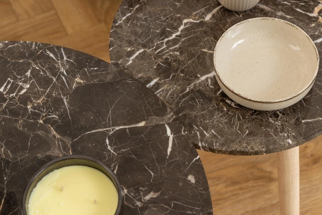 Doceń piękno natury z tym stolikiem kawowym z polerowanego marmuru Emperador. Oszałamiający kamień, który naturalnie różni się kolorem, strukturą i powierzchnią, sprawia, że każdy egzemplarz jest wyjątkowy. Blat jest połączony ze zwężającymi się drewnianymi nogami z drewna kauczukowca olejowanego na biało. Główne cechy : Okrągły stolik kawowy z blatem z polerowanego marmuru Emperador Każdy egzemplarz jest wyjątkowy, ponieważ kamień różni się kolorem, strukturą i powierzchnią Stożkowe drewniane nogi olejowane na biało Certyfikat FSC Ilość kartonów: 1 Wymiary kartonów: 67x7x72,5cm Waga kartonów: 14,5kg