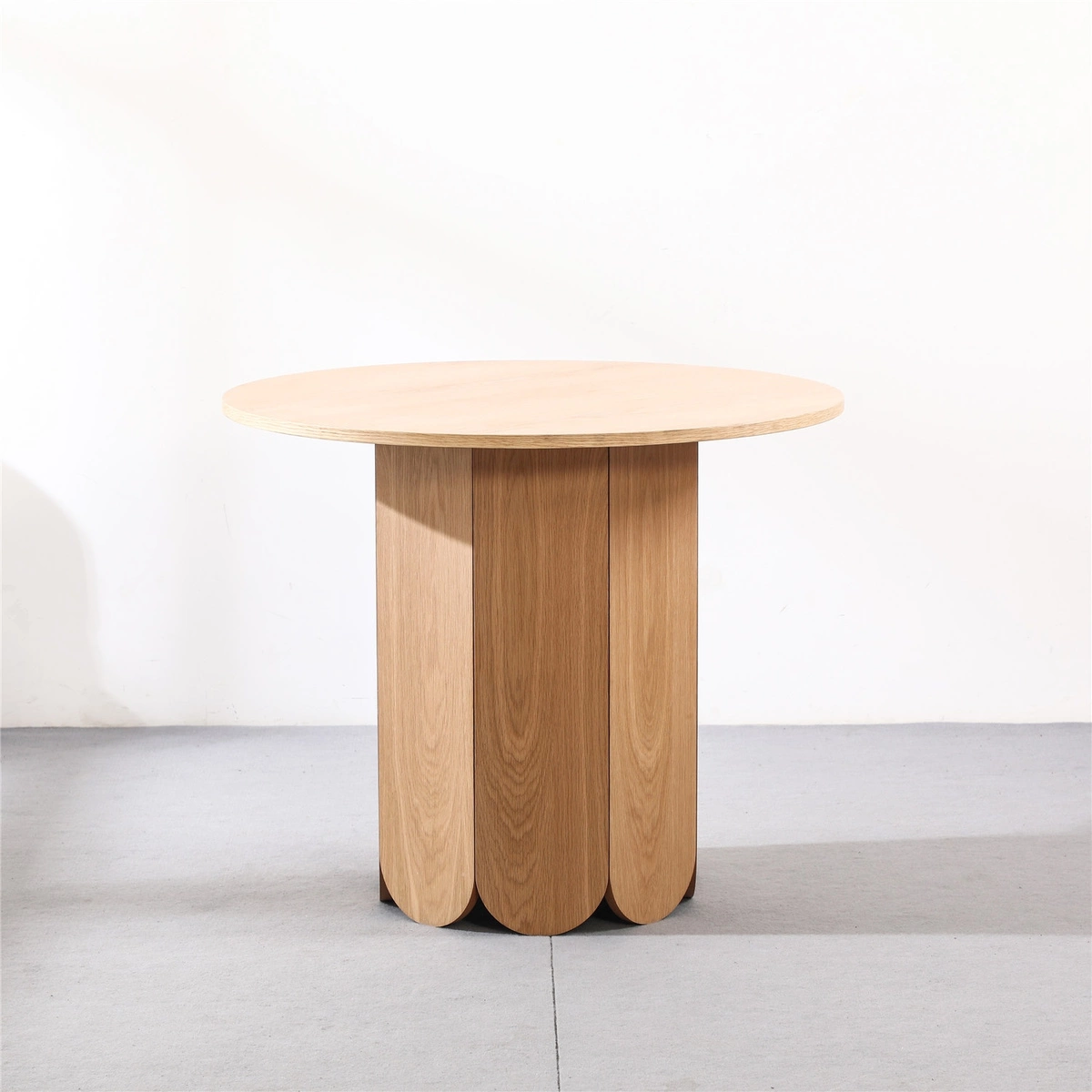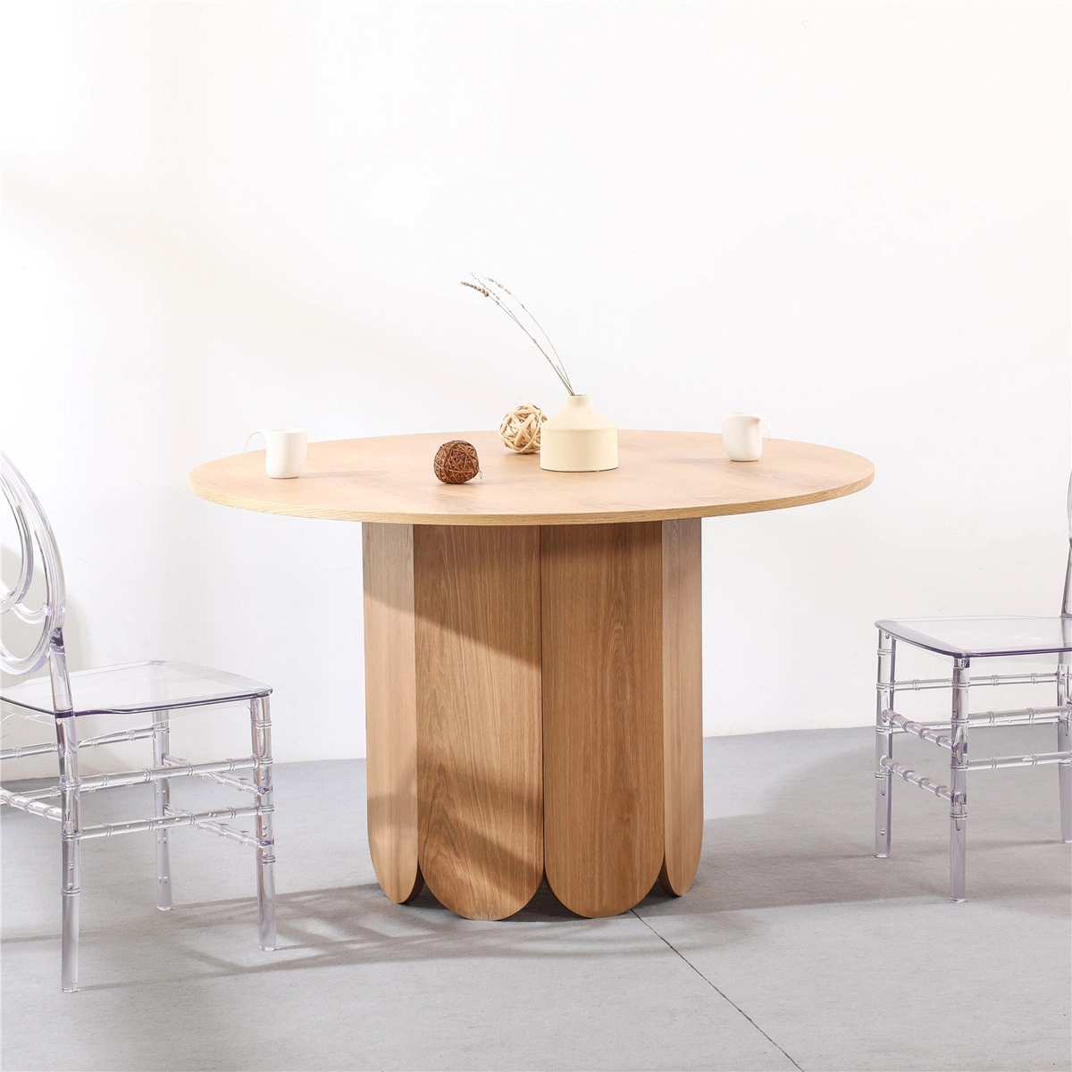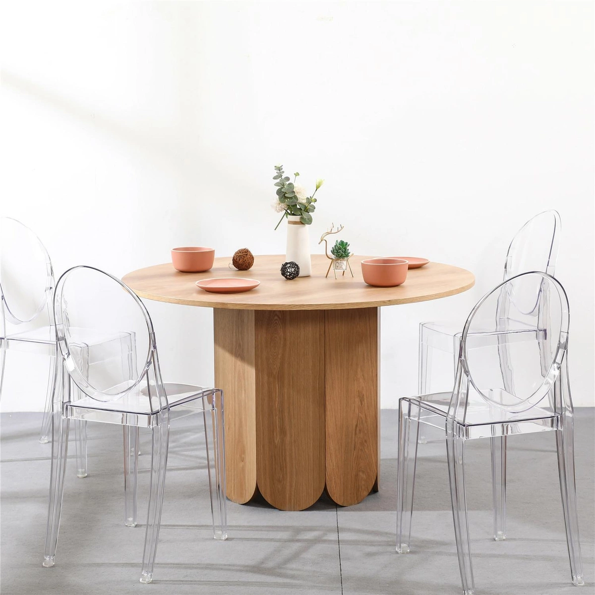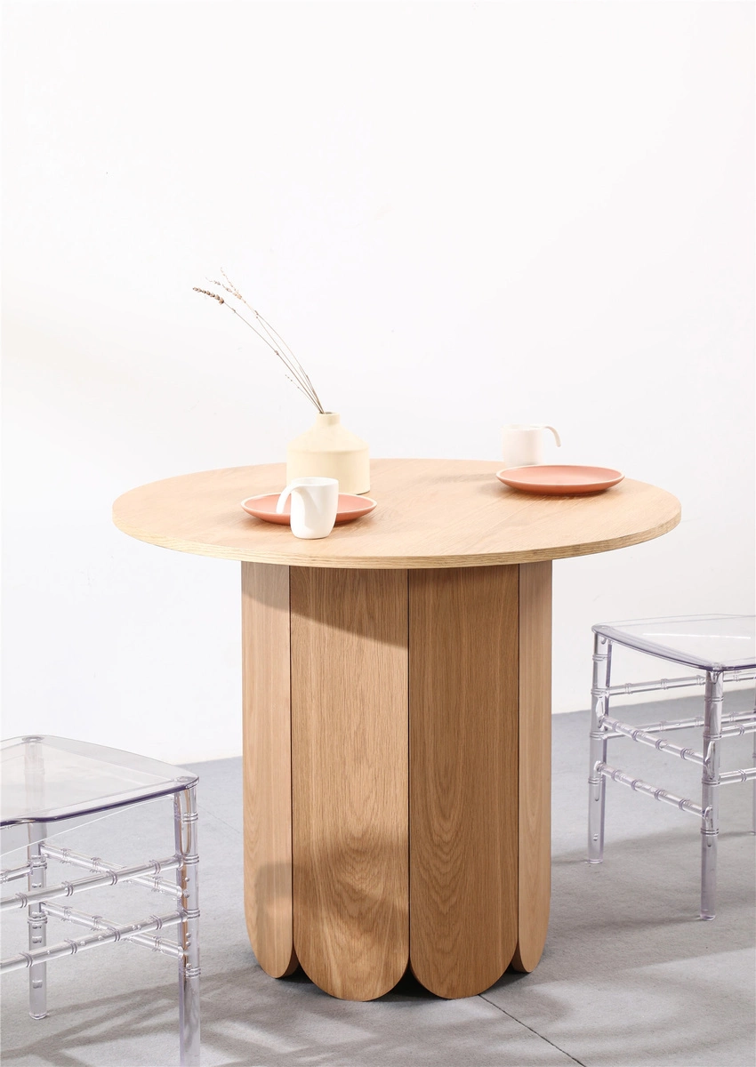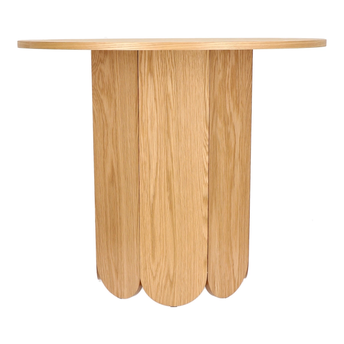 Stół Puro w kolorze dębu to połączenie funkcjonalności ze stylem boho. Designerski, okrągły stół to ponadczasowy mebel, który wpisze się we wnętrza zarówno boho jak i skandynawskie. Stół o okrągłym blacie o średnicy 90 cm wyposażony został w jedną, solidną nogę o przekroju ośmiokąta. Boki nogi stołu o szerokości 20 cm zakończone zostały subtelnym zaokrągleniem. Szeroka, nowoczesna podstawa stołu to bardzo wytrzymała płyta MDF ozdobiona okleiną realistycznie imitującą drewno dębu. Blat stołu o tym samym kolorze współgra z całością. Stół od dołu zabezpieczony został czarnymi stopkami z tworzywa Paczki: 98x99x8;25,0KG, 82x48x22;15,0KG
