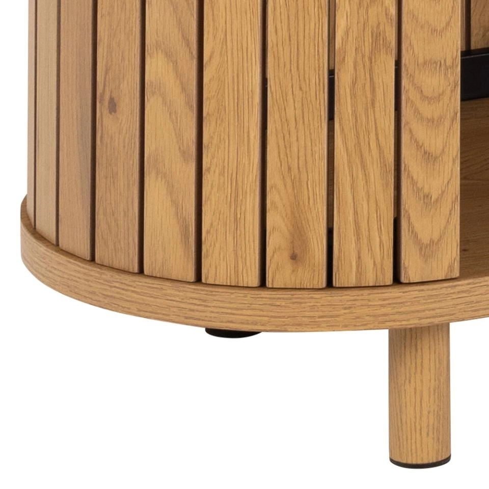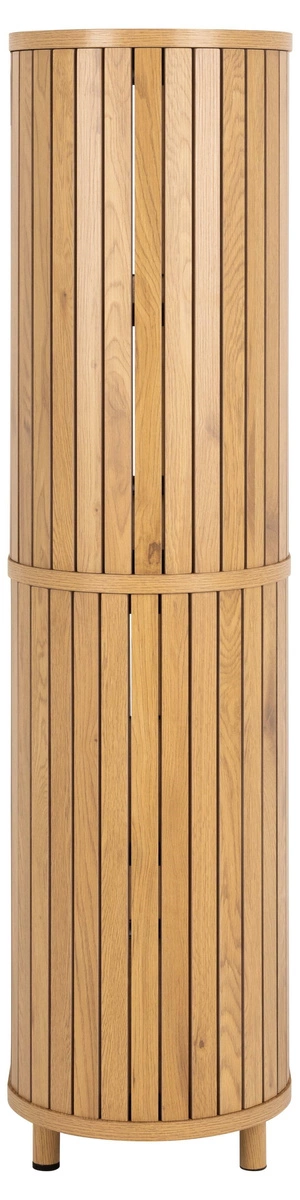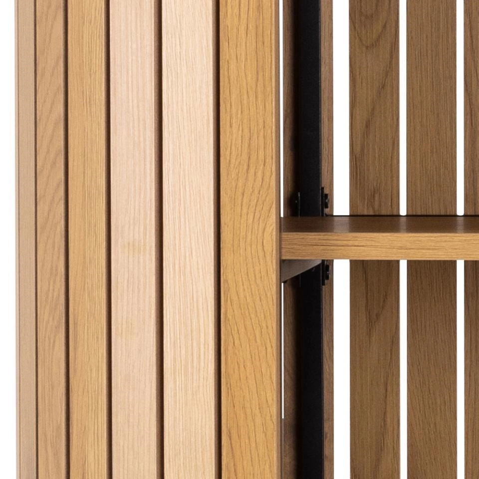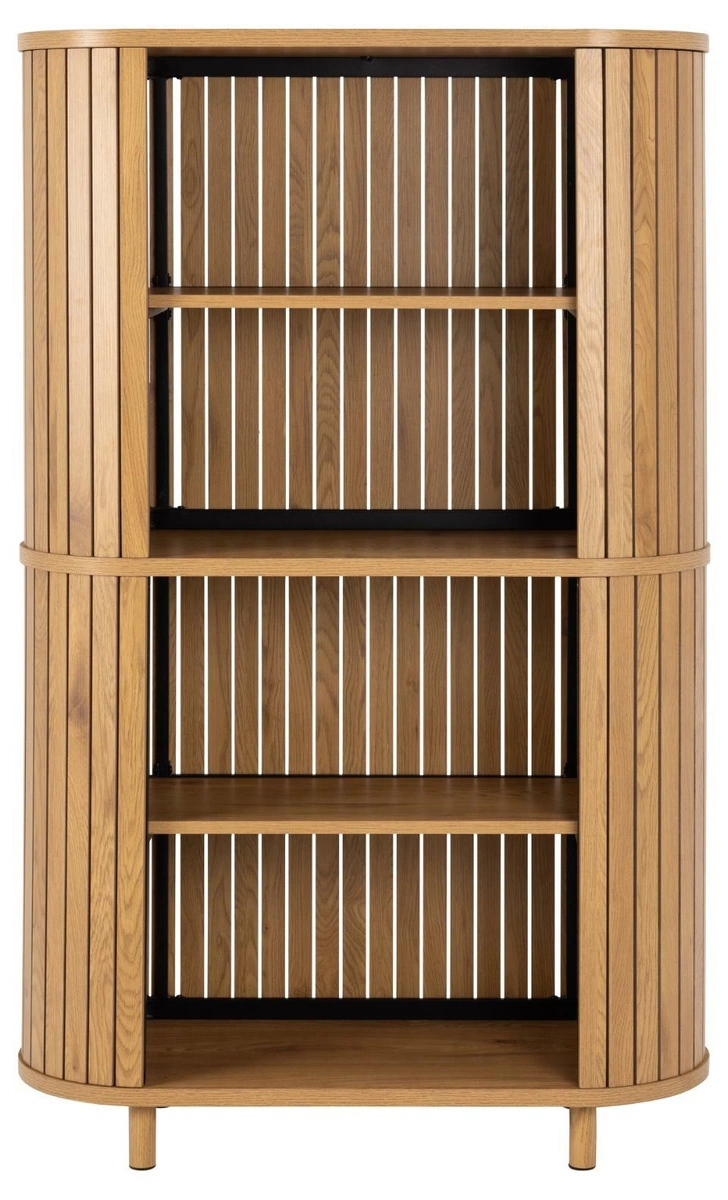 Regał Colima to rama z wytrzymałego MDF i 3 półki z MDF w okleinie o wzorze matowego dzikiego dębu. Regał z lamelami i o obłym kształcie sprawdzi się jako biblioteczka we wnętrzu japandi. Wyskość nóżek 10 cm. Wymaga montażu. Wymiary kartonu: 109x47x24cm i 111x49x13 cm