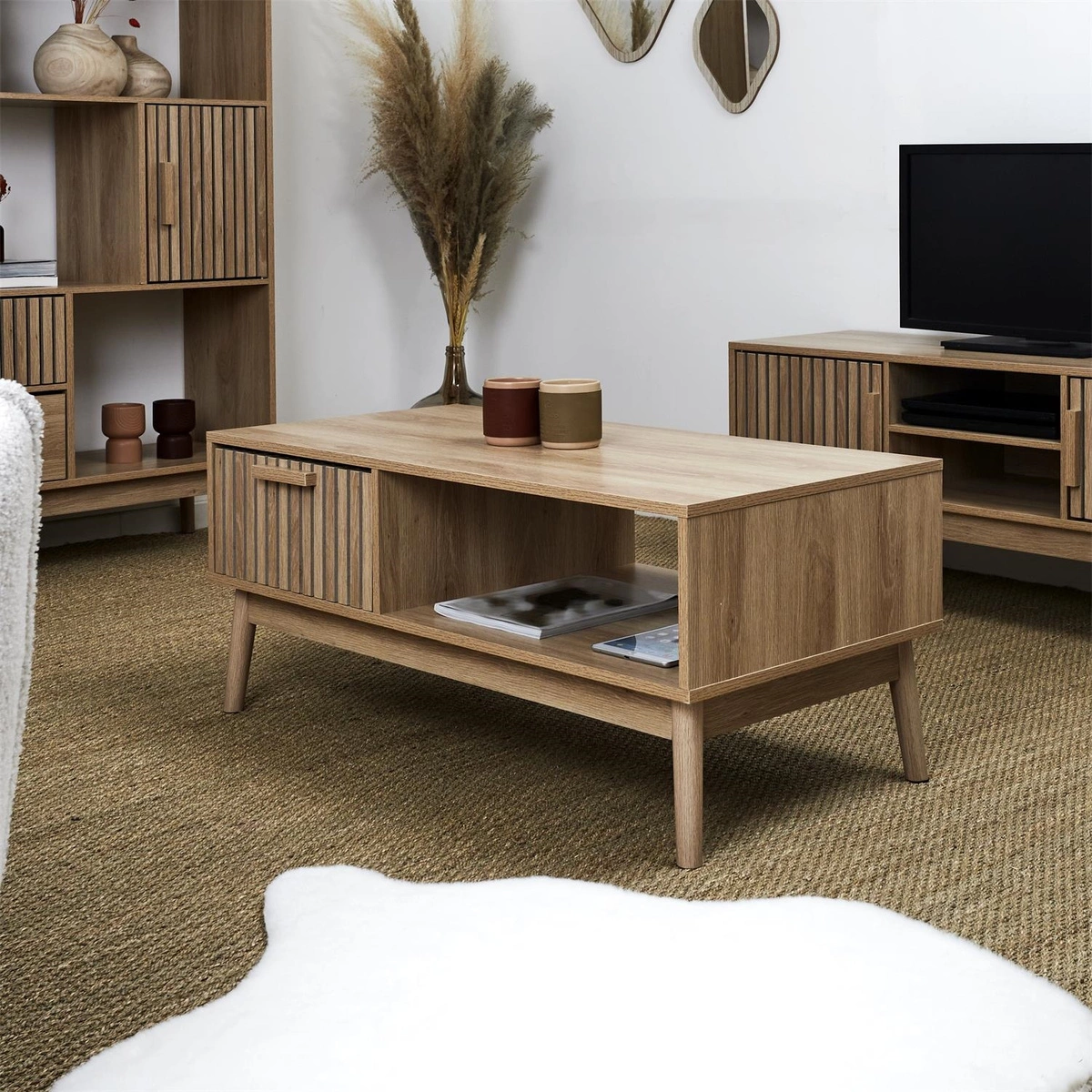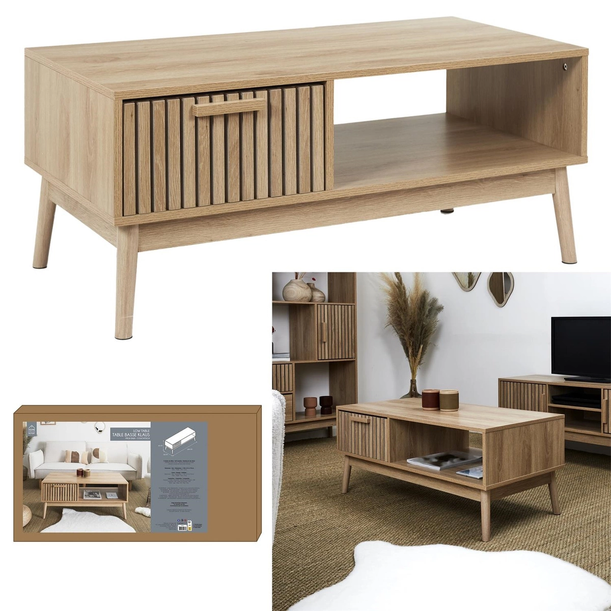 Stolik kawowy z kolekcji Klaus to ponadczasowy mebel ozdobiony lamelami. Idealnie dopełniający komody i regał kolekcji Klaus, stolik sprawdzi się w salonie jako mebel na którym możemy dołożyć książkę lub kawę. Stolik wykonany z płyty MDF pokrytej okleinią imitującą słoje drewna. Nogi stolika wykonane zostały z drewna sosny. Stolik wyposażony został w jedną szufladę na metalowej szynie z rowadnicami kulkowymi.