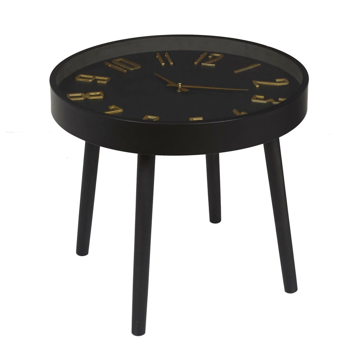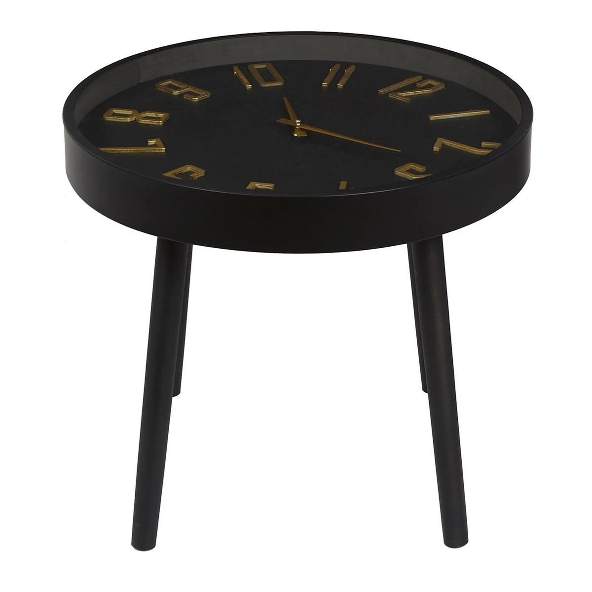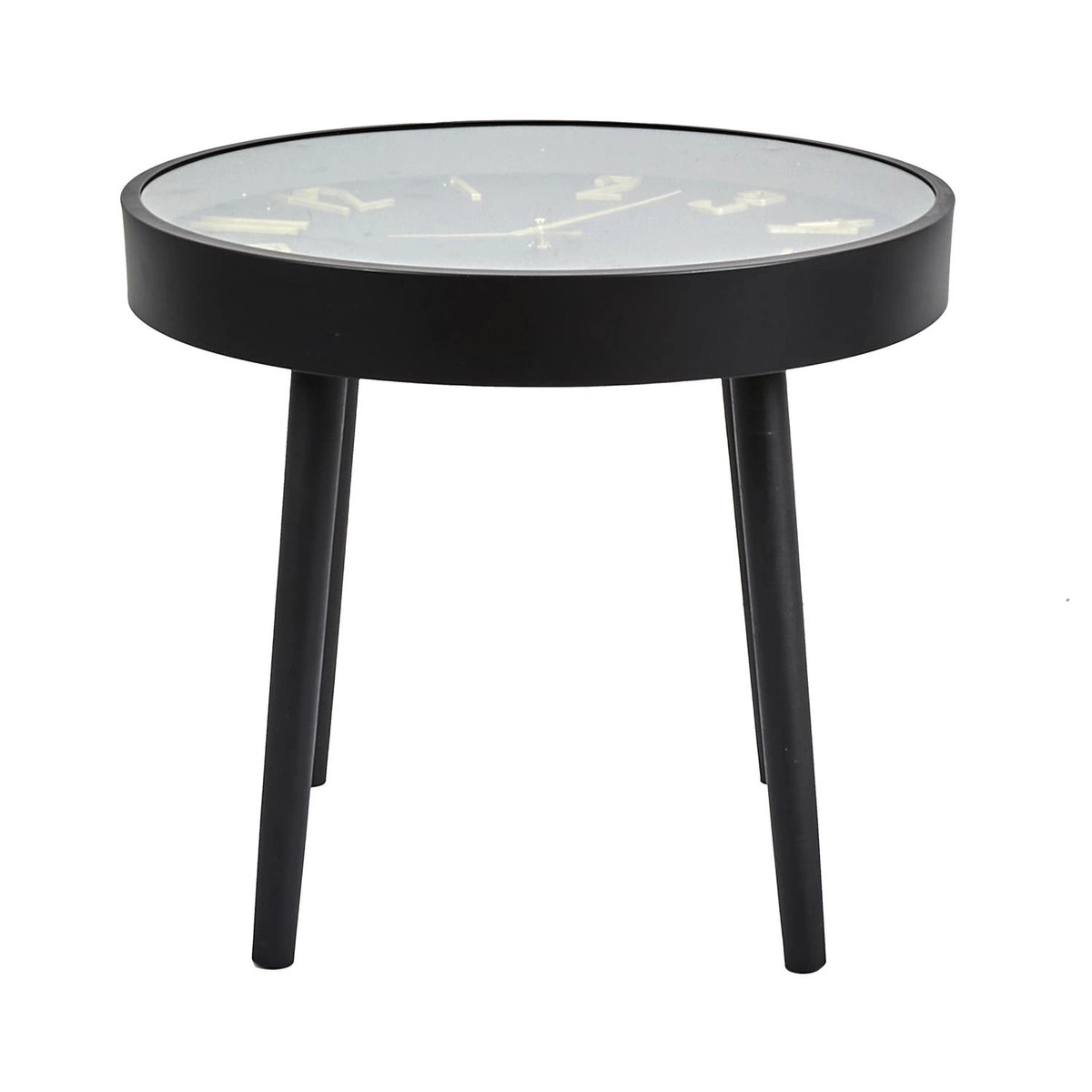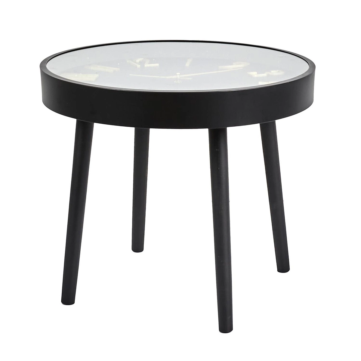Okrągły stolik w którym blatem jest tarcza zegara to zarówno elegancki jak i nietypowy mebel. Czarny stolik wykonany został z drewnianych, sosnowych nóg, Metalowej ramy blatu, szklanego blatu pod którym jest tarcza zegara. Sama tarcza to połączenie płyty MDF oraz metalowych wskazówek. Na baterie (brak w zestawie): R6-AA Wymaga montażu (przykręcenia nóg do blatu) Wymiary kartonu: 52x52x12 cm, Waga: 5kg
