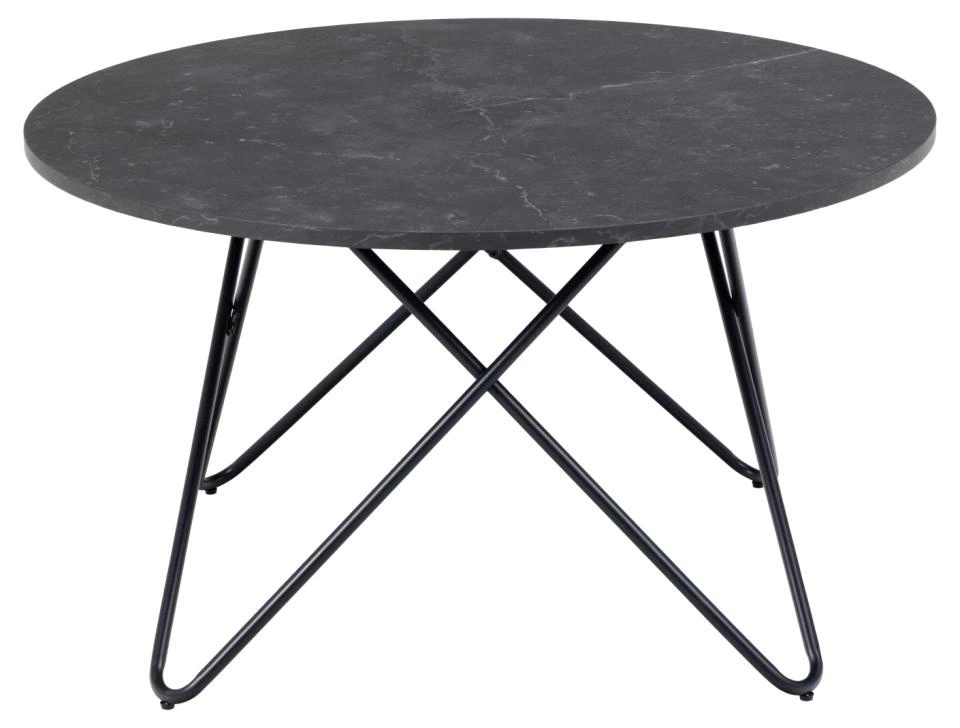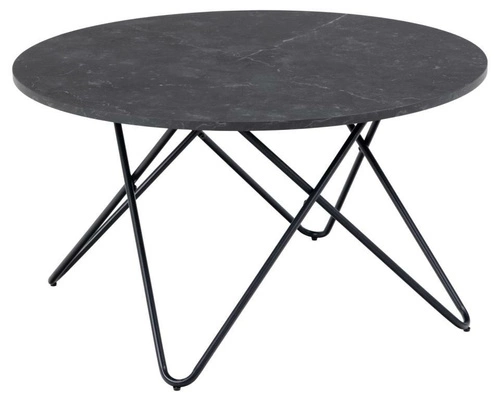 Okrągły stolik kawowy Wyre, blat z płyty MDF i matowej czarnej okleiny, podstawa z drutu z matowej czarnej stali malowanej proszkowo. Ten stolik kawowy powstał z połączenia współczesnego trendu i funkcjonalności. Okrągły blat o wyglądzie czarnego marmuru zapewnia stylową powierzchnię dla małych dekoracji i spoczywa na czarnej geometrycznej drucianej podstawie wykonanej ze stali, dodając figlarnego akcentu. Rezultatem jest intrygujący stolik kawowy, który wyróżnia się zarówno w eklektycznych, jak i minimalistycznych domach.