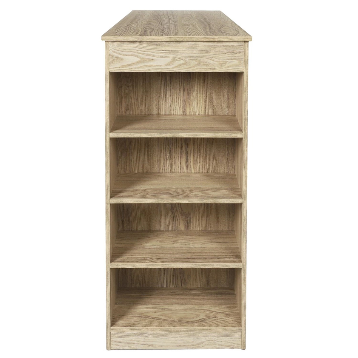 Stół barowy z 4 półkami na bocznej ścianie sprawdzi się w minimalistycznym i nowoczesnym wnętrzu. Stół wykonany z płuty pilśniowej i ozdobioy okleiną imitującą słoje drewna bukowego. Stół sprawdzi się dla dwóch osób podczas śniadania. Wymaga montażu. Max. obciążenie 40 kg