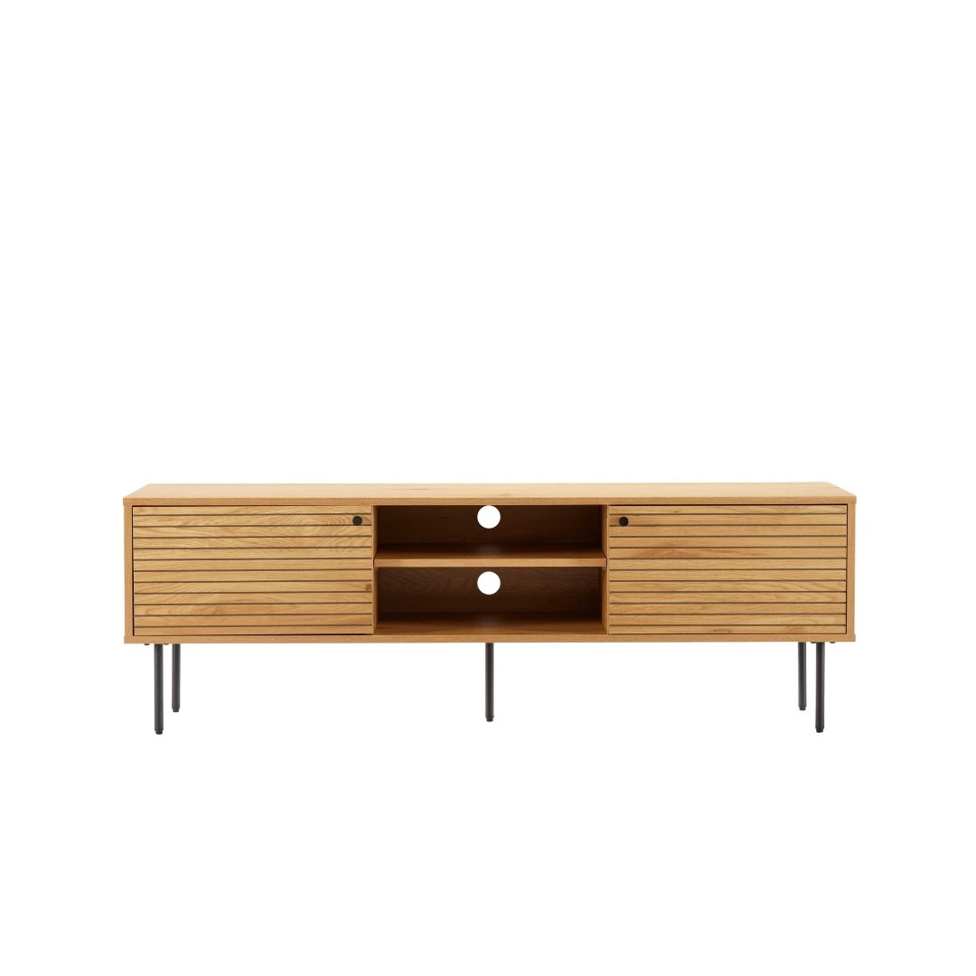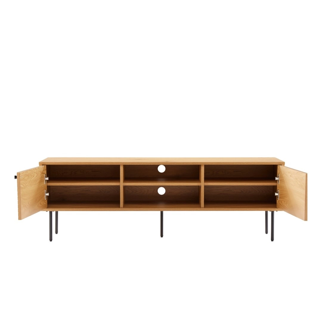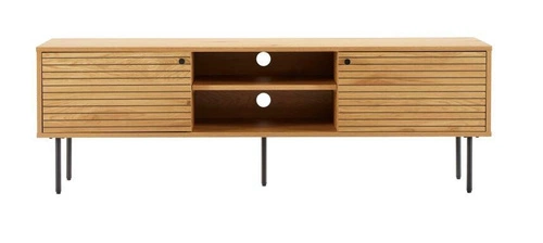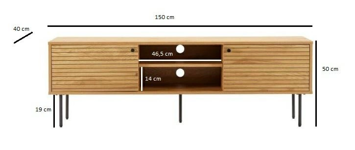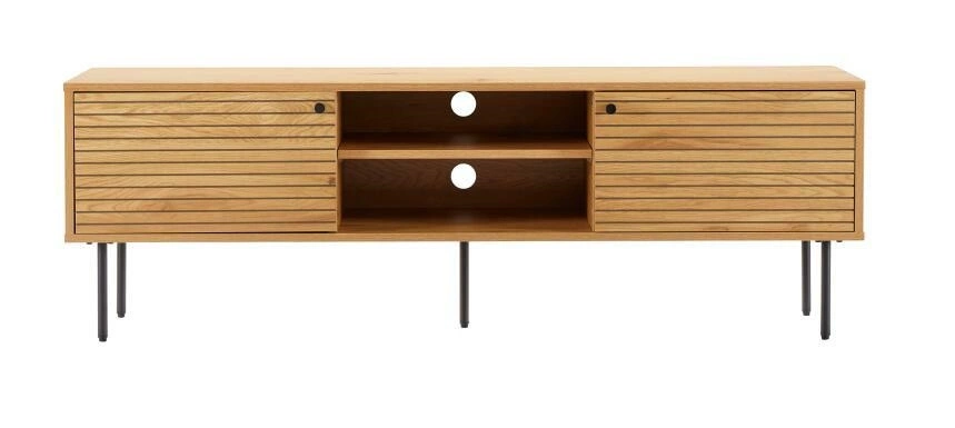 Korpus szafki jak i fornty wykonane zostały z wytrzymałej płyty MDF, która ozdobiona została okleiną imitującą fornir dębowy. Fronty szafek o ciekawym wyflowanym poziomo wzorze wyglądają jak lamele. Każda z szafek wyposażona została w czarny, metalowy uchwyt. Minimalistyczne uchwyty ciekawie korespondują z czarną metalową podstawą komody. Czarne nogi pomalowane zostały proszkowo dzięki czemu są odporne na uderzenia, np podczas odkurzania. Nogi komody zakończone zostały stopkami z tworzywa, aby zapobiec rysowaniu się podłogi pod meblem. Szafka wymaga montażu Wymiary kartonu: 161x48x13 cm