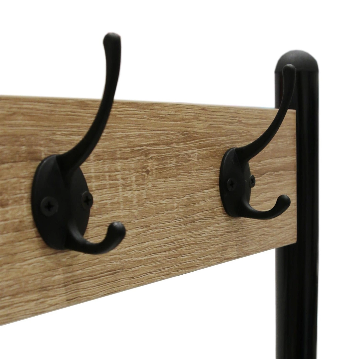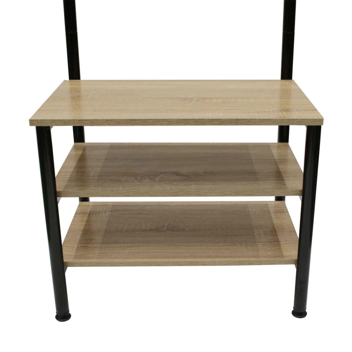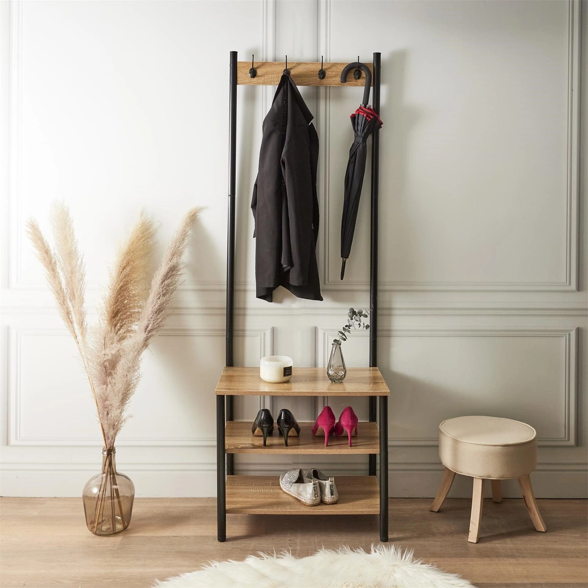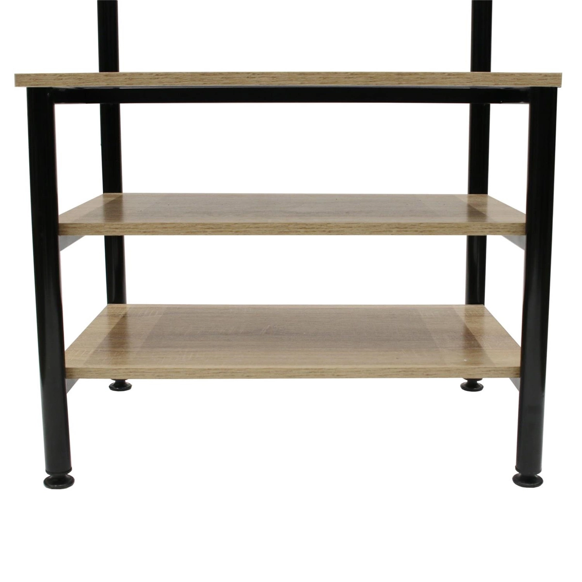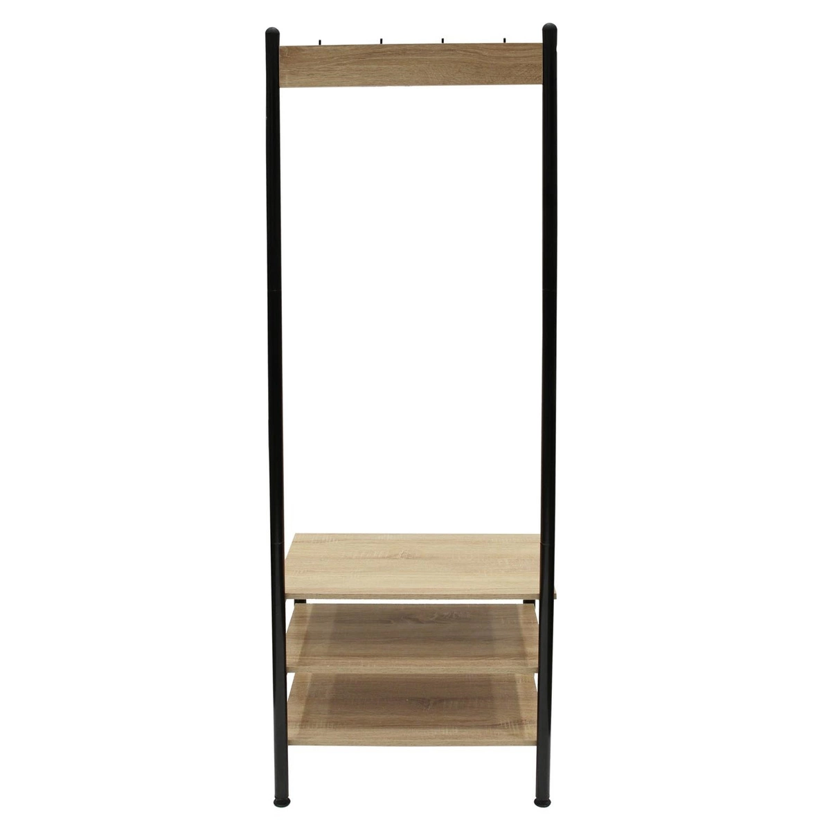 Wieszak do przedpokoju z 3 półkami w stylu loftowym to idealny mebel do wnętrza, które chcemy w łatwy i szybki sposób przemeblować. Wieszak wykonany z płyty MDF o laminacie imitującym buk oraz metalowej, czarnej malowanej proszkowo ramy. Cztery haki na kurtki o ciekawym loftowym kształcie dodają wieszakowi ciekawego wyglądu. Wymaga montażu Max obciążenie na 1 półkę: 10kg Max. obciążenie na haki: 25kg Wymiary kartonu: 41,5x14,5x65,5cm. Waga: 11kg