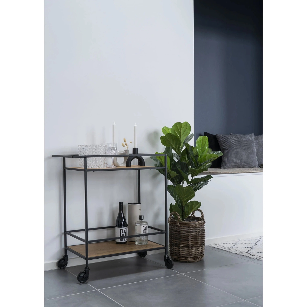 Wózek z serii mebli Vita to skandynawska prostota, która urzeknie każdego minimalistę. Wózek wykonany z metalowej, malowanej proszkowo na czarno ramy jest stabilny. Wózek wyposażony został w kółka z tworzywa, które pomagają w przesuwaniu mebla. Dzięki kółkom możemy łatwy sposób zaserwować drinki lub deser na tarasie, lub w ogrodzie. Półki Wózka wykonane zostały z płyty wiórowej, ozdobionej foliową okleiną imitującą drewno dębu. Wózek wymaga samodzielnego montażu. Wymiary kartonu: 7 x75 x43 cm waga 8,5 kg