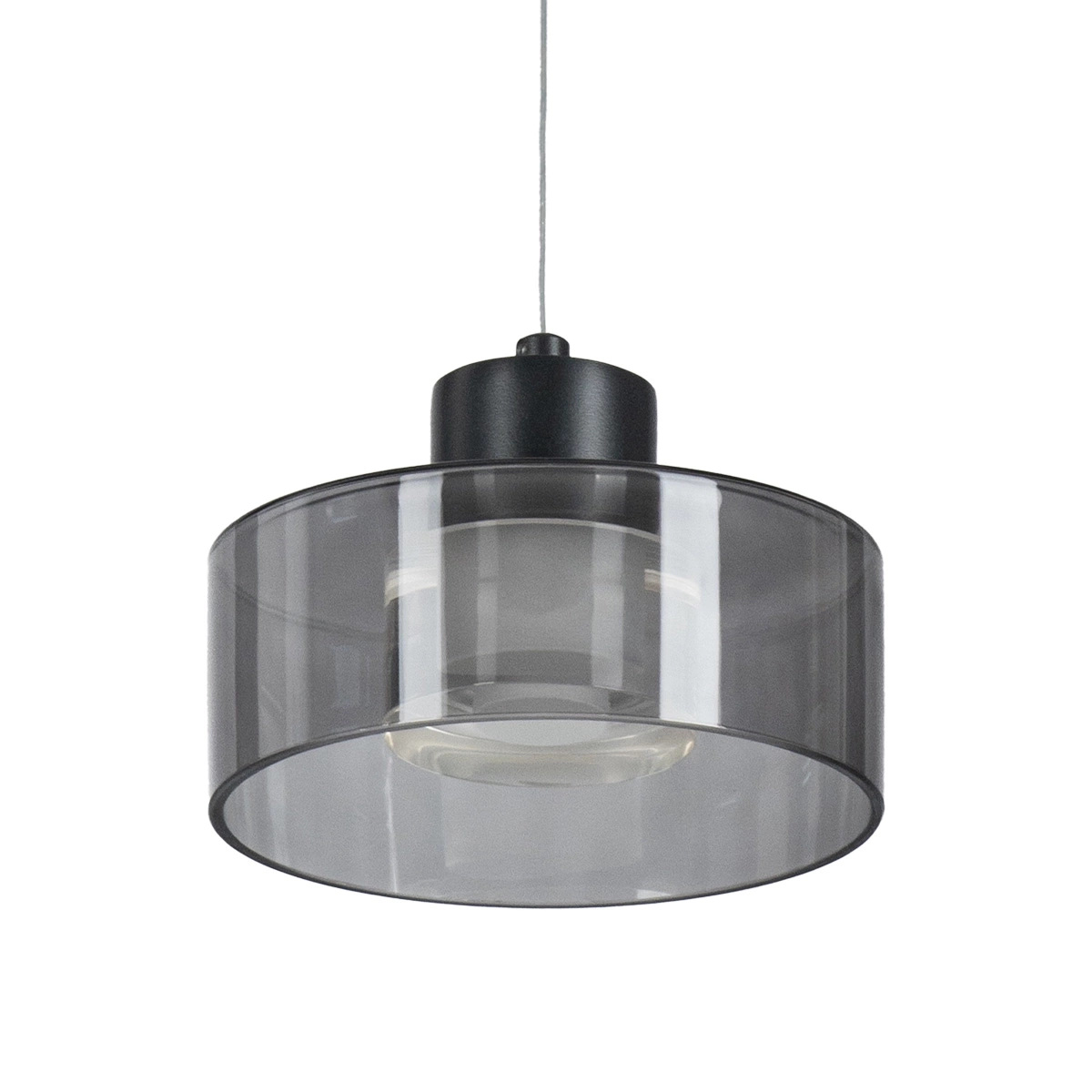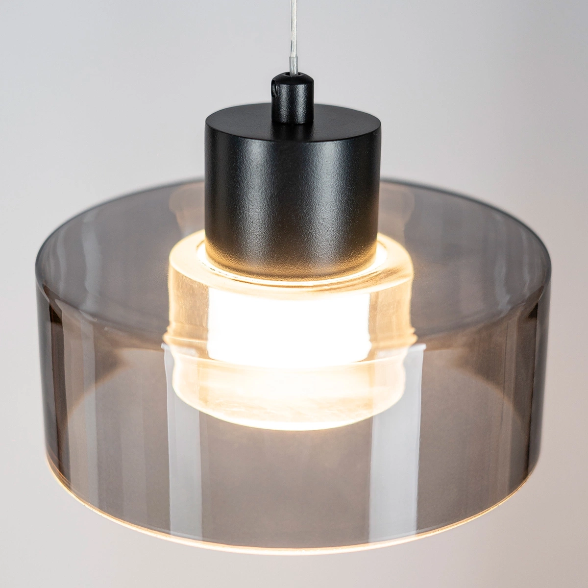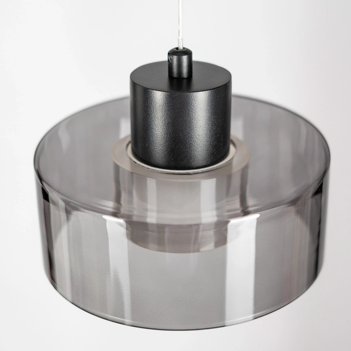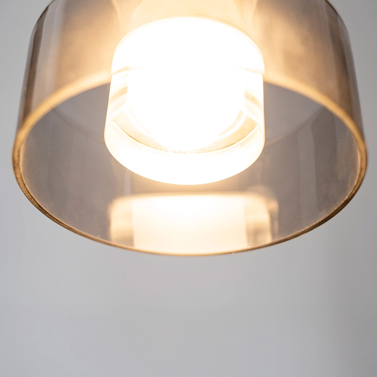 Cylindryczny klosz z przydymionego szkła nadaje lampie FORMA lekkości i elegancji. Półtransparentna struktura delikatnie filtruje światło, tworząc przytulną, nastrojową atmosferę. Czarna podsufitka i grafitowe detale podkreślają nowoczesny, nieco industrialny charakter – idealny do wnętrz w stylu loft, japandi i minimalistycznym.