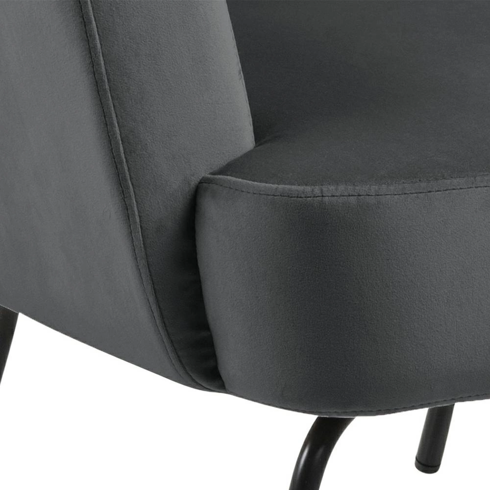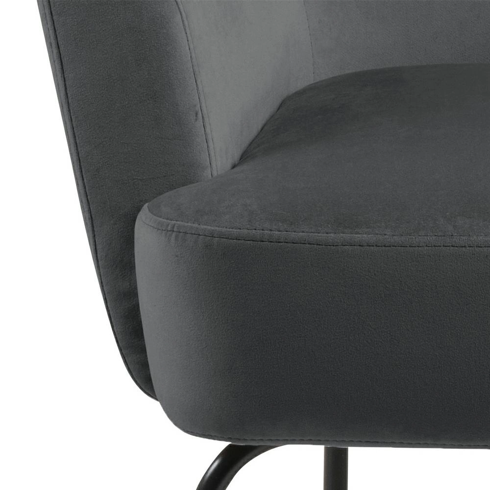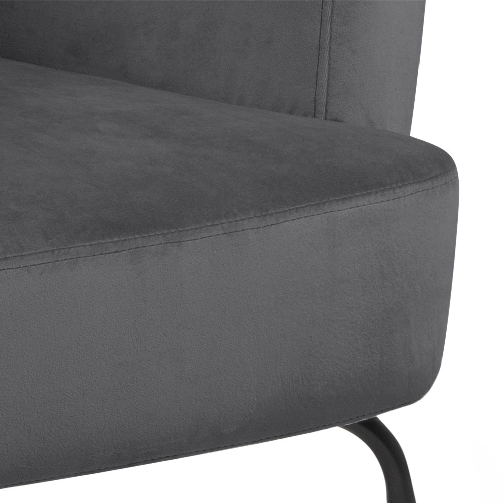Fotel Felissa to elegancki mebel w stylu glamour. Cztery metalowe, malowane proszkowo nogi zabezpieczone są od spodu specjalnymi nakładkami. Siedzisko i oparcie wykonane jest z pianki poliuretanowej. Fotel tapicerowany jest przyjemną w dotyku tkaniną VIC fabric dark grey 28. Posiada komfotowe w użyciu podłokietniki. Fotel Melissa jest idealny do salonu lub poczekalni w biurze. Wymiary: 75x75x83 cm Waga: 12kg