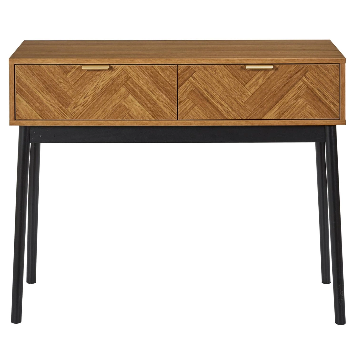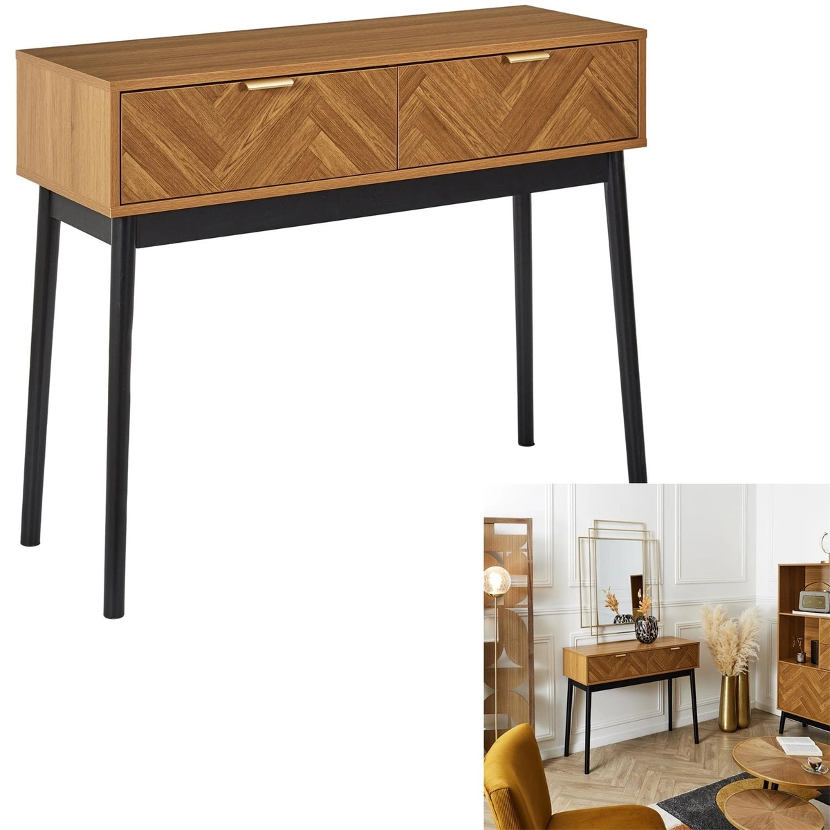 Konsola Felix to połączenie stylu retro z nowoczesnymi rozwiązaniami. Nogi konsoli lekko rozchodzące się na zewnątrz nawiązują do stylu skandynawskiego. Stolik to połączenie ciekawych frontów w jodełkę oraz czarnych prostych nóg. Konsola wyposażona jest w 2 szuflady na szynach kulkowych. Uchwyty to polakierowane na złoty kolor metalowe rączki. Konsola wymaga montażu. Waga 19kg Materiał: nogi drewno sosnowe polakierowane na czarno Korpus i fronty: płyta wiórowa ozdobiona okleiną imitującą dąb Max. obciążenie blatu 40kg