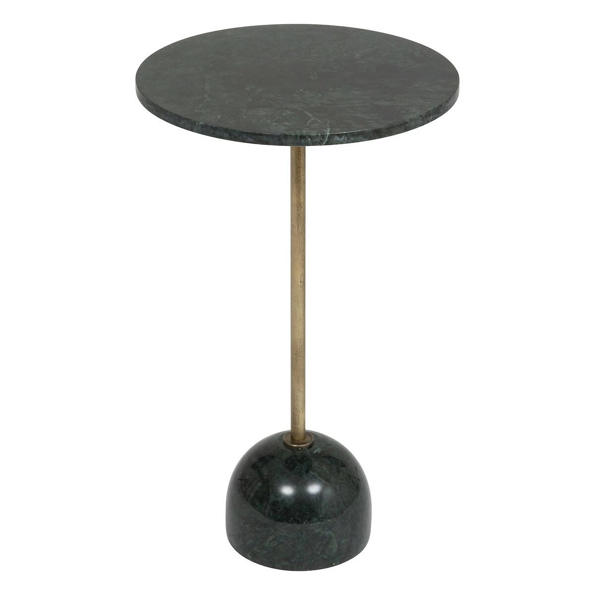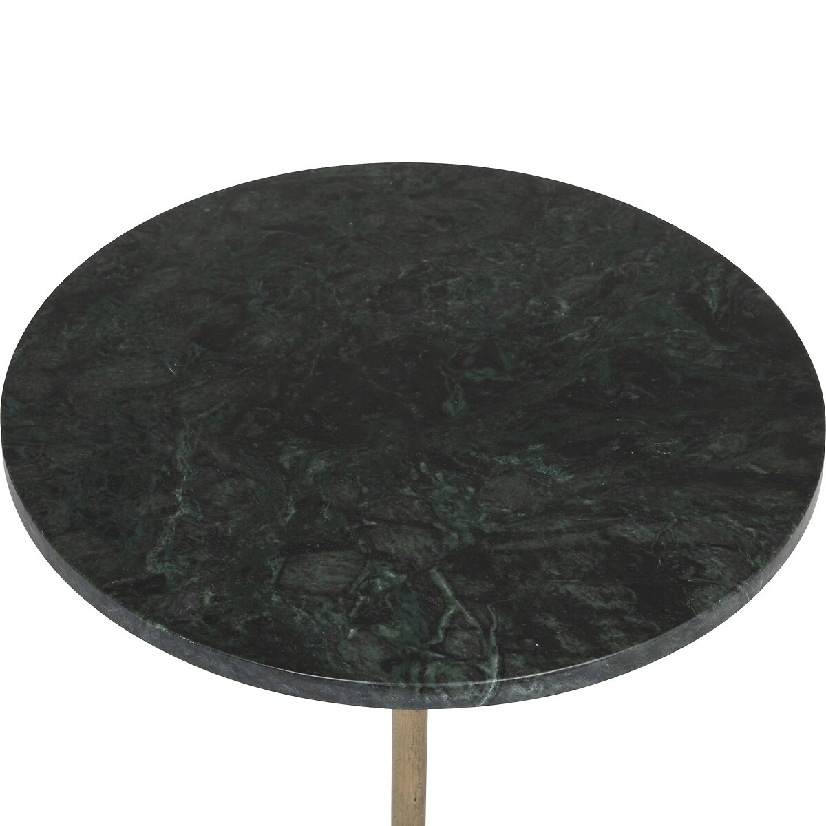 Okrągły, minimalistyczny stolik z marmuru Nema to połączenie zielonego kamienia oraz metalowej złotej nogi. Okrągły blat stolika oraz podstawa nogi wykonane są z czciemnozielonego błyszczącego kamienia. Noga stolika to metal pomalowany na złoty kolor i przetarty w celu stylowego postarzenia. Materiał: marmur, metal, Wymiary kartonu: 63x44,5x22,5cm, Waga: 11.740