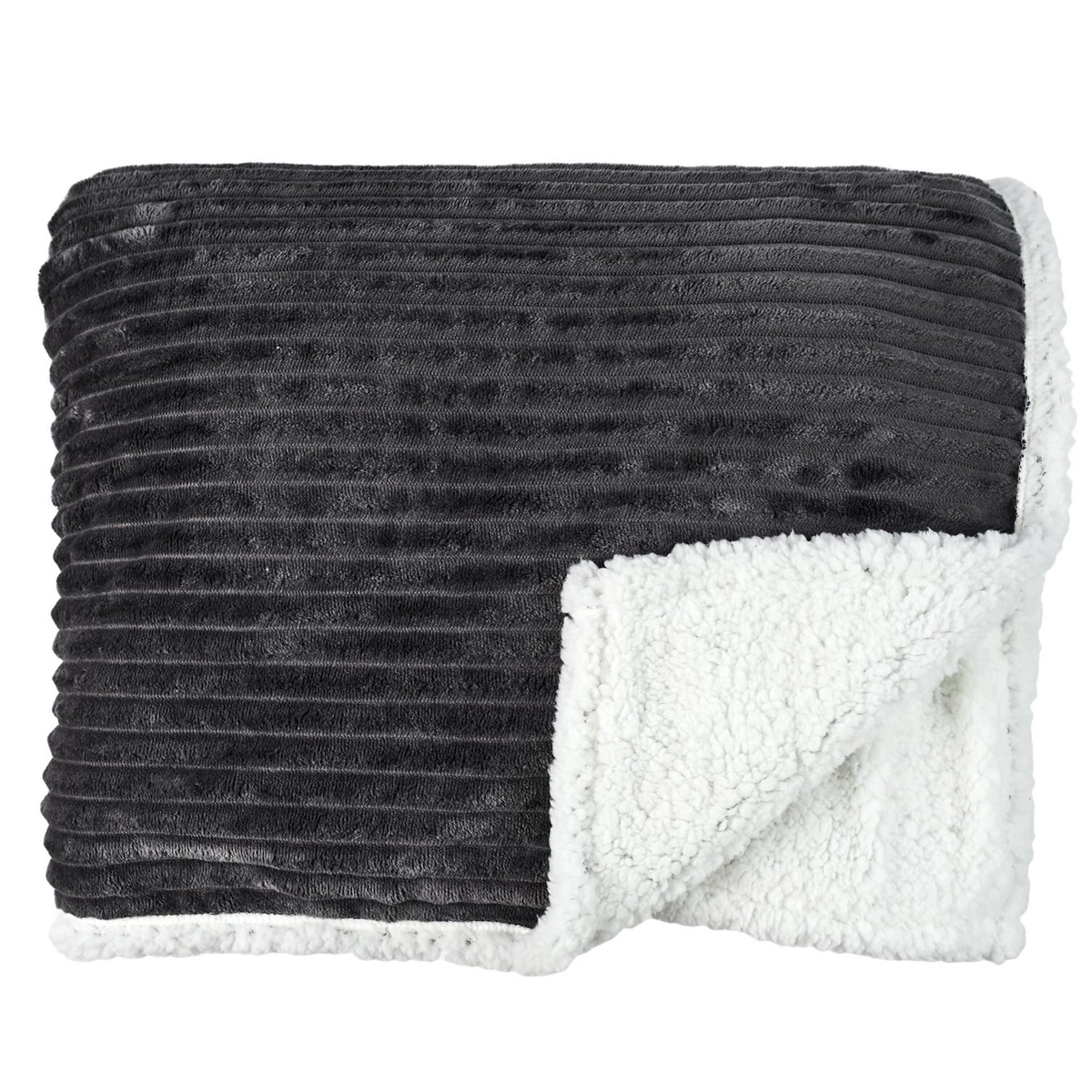 Bardzo gruby koc Sherpa z szarej prązkowanej tkaniny, obszyty został z drugiej strony białą miękką pluszowa tkaniną. Uzycie grubych i ciepłych materiałów sprawia, że koc jest bardzo gruby aż 6cm a przez co daje dużo ciepła i miękkości. Koc sprawdzi się jako okrycie podczas chłodnego wieczoru ale może być również zabezpieczeniem podłogi bla bawiących się dzieci.