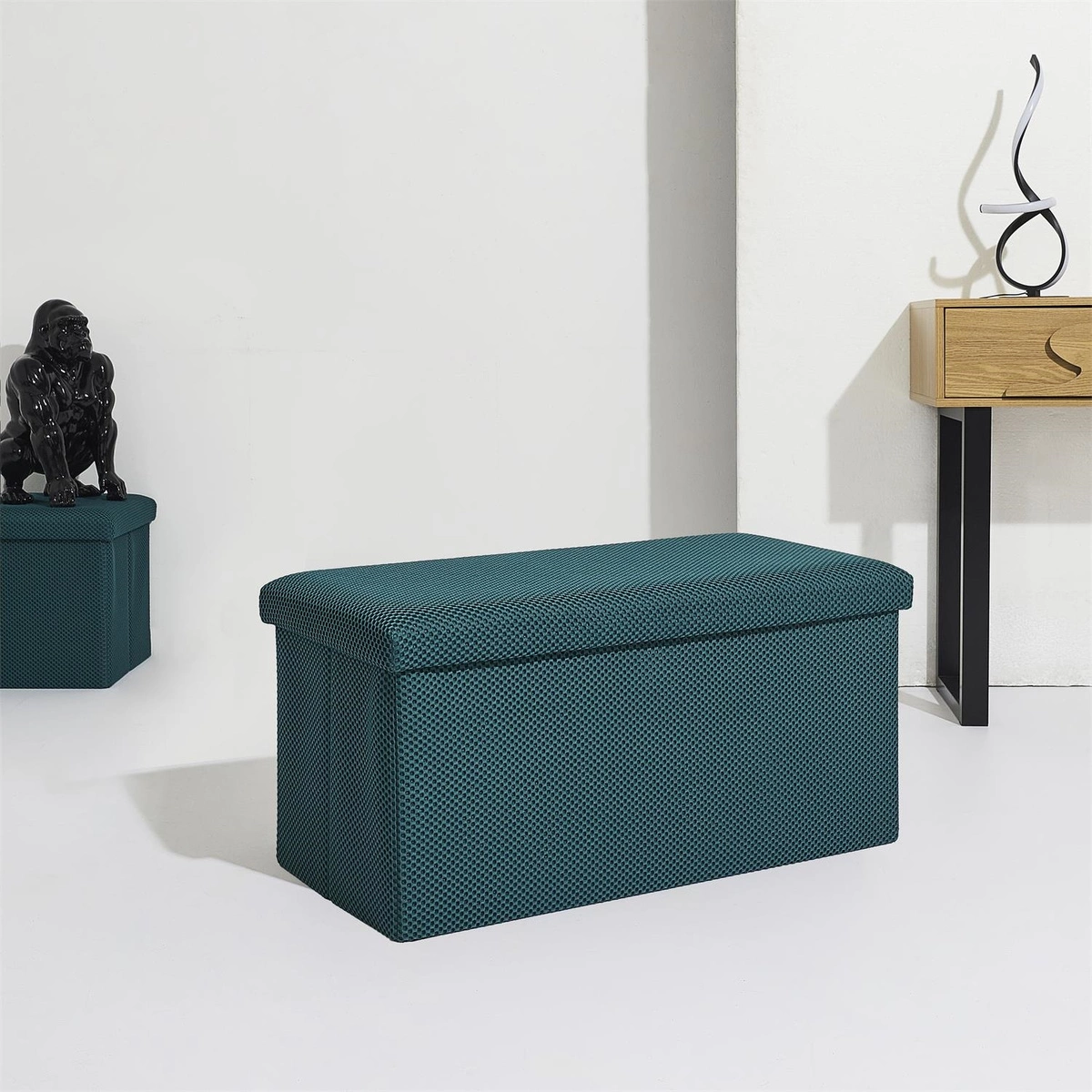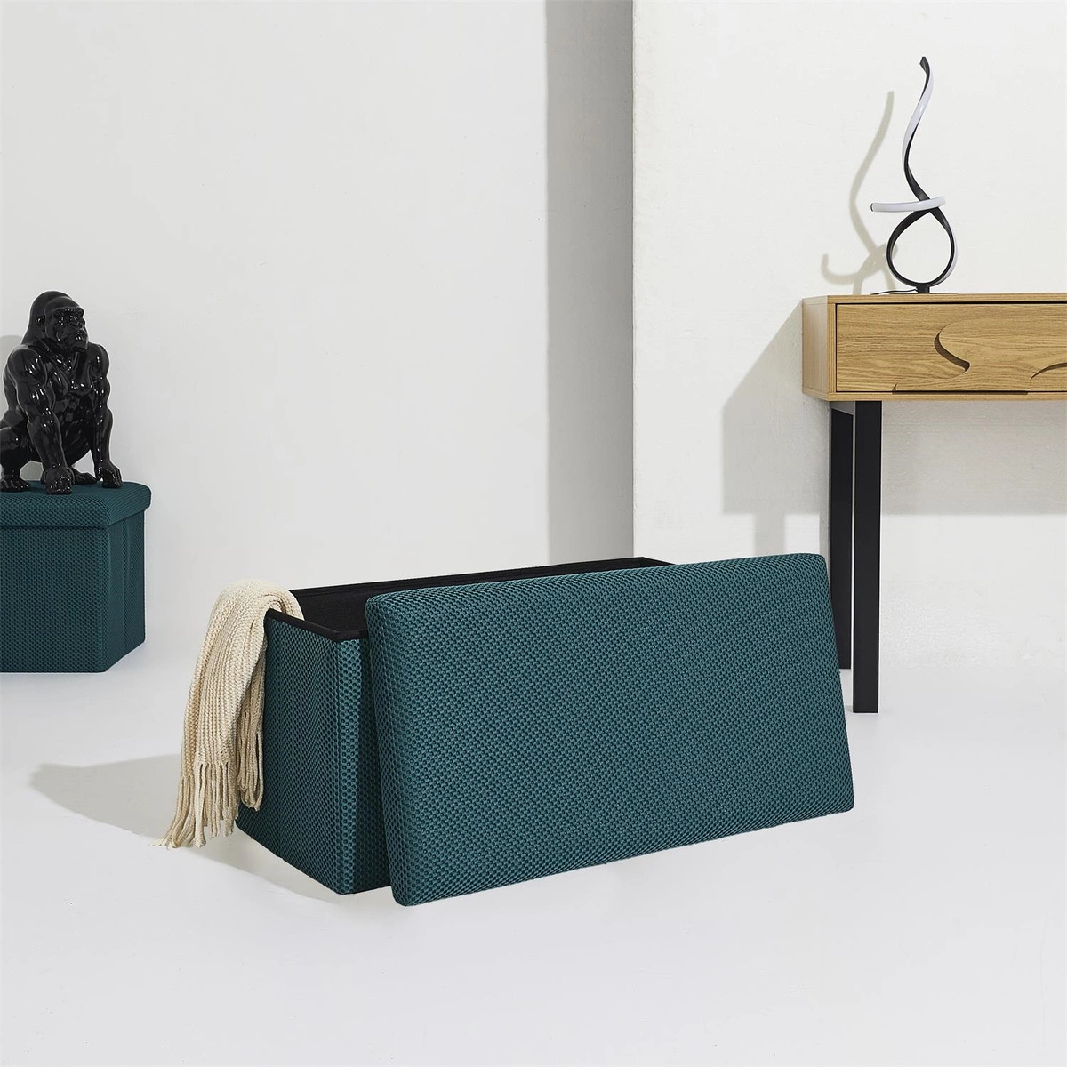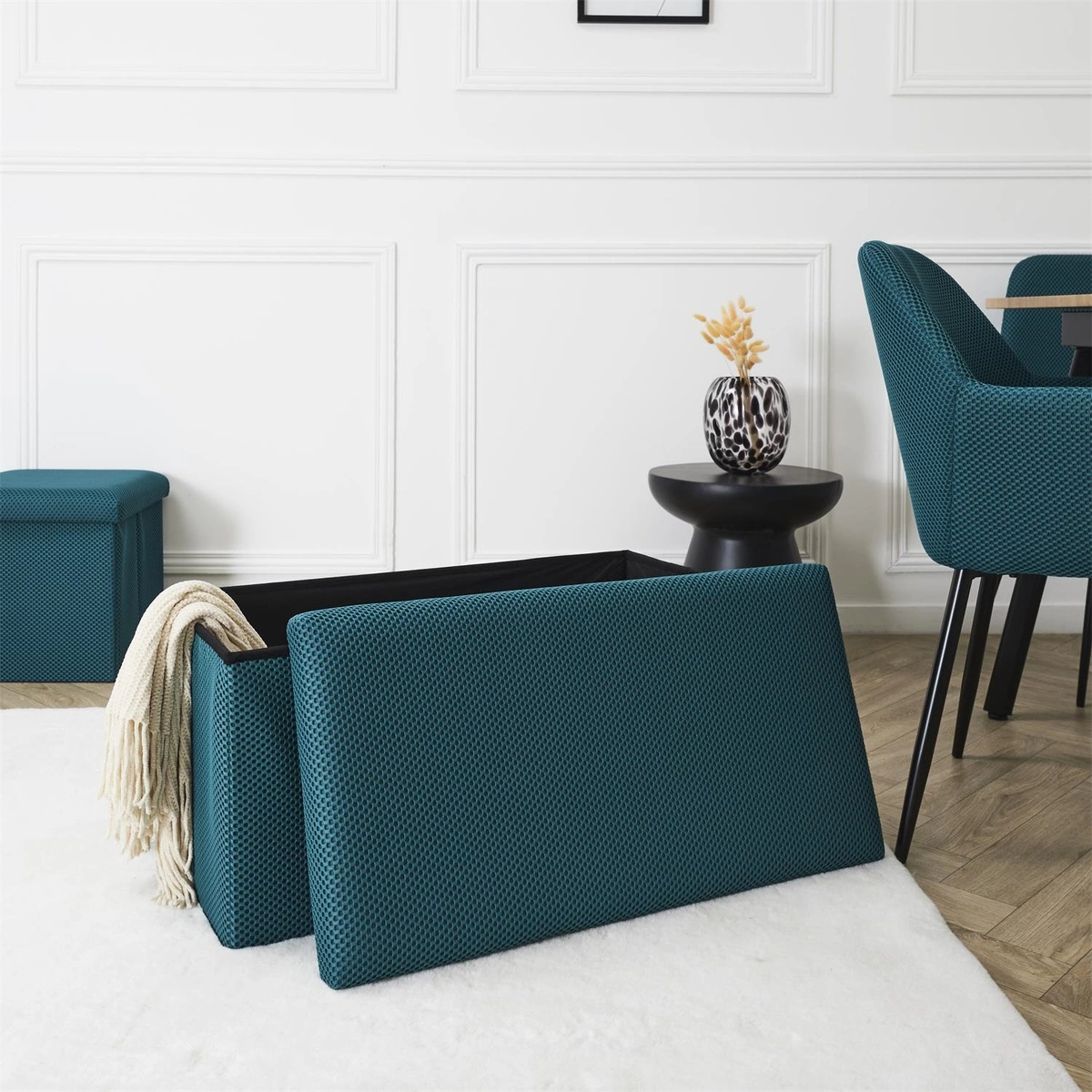 Składana pufa ze schowkiem to must have każdego mieszkania studenta lub osób, które potrzebują dodatkowego siedziska oraz miejsca do przechowywania. Pufa wykonana ze stelaża z wytrzymałej płyty MDF, która gwarantuje maksymalne dopuszczalne obciążenie mebla aż do 110kg. Pufę można złożyć gdy jej nie używamy. Po rozłożeniu natomiast daje nam sporo miejsca do przechowywania zarówno mniejszych rzeczy jak i sporych takich jak koce, buty lub książki. Pufa ozdobiona została ciekawą trójwymiarową tkaniną. Tkanina 100% poliester.