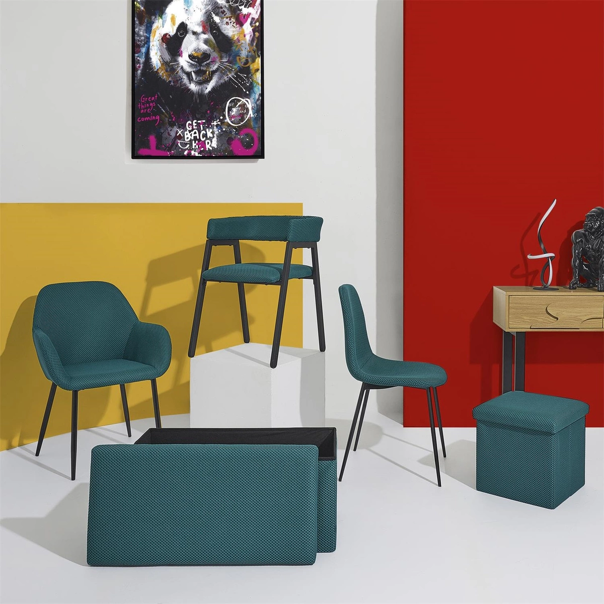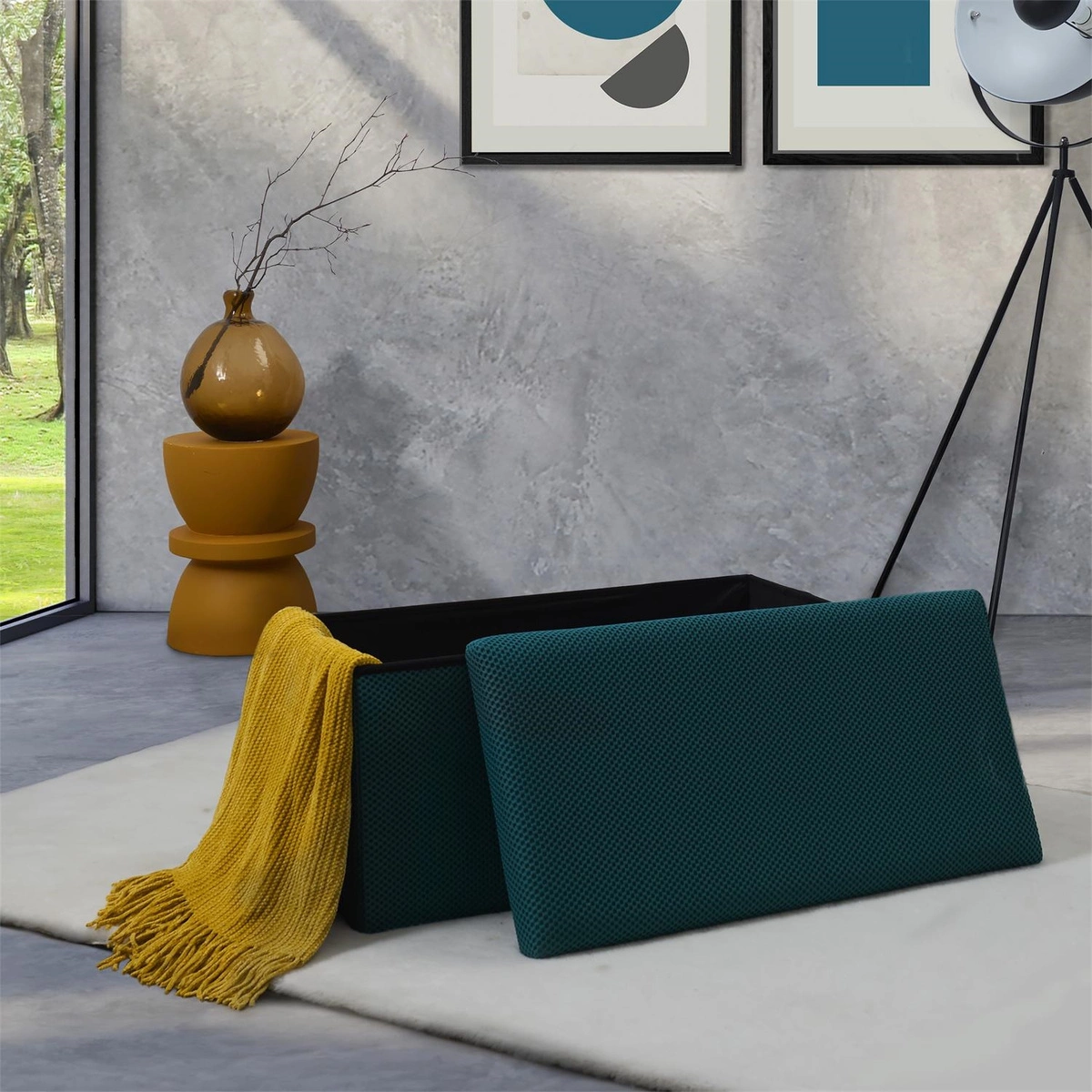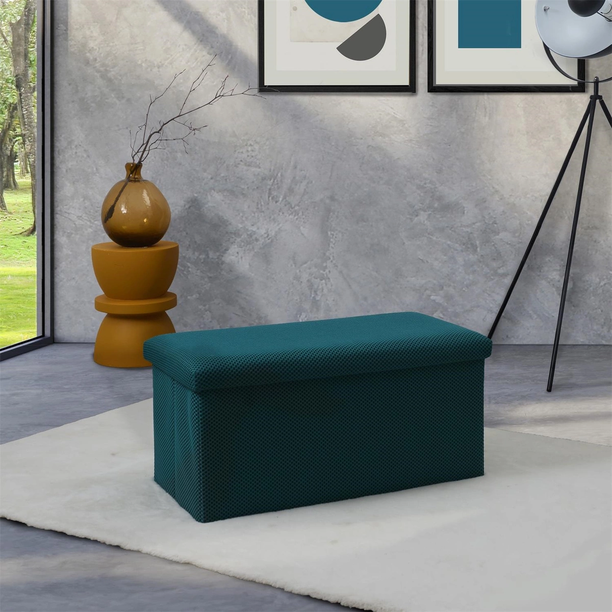 Składana pufa ze schowkiem to must have każdego mieszkania studenta lub osób, które potrzebują dodatkowego siedziska oraz miejsca do przechowywania. Pufa wykonana ze stelaża z wytrzymałej płyty MDF, która gwarantuje maksymalne dopuszczalne obciążenie mebla aż do 110kg. Pufę można złożyć gdy jej nie używamy. Po rozłożeniu natomiast daje nam sporo miejsca do przechowywania zarówno mniejszych rzeczy jak i sporych takich jak koce, buty lub książki. Pufa ozdobiona została ciekawą trójwymiarową tkaniną. Tkanina 100% poliester.