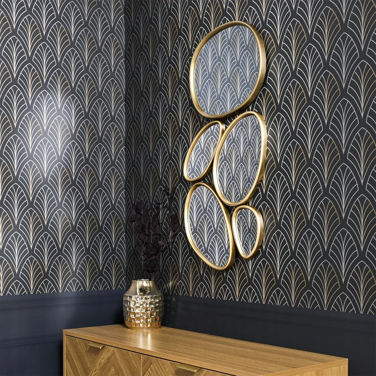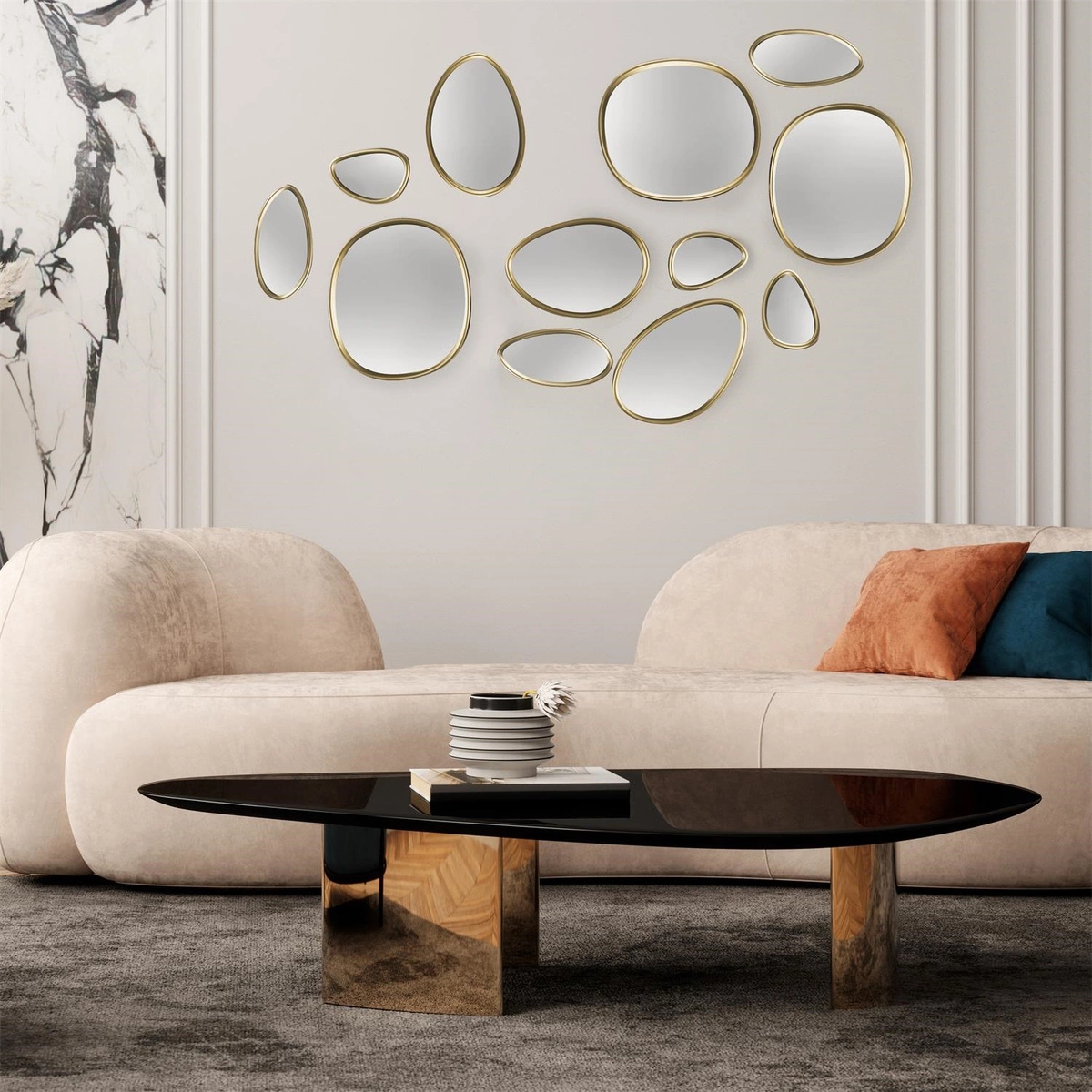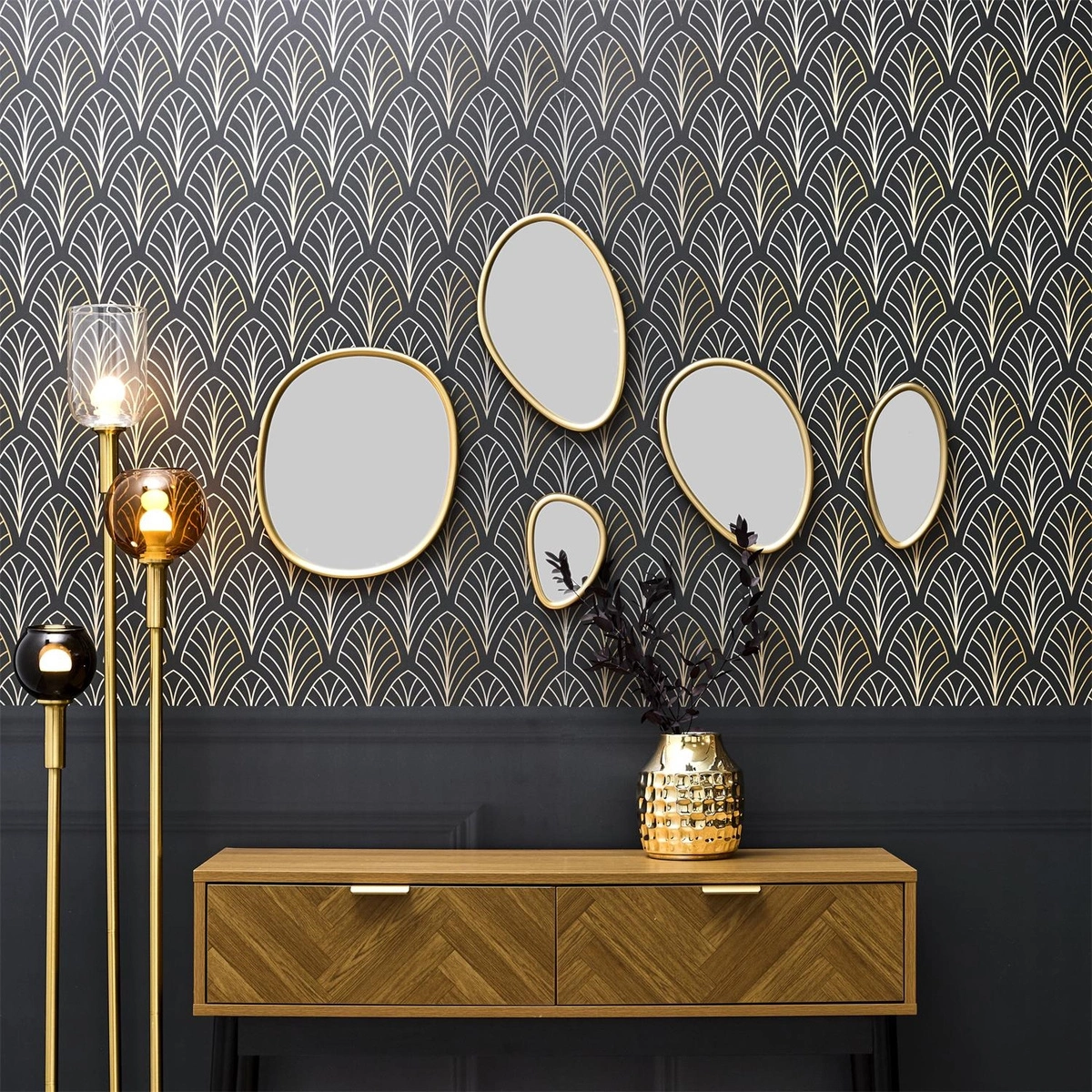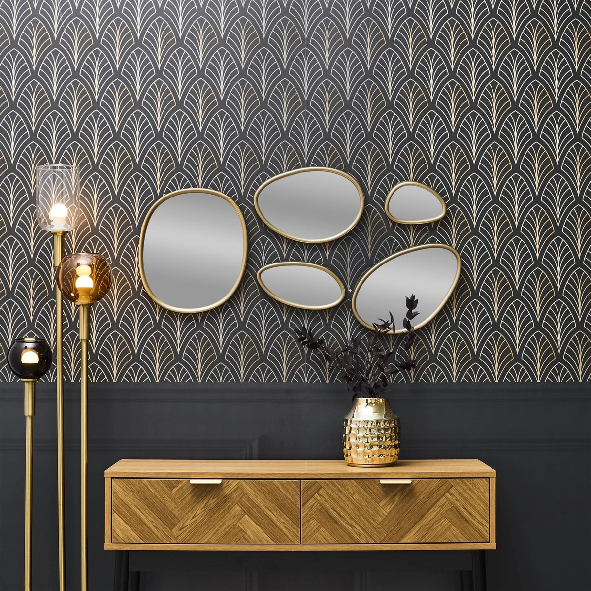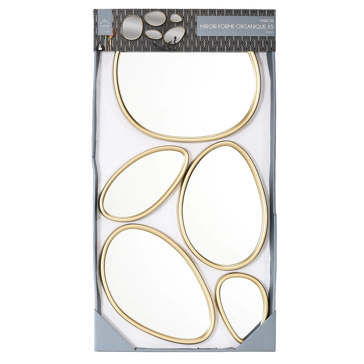 Zestaw 5 luster o organicznych kształtach. Wykonane z tworzywa sztucznego ramki w kolorze złotym dodają nowczesnego i ponadczasowego wyglądu. Tafla luster wykonana ze szkła. Tył luster wyposazony został w uniwersalny zaczep, który pozwala powiesić lustra w pionie jak i w poziomie.