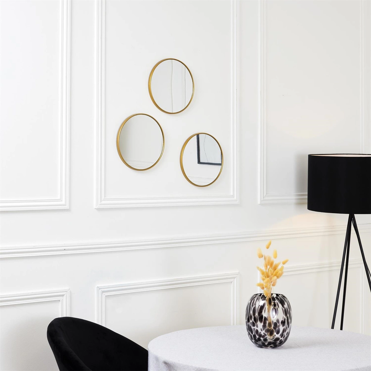 Zestaw trzech okrągłych luster o średnicy 26cm. Lustra wykonane zostały z ramy z tworzywa sztucznego w kolorze złotym. Zestaw 3 luster idealnych do powieszenia na ścianę w przedpokoju lub poczekalni.