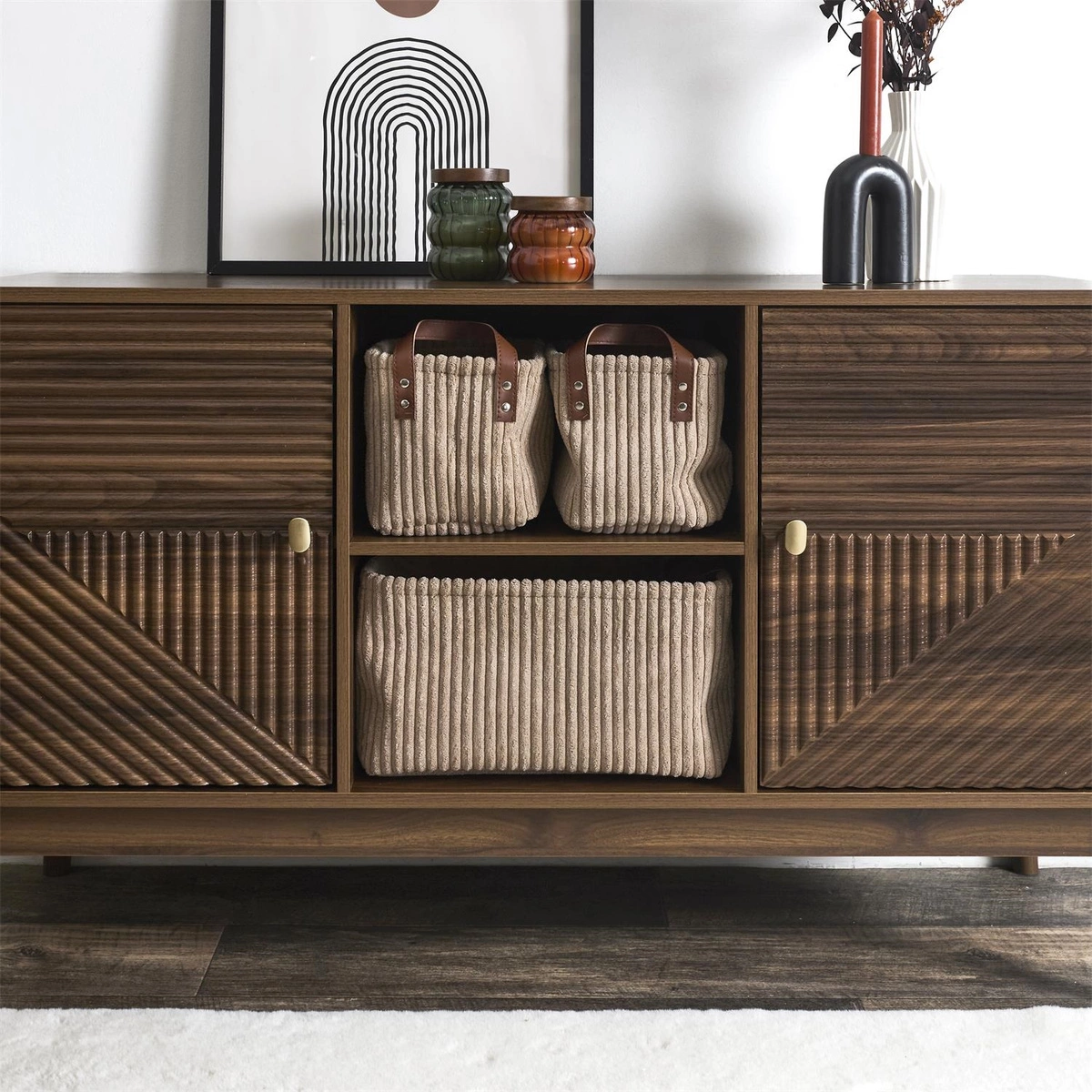 Zestaw 3 koszy w tkaninie sztruksowej to idealna dekoracja jak i element do organizacji rpzestrzeni. Wymiary duzego kosza: 20x36x26cm i dwa mniejsze o wymiarze 16x24x19cm