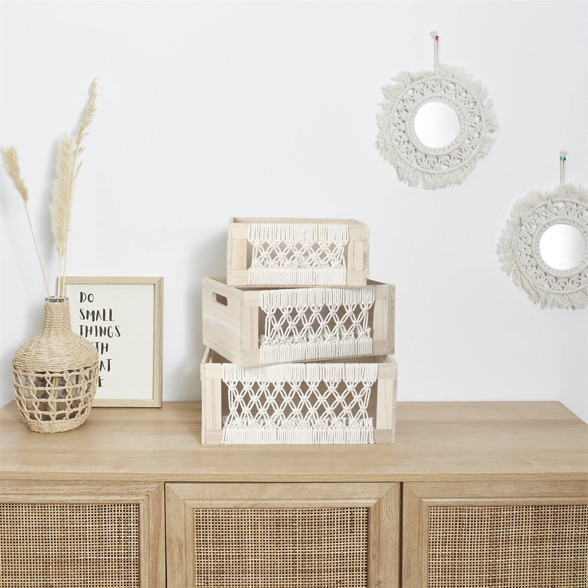 Zestaw 3 pudełek w stylu boho to ciekawe polączenie drewna oraz plecionki. Jeden bok kżdego z pudełek wykonany został z plecionego sznurka, który dodaje stylowego wyglądu. Materiał; drewno paulownia oraz bawełniany sznurek. Wymiary pudełek: duże: 35 x 25,5 x 15 cm średnie: 30 x 23,5 x 12 cm małe: 25,5 x 20 x 11 cm Pudełka sztaplują się.Potrzebujesz pomocy? Masz pytania?Zadaj pytanie a my odpowiemy niezwłocznie, najciekawsze pytania i odpowiedzi publikując dla innych.