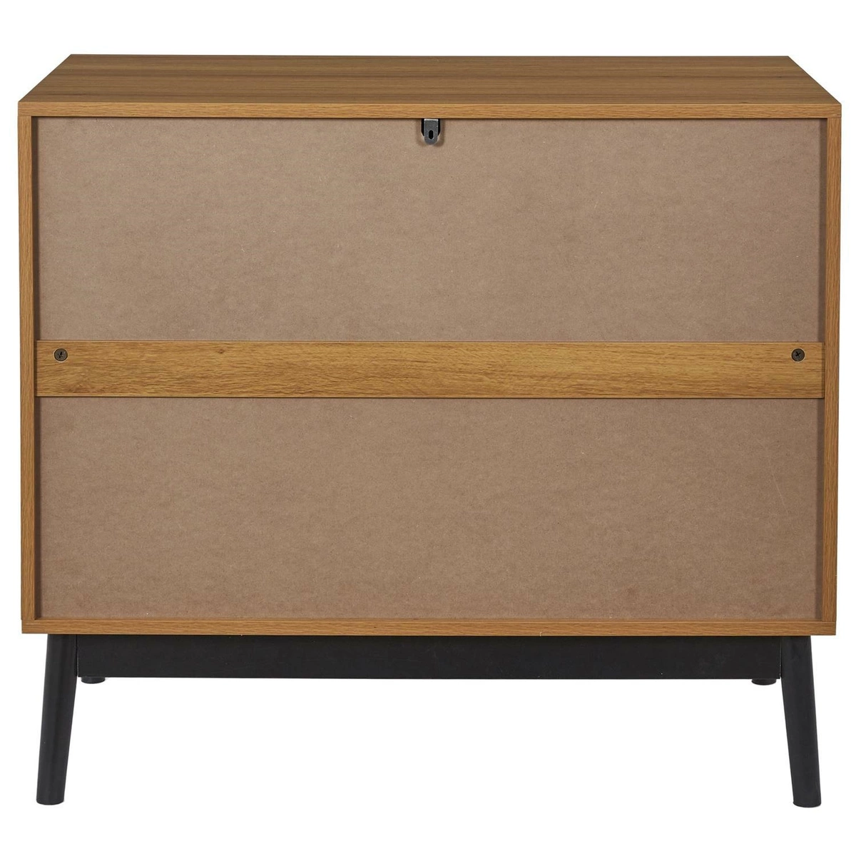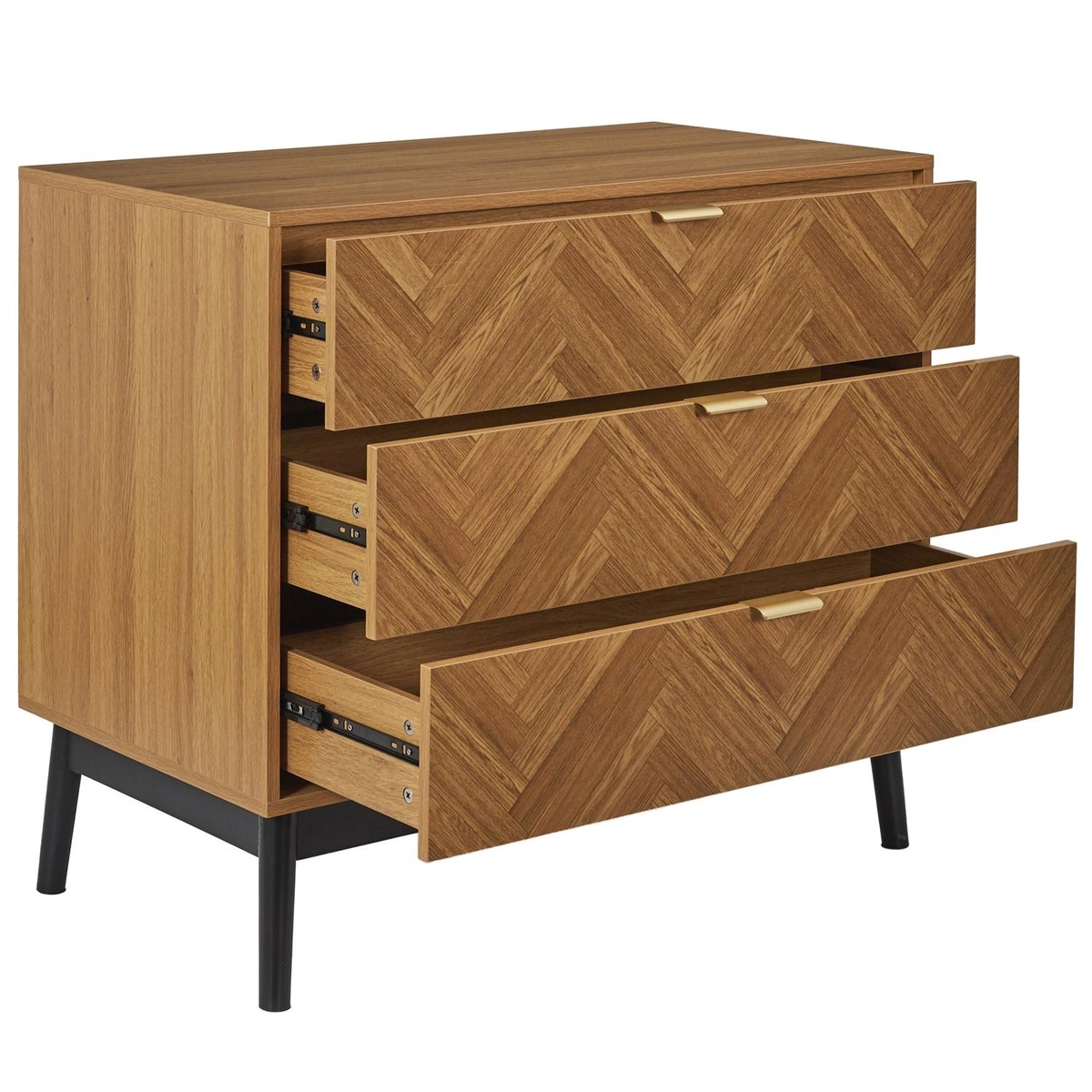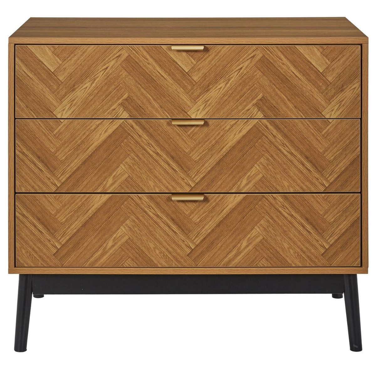 Komoda Felix to połączenie stylu retro z nowoczesnymi rozwiązaniami. Nogi mebla lekko rozchodzące się na zewnątrz nawiązują do stylu skandynawskiego. Komoda to połączenie ciekawych frontów w jodełkę oraz czarnych prostych nóg. Komoda wyposażona jest w 3 szuflady na szynach kulkowych. Uchwyty to polakierowane na złoty kolor metalowe rączki. Konsola wymaga montażu. Waga 33kg Materiał: nogi drewno sosnowe polakierowane na czarno Korpus i fronty: płyta wiórowa ozdobiona okleiną imitującą dąb Max. obciążenie blatu 30kg