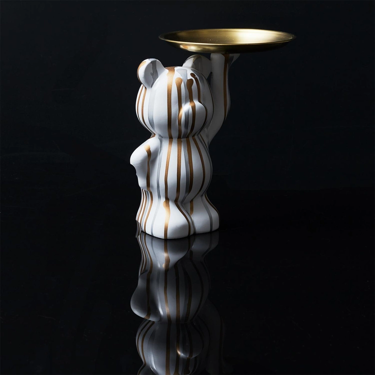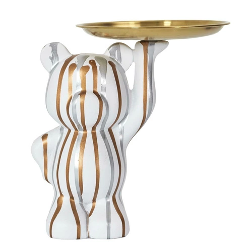 Figurka dekoracyjna przedstawiająca misia trzymającego złotą tacę, która pełni funkcję zarówno ozdobną, jak i praktyczną. Wykonana z wysokiej jakości tworzywa sztucznego, figurka została pokryta eleganckim, matowym wykończeniem w kolorze białym, ozdobionym nieregularnymi, metalicznymi paskami w odcieniach złota i srebra, co nadaje jej nowoczesny, artystyczny wygląd. Złota taca umieszczona na podniesionej łapie misia doskonale sprawdzi się do przechowywania drobnych przedmiotów, takich jak biżuteria, klucze, czy ozdoby, dodając wnętrzu wyrafinowanego charakteru. Figurka świetnie wpasuje się w aranżacje nowoczesne, glamour, a także eklektyczne, stanowiąc unikalny akcent na komodzie, stoliku kawowym czy toaletce. Waga produktu (g): 300Potrzebujesz pomocy? Masz pytania?Zadaj pytanie a my odpowiemy niezwłocznie, najciekawsze pytania i odpowiedzi publikując dla innych.