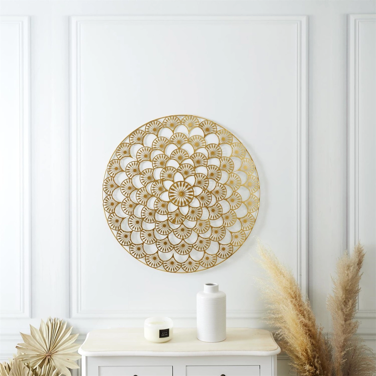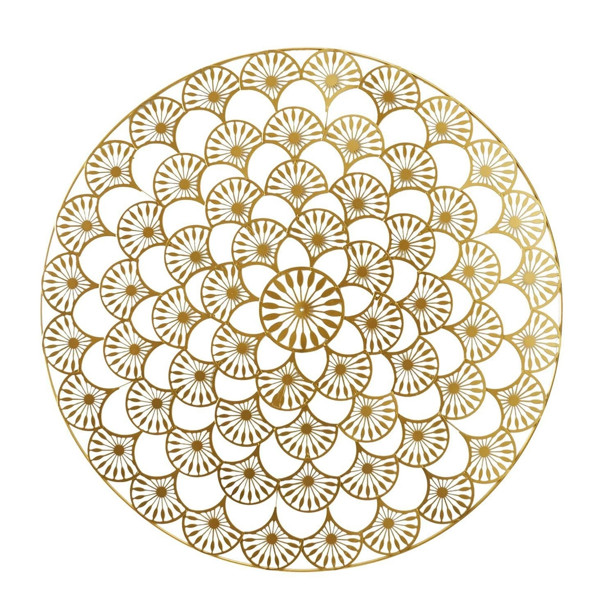 Metalowa dekoracja ścienna w kształcie mandali doda harmonii we wnętrzu i będzie jego wyjątkową ozdobą Okrągła, złota ozdoba o średnicy 70cm charakteryzuje się delikatnym, powtarzającym się wzorem, który dzięki ażurowej konstrukcji nie przytłacza. Lekka ozdoba sprawi, że zwykła pusta ściana nabierze charakteru. Waga: 1,25kg Wymiary opakowania:15,5x72,5x73cm, Max 8 szt w kartoniePotrzebujesz pomocy? Masz pytania?Zadaj pytanie a my odpowiemy niezwłocznie, najciekawsze pytania i odpowiedzi publikując dla innych.